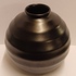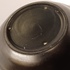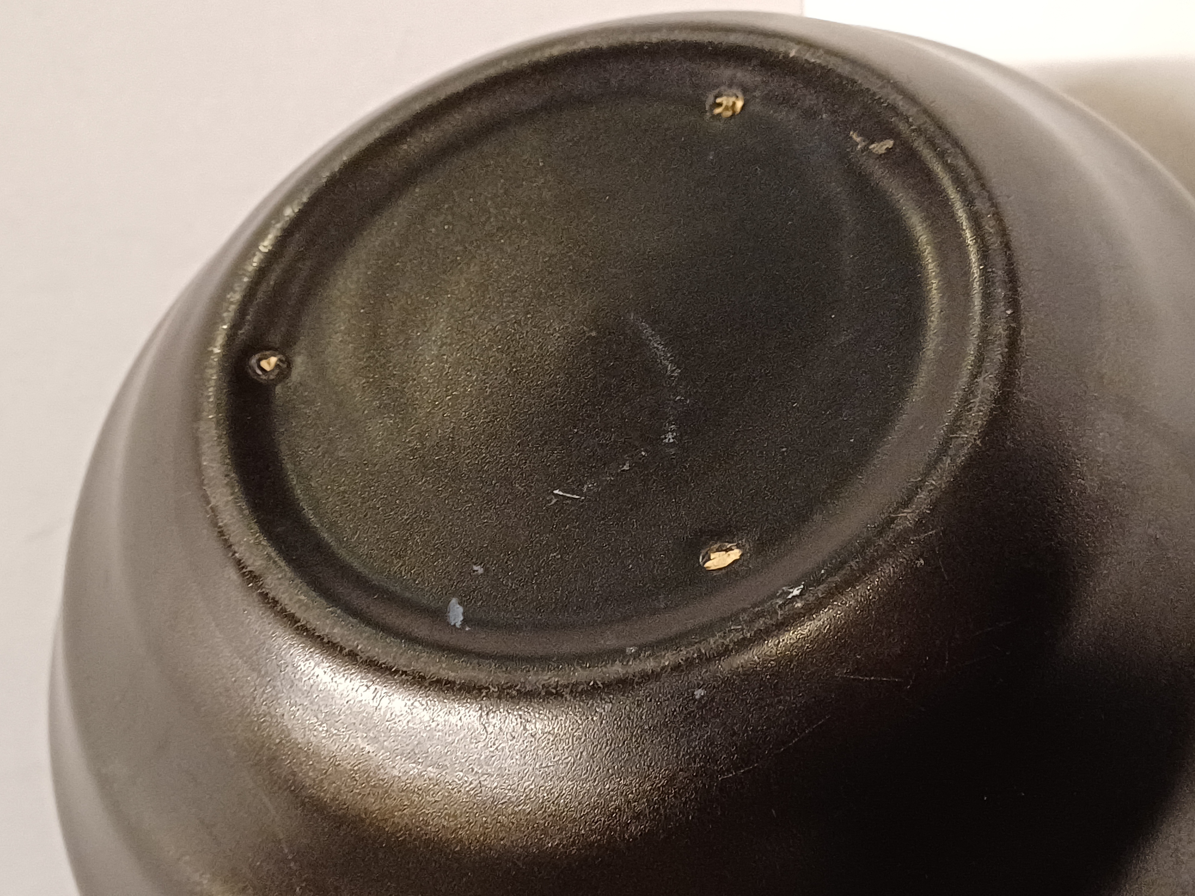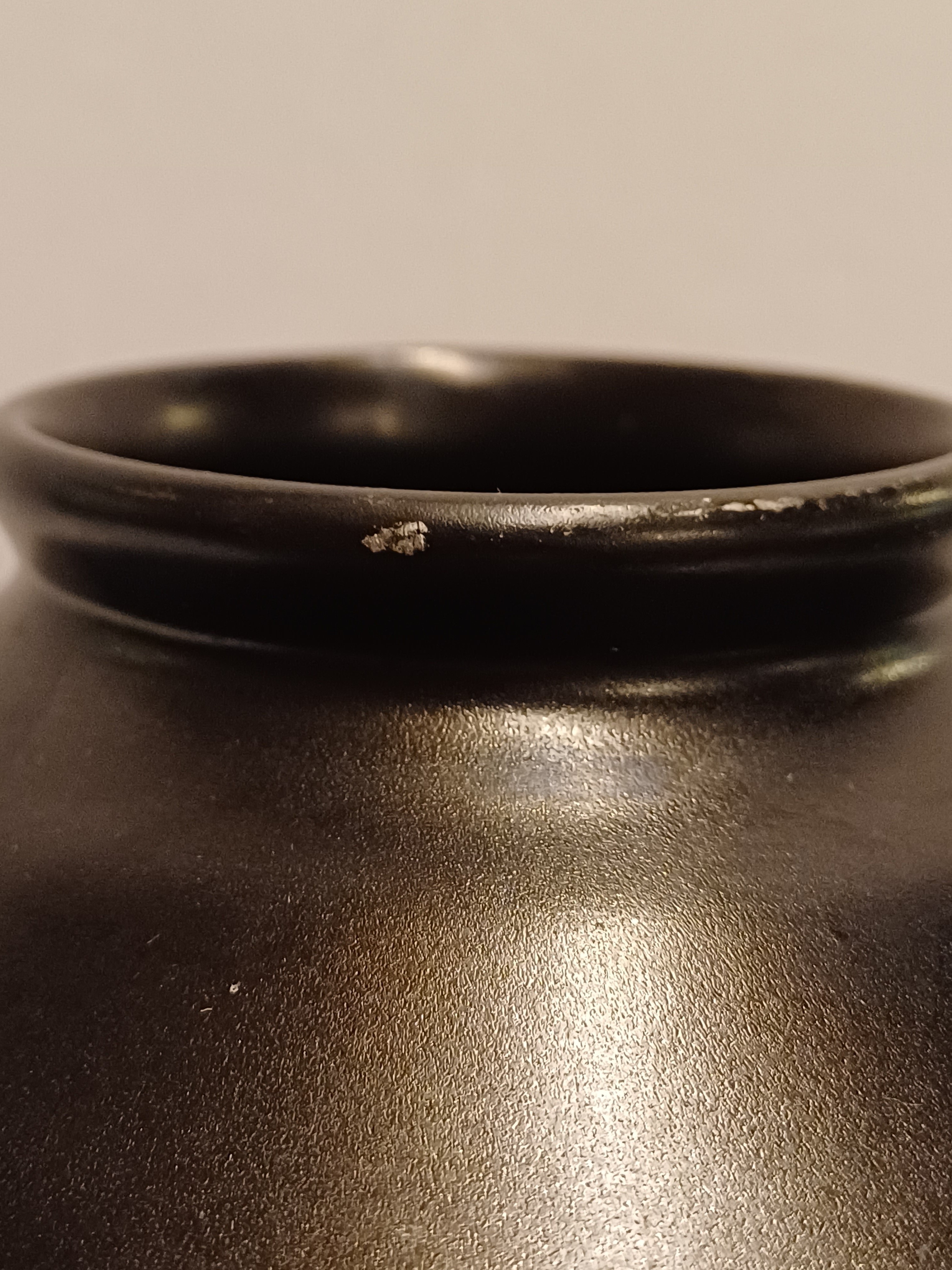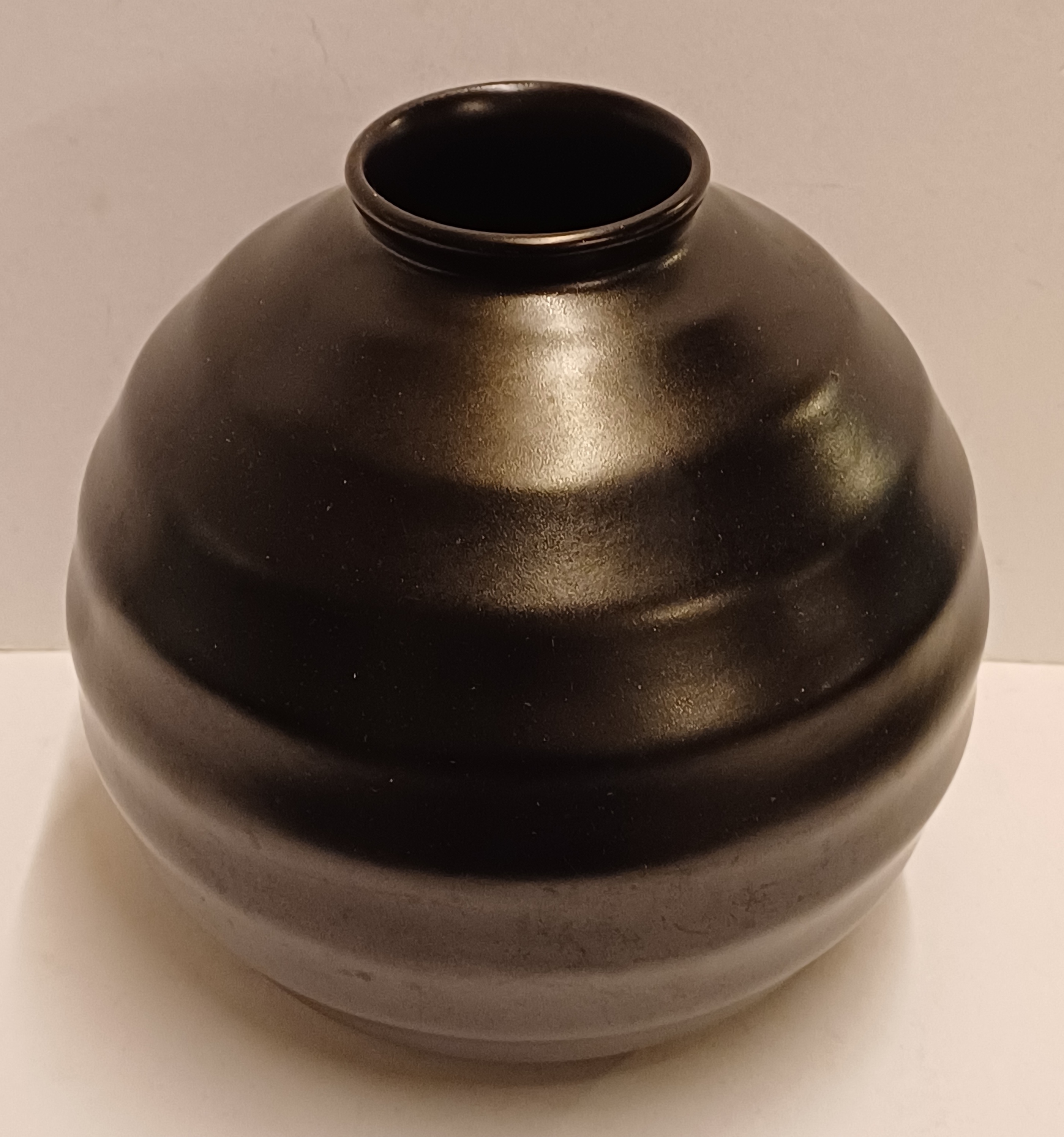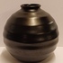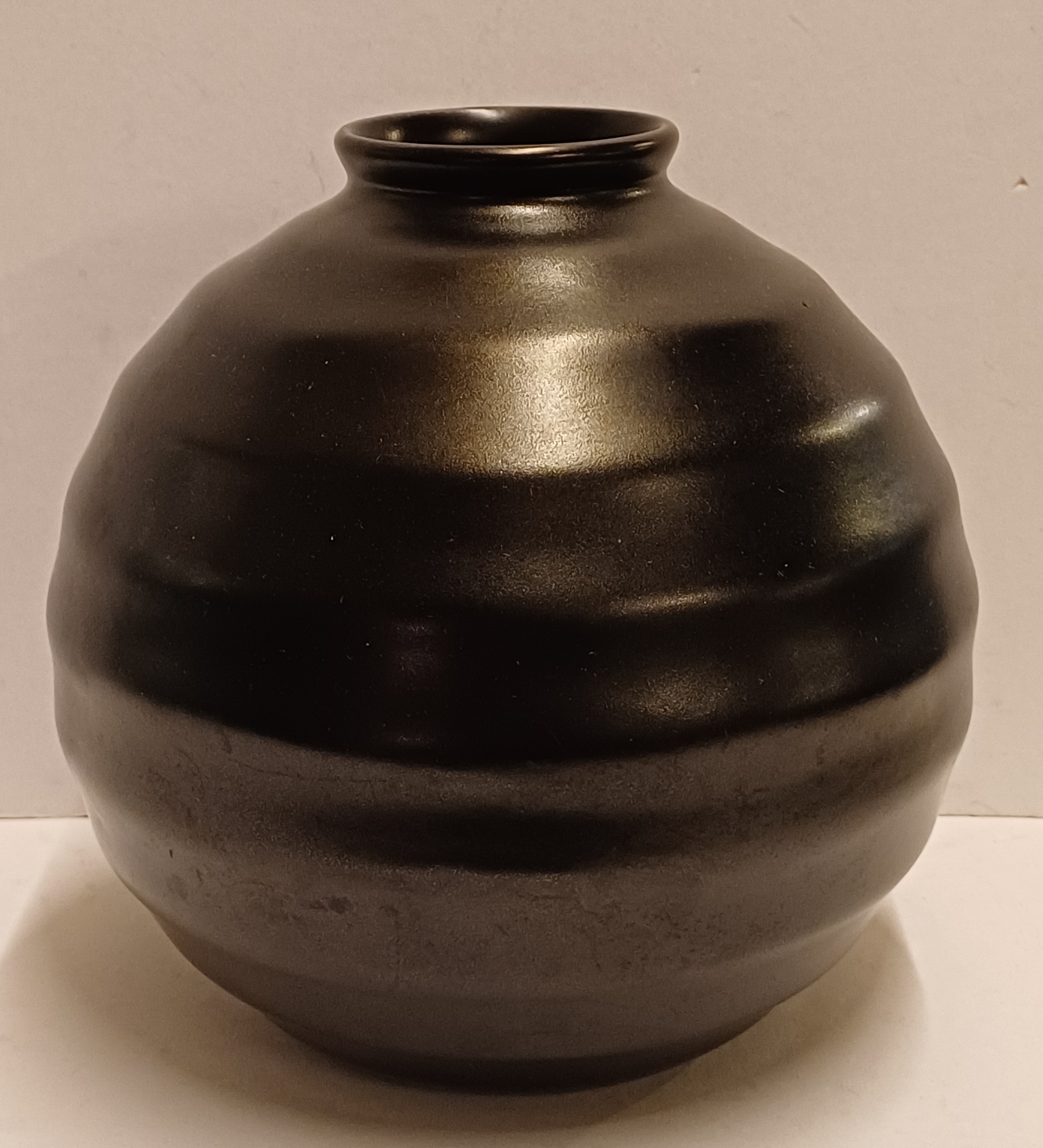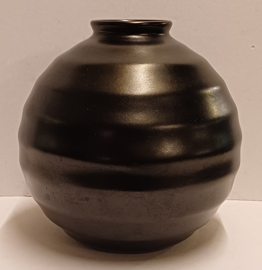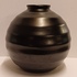 Vaso in ceramica piatta smaltata in nero opaco con bande orizzontali. Non firmato.