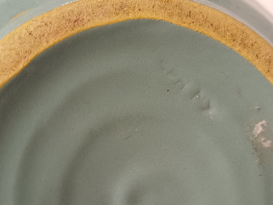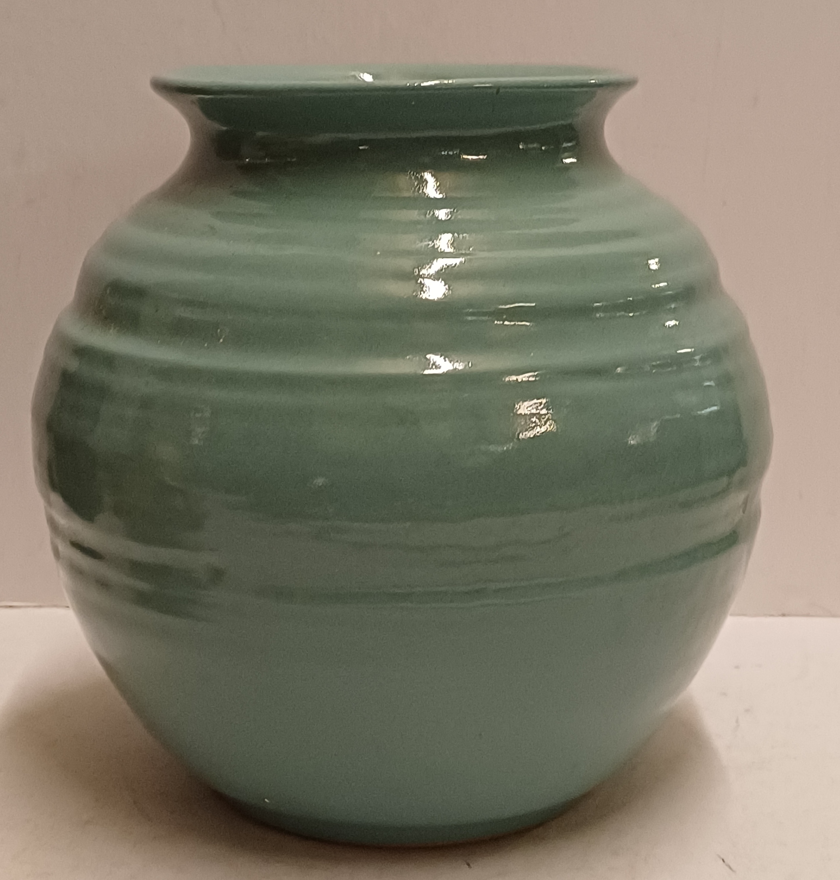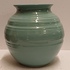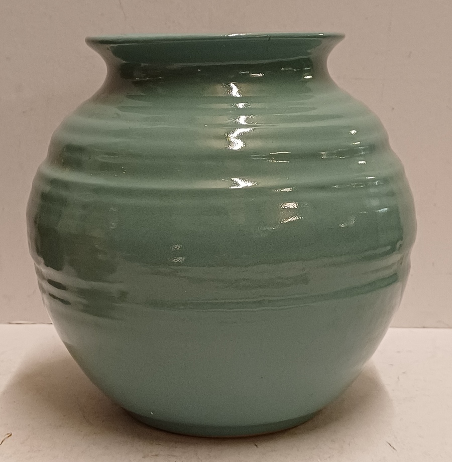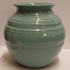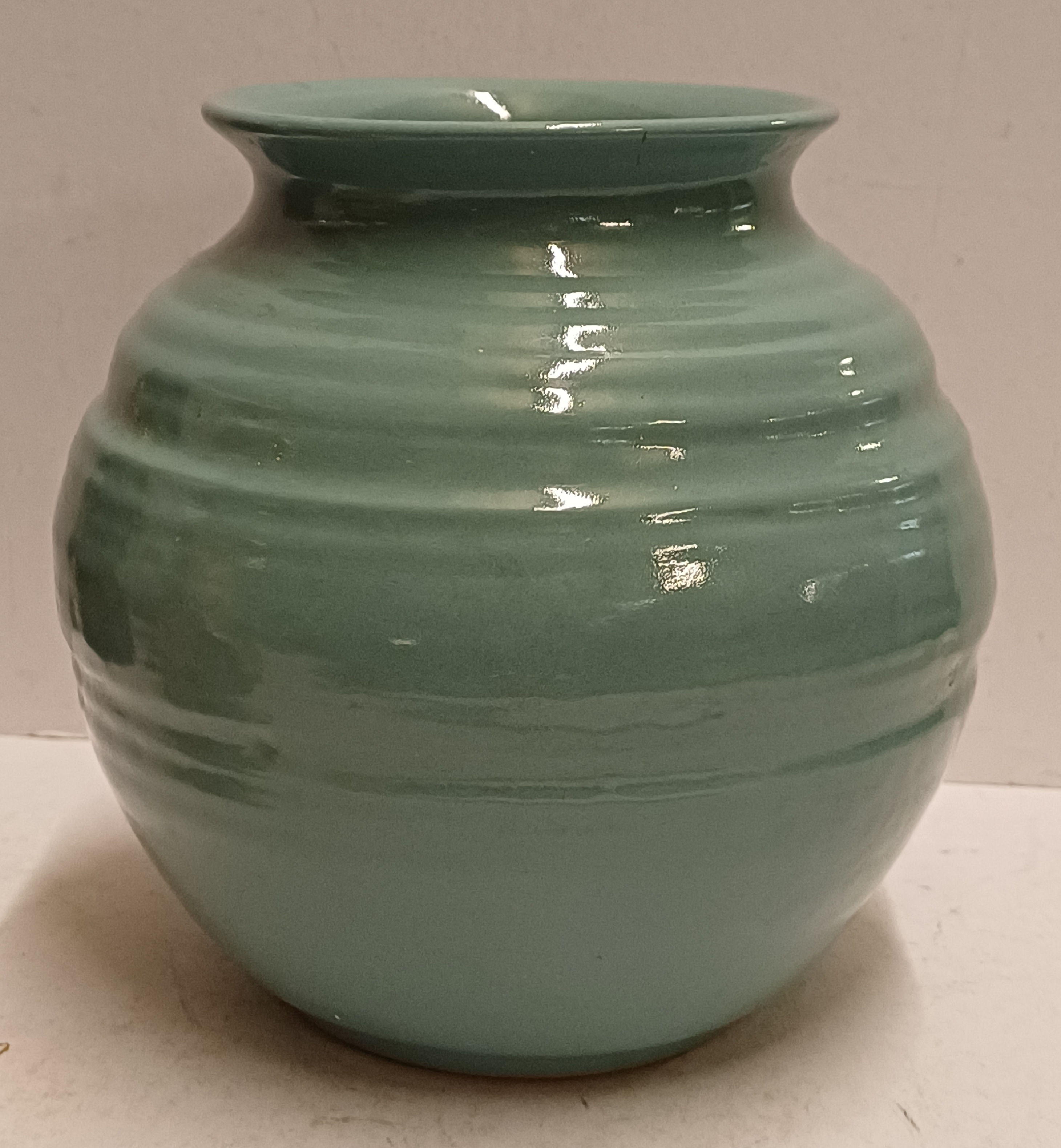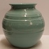 Vaasje met zeegroene glazuur. Ontwerp Wim Visser. Onderzijde met fabrieksmerk.