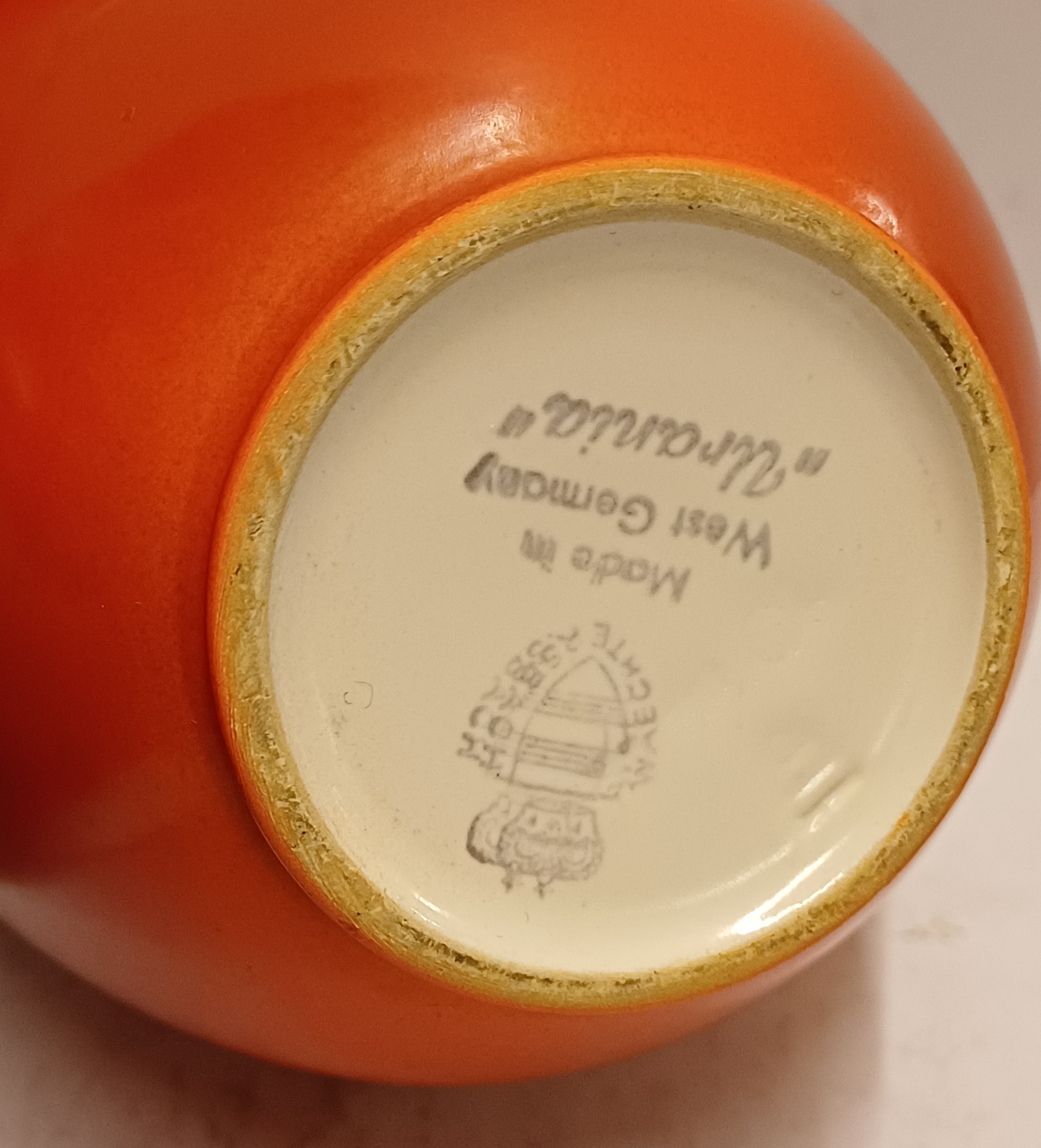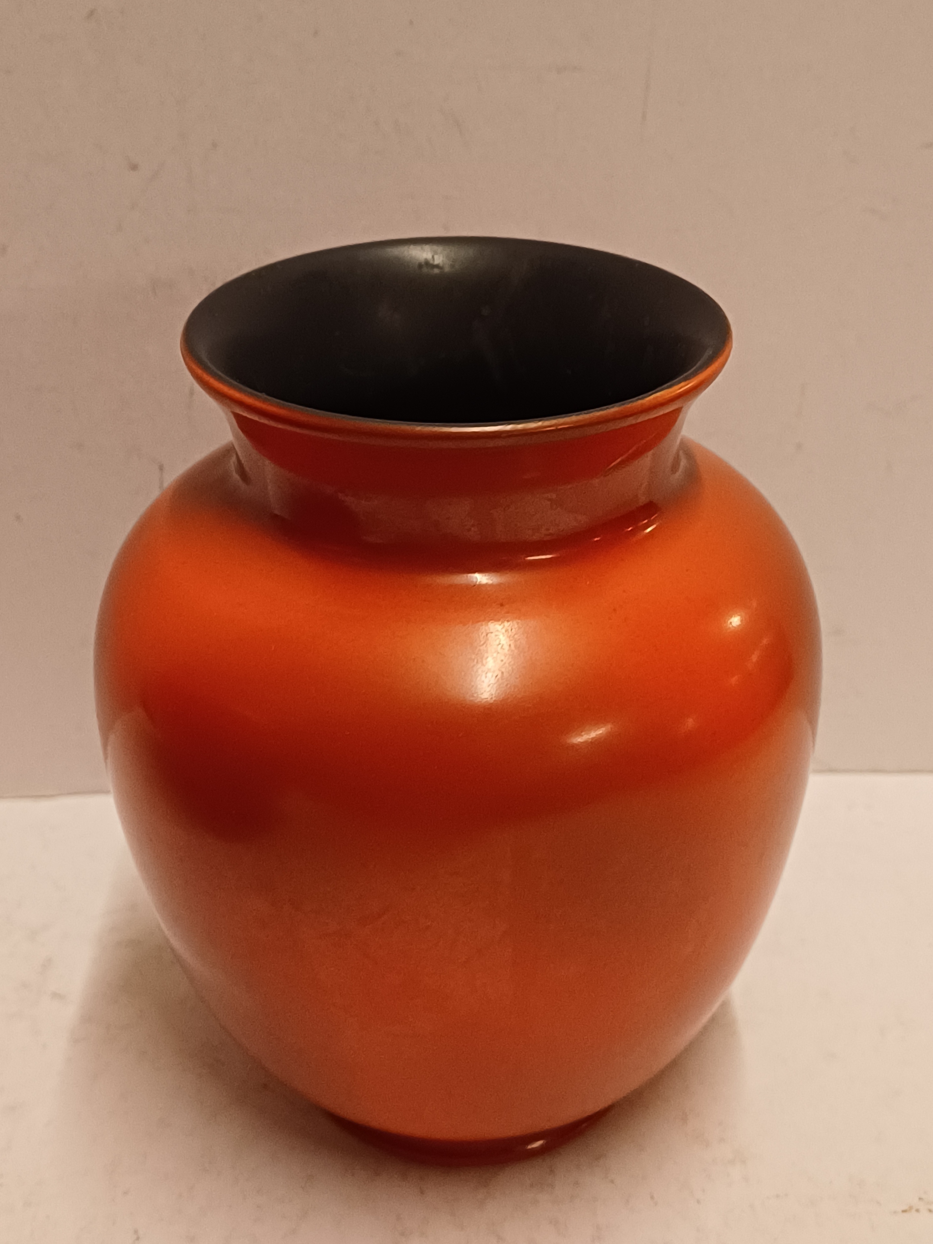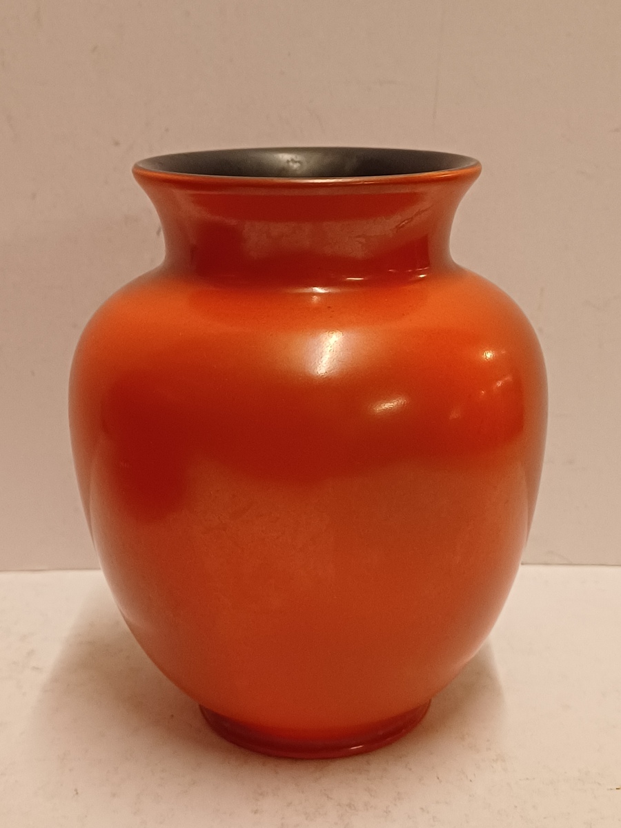 Vaas met rode spuitglazuur en zwarte binnenzijde. Decornaam Urania, onderzijde met fabrieksmerkGoed