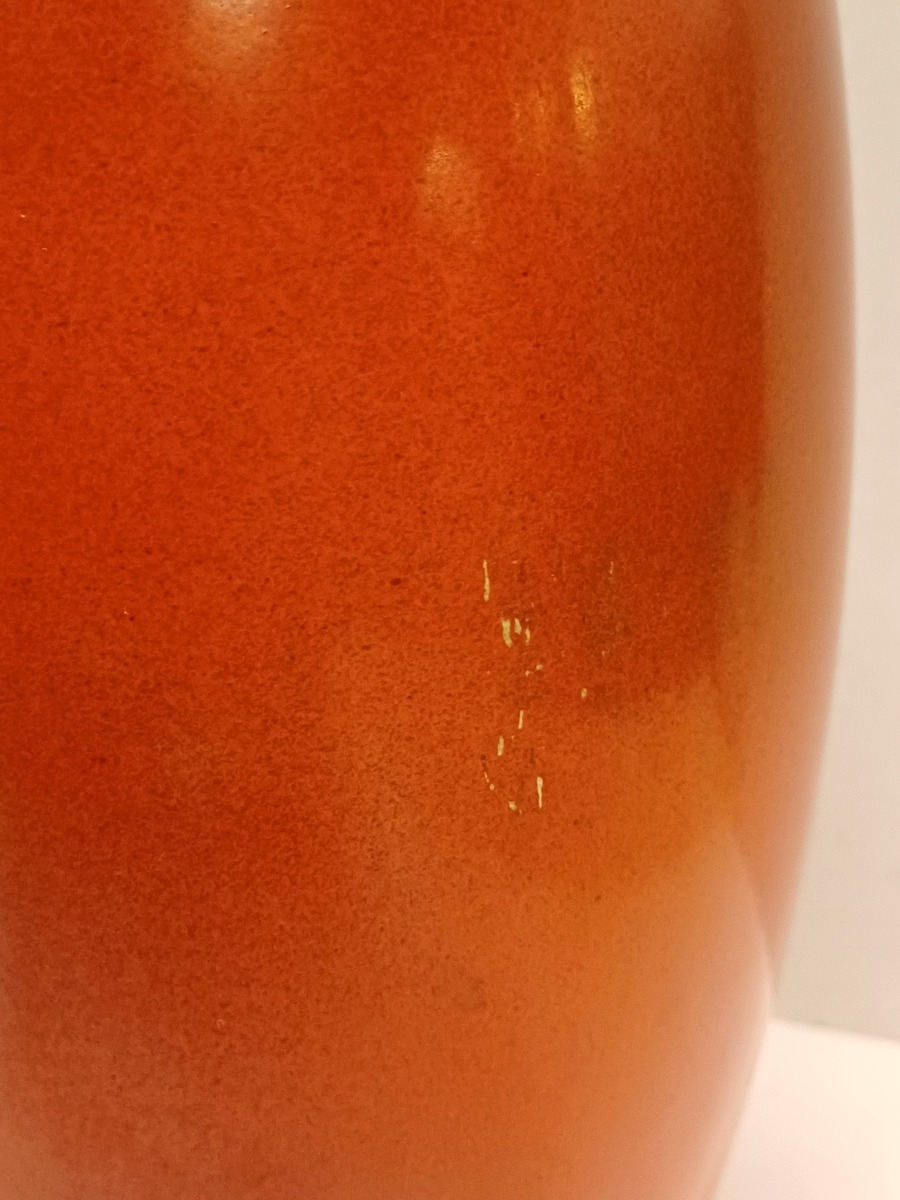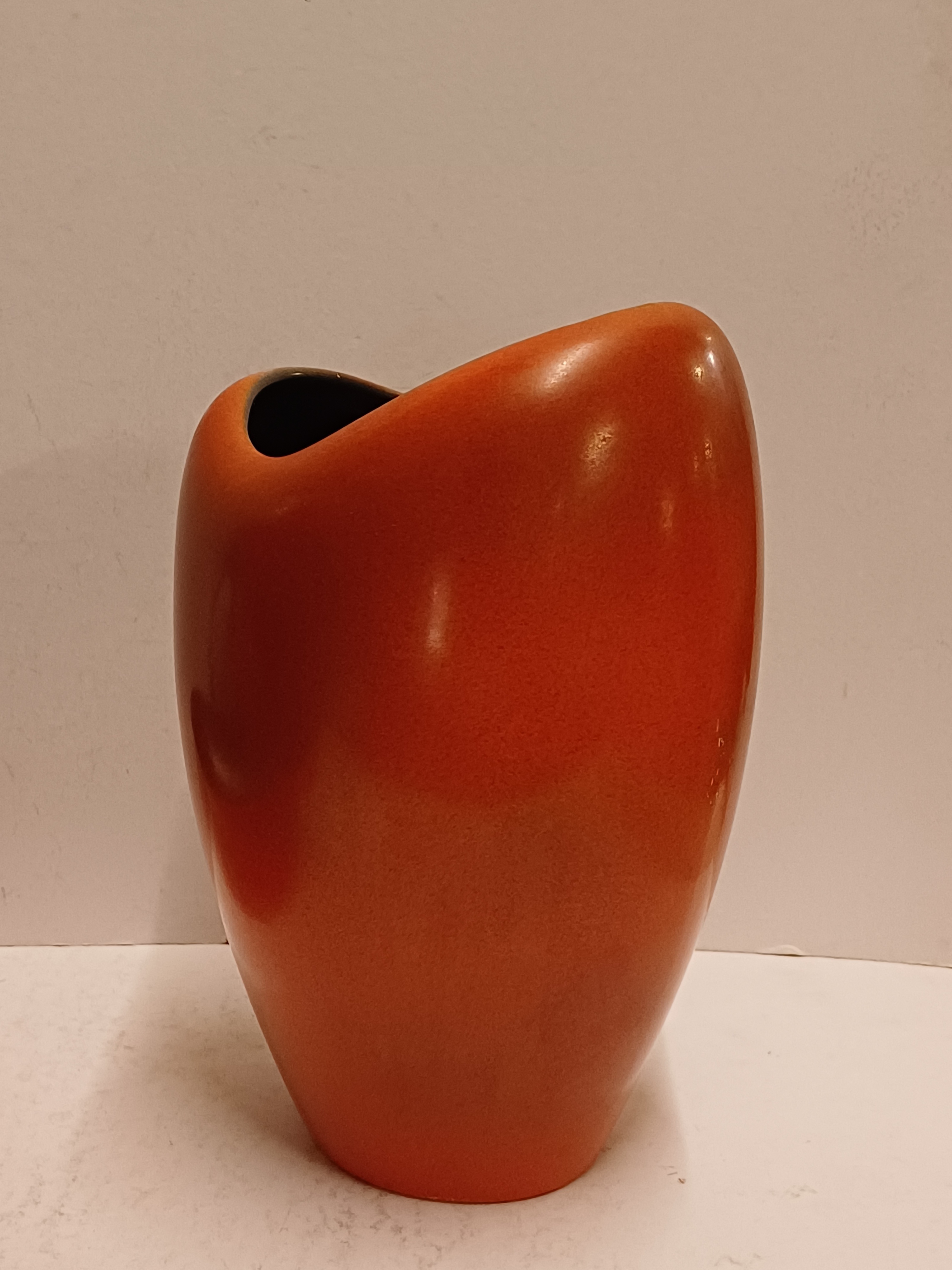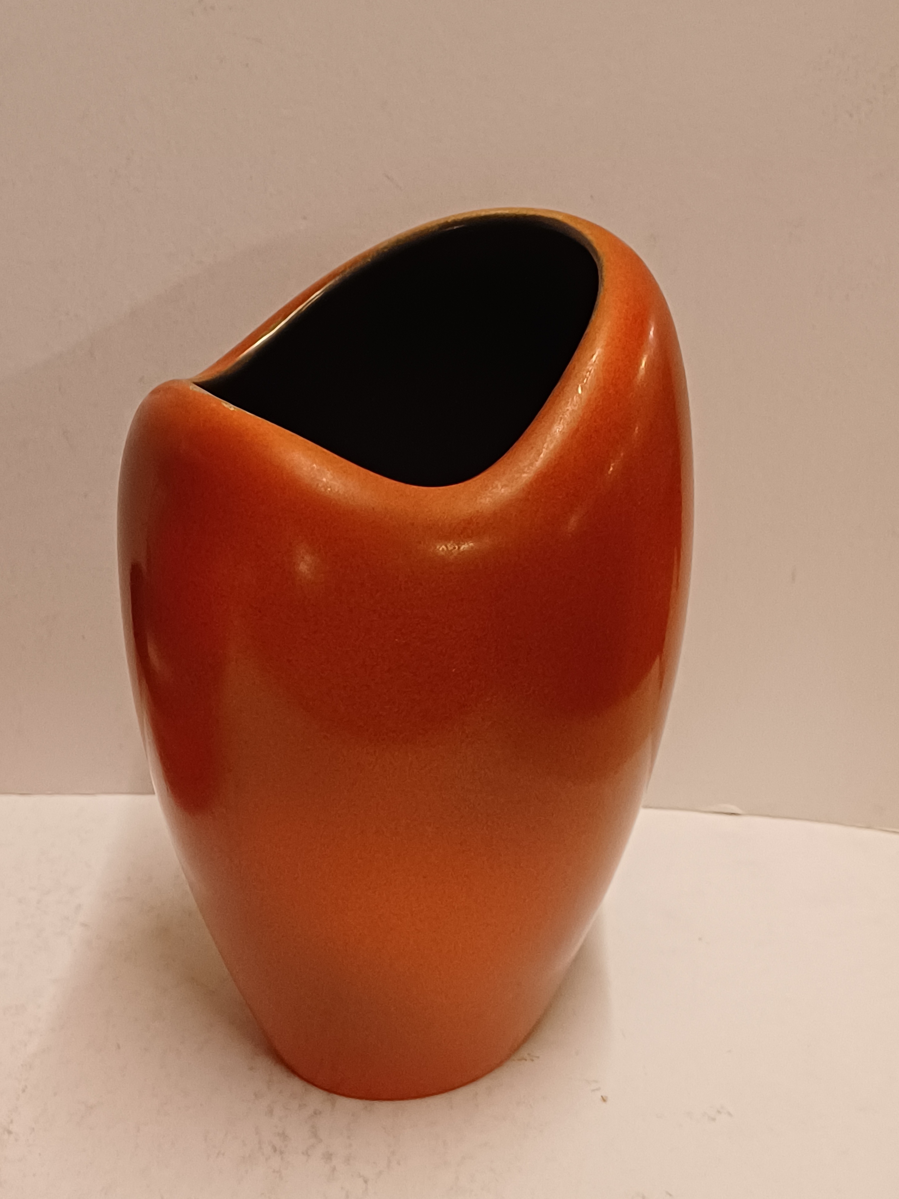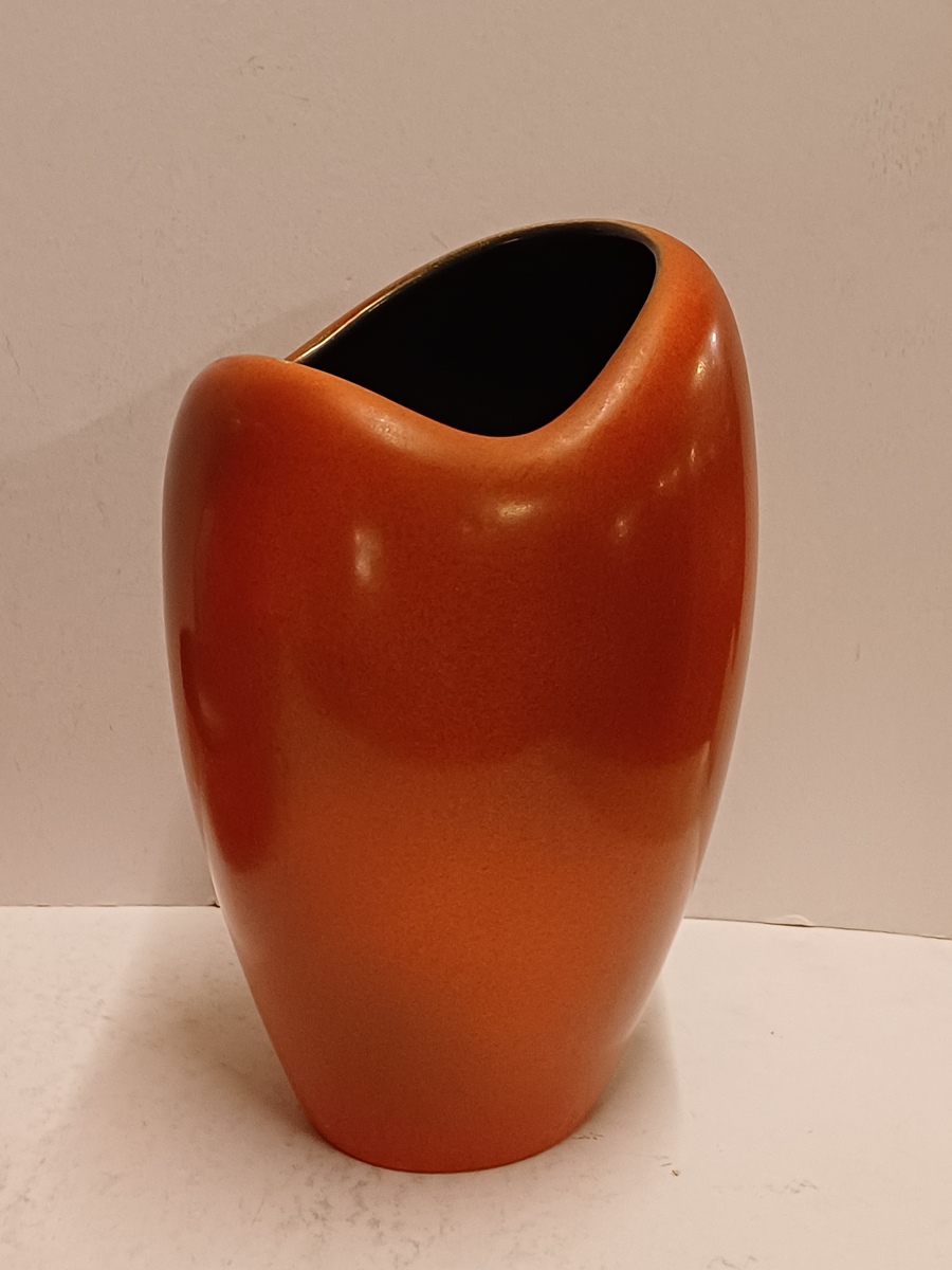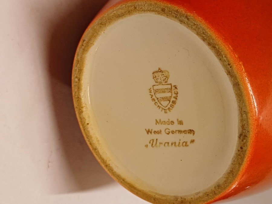Vaas met rode spuitglazuur en zwarte binnenzijde. Decornaam Urania, onderzijde met fabrieksmerk