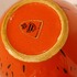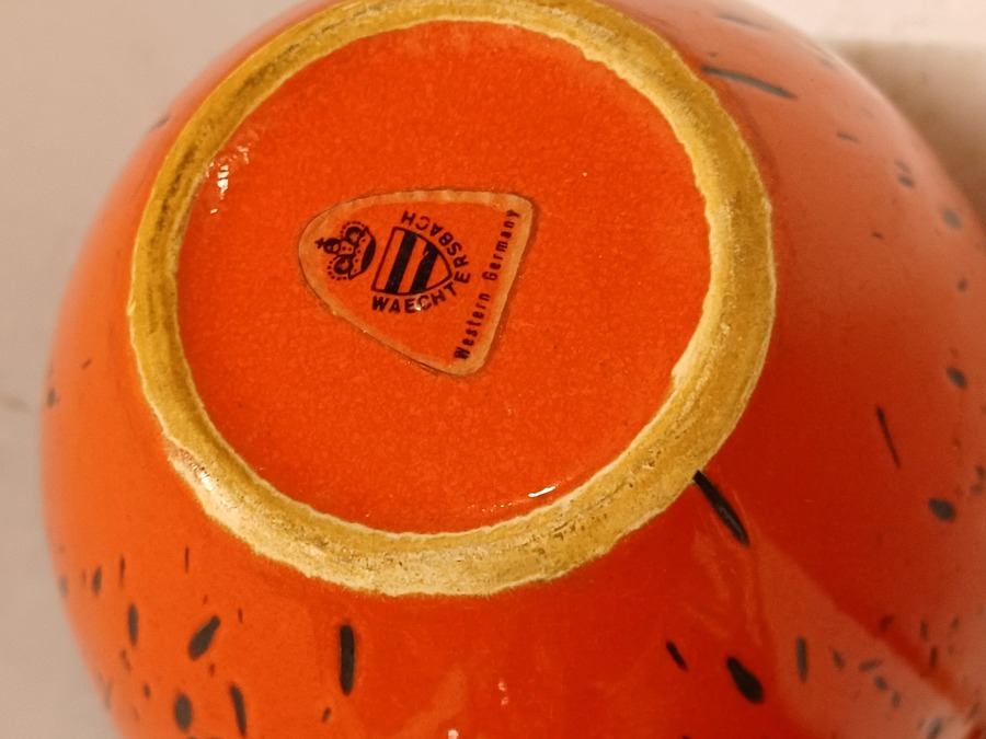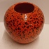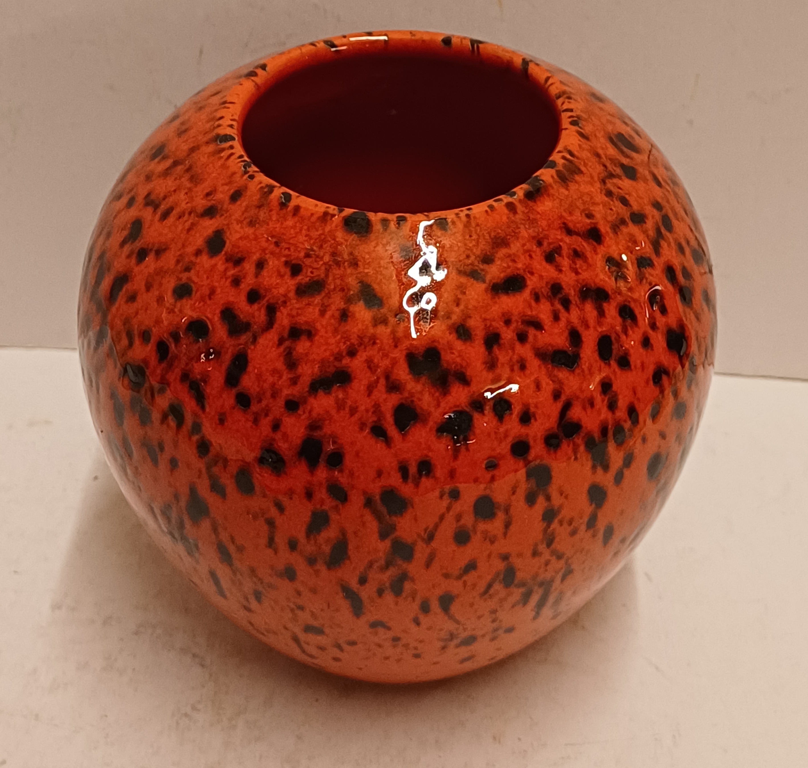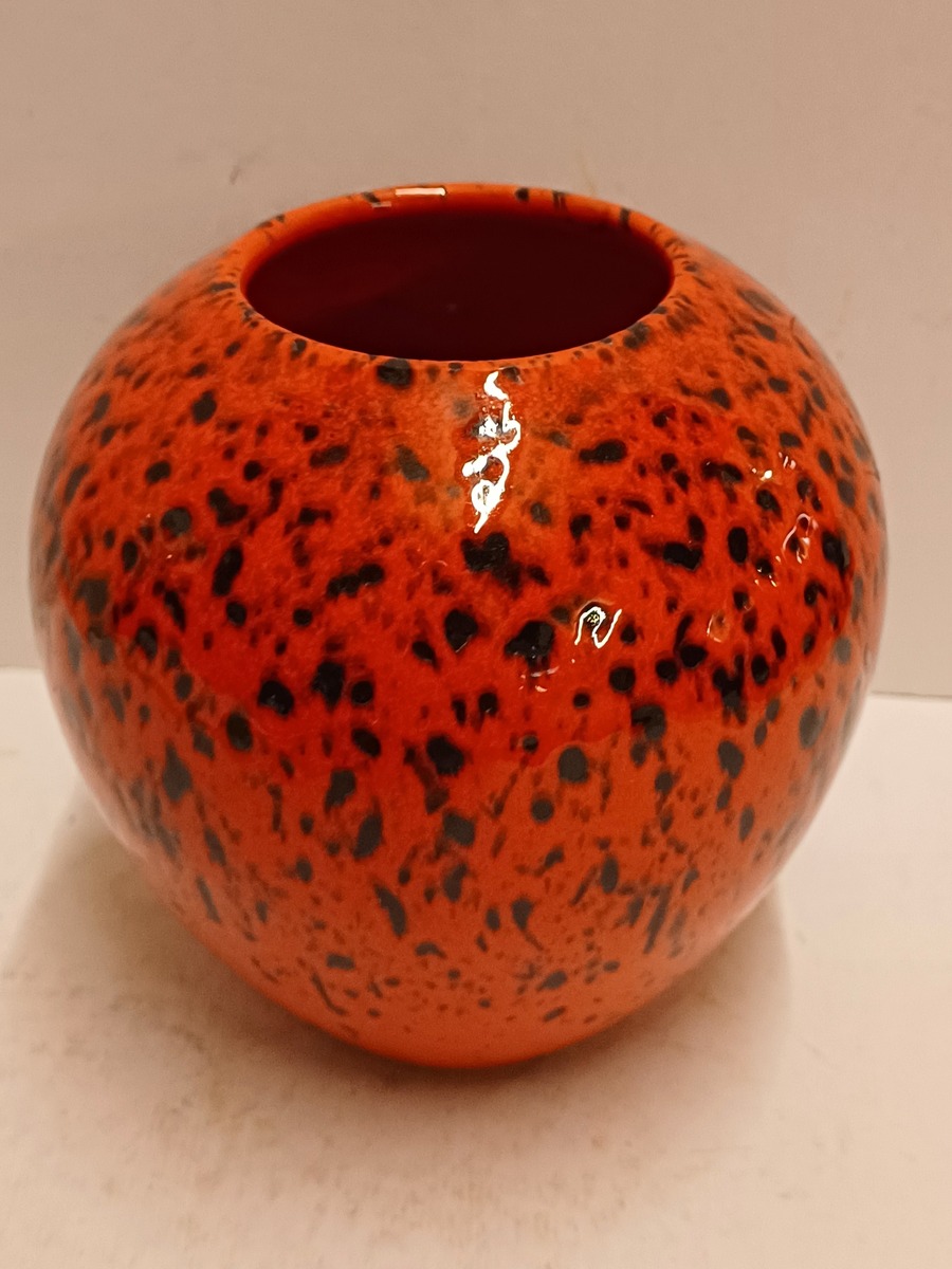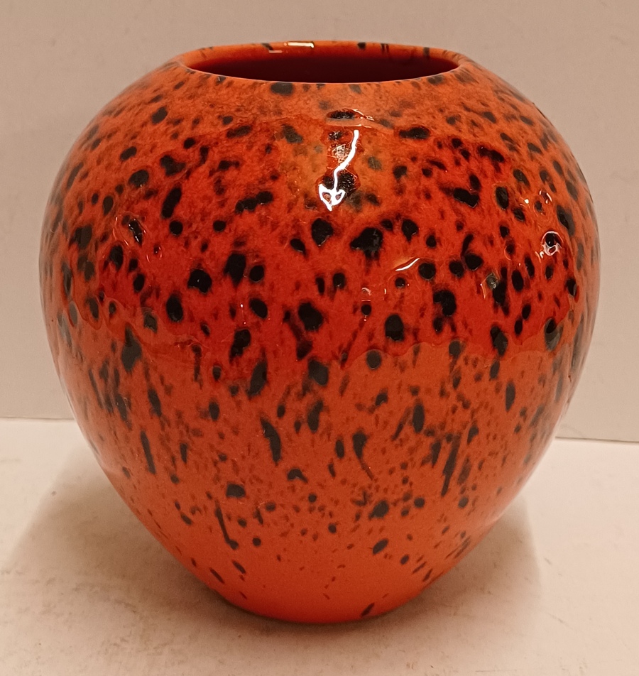 Gegoten aardewerken vaas met met rood zwart gevlekte glazuur. Onderzijde met fabrieksmerk sticker.