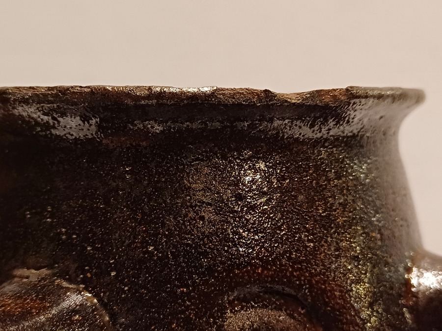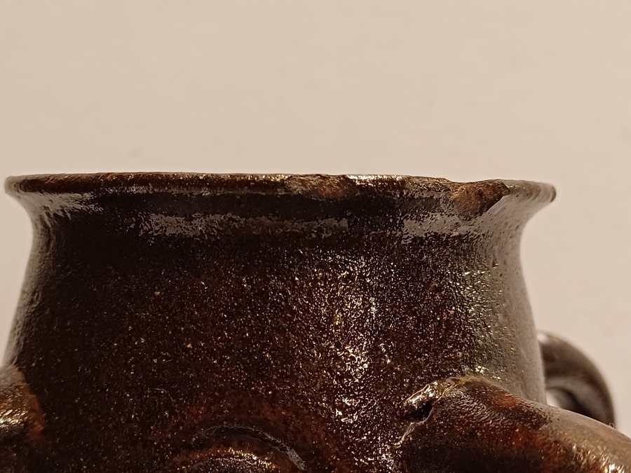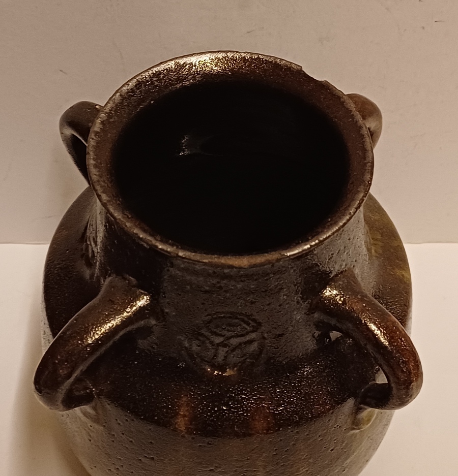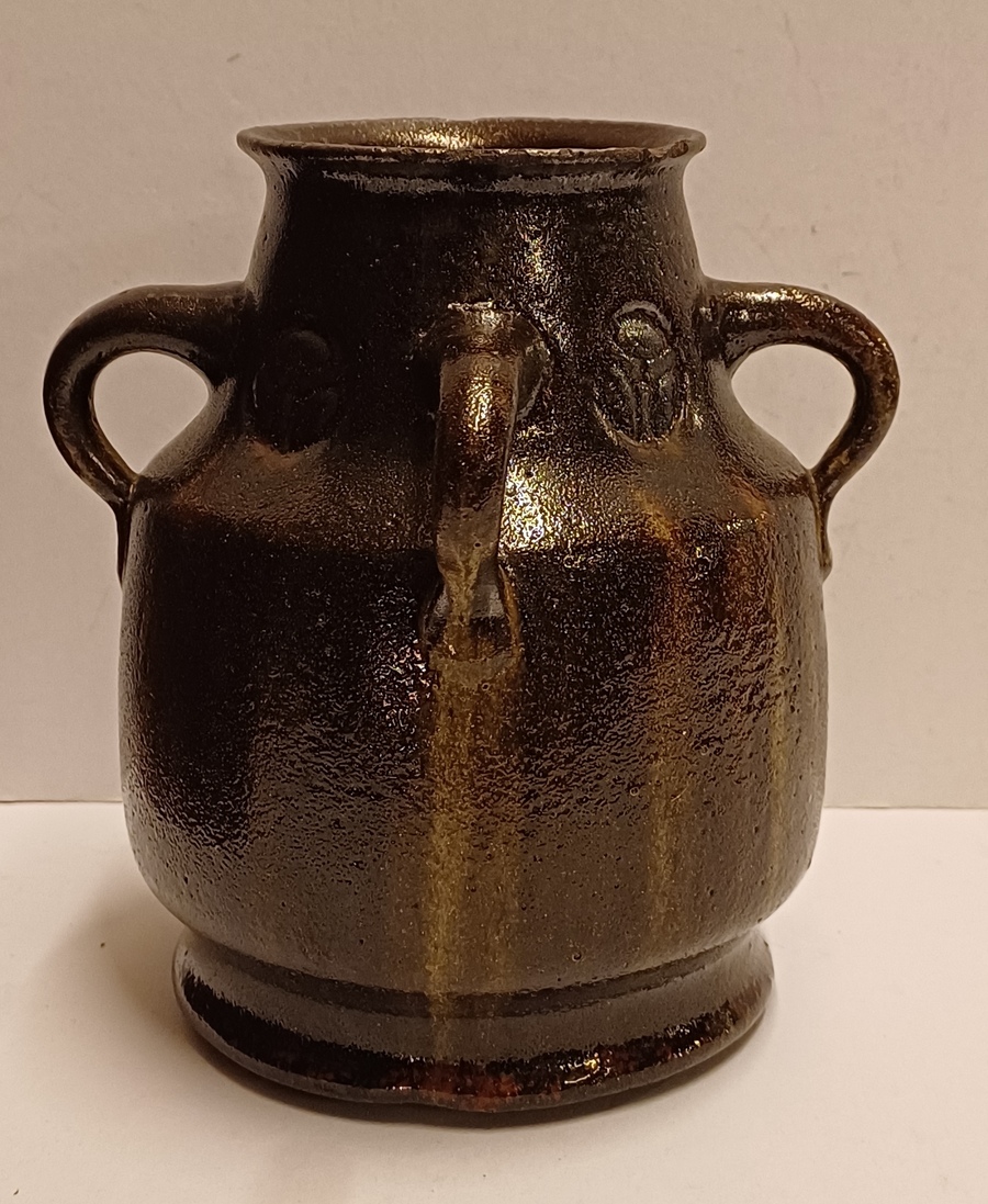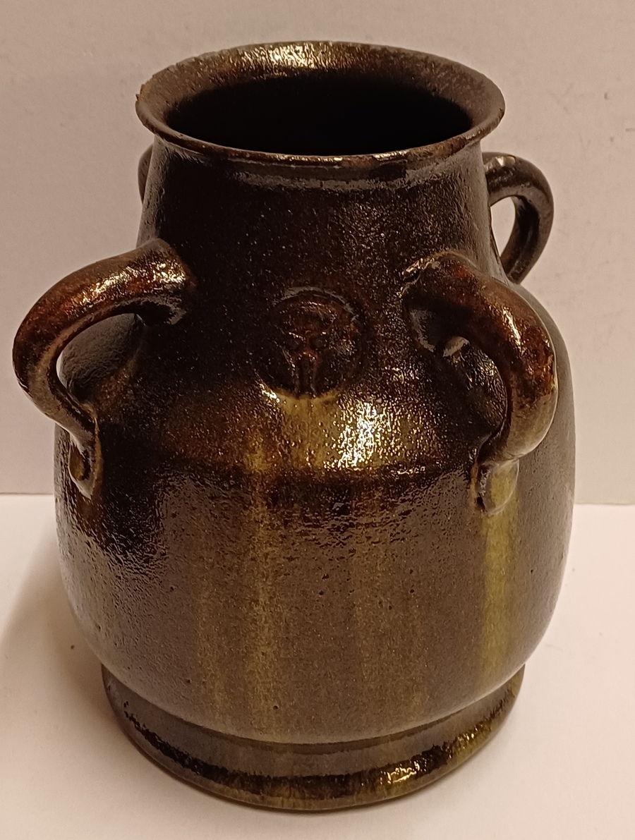 Vroege brouwer vaas met 4 oren en medaillon decoratie. Onderzijde onduidelijk merk.