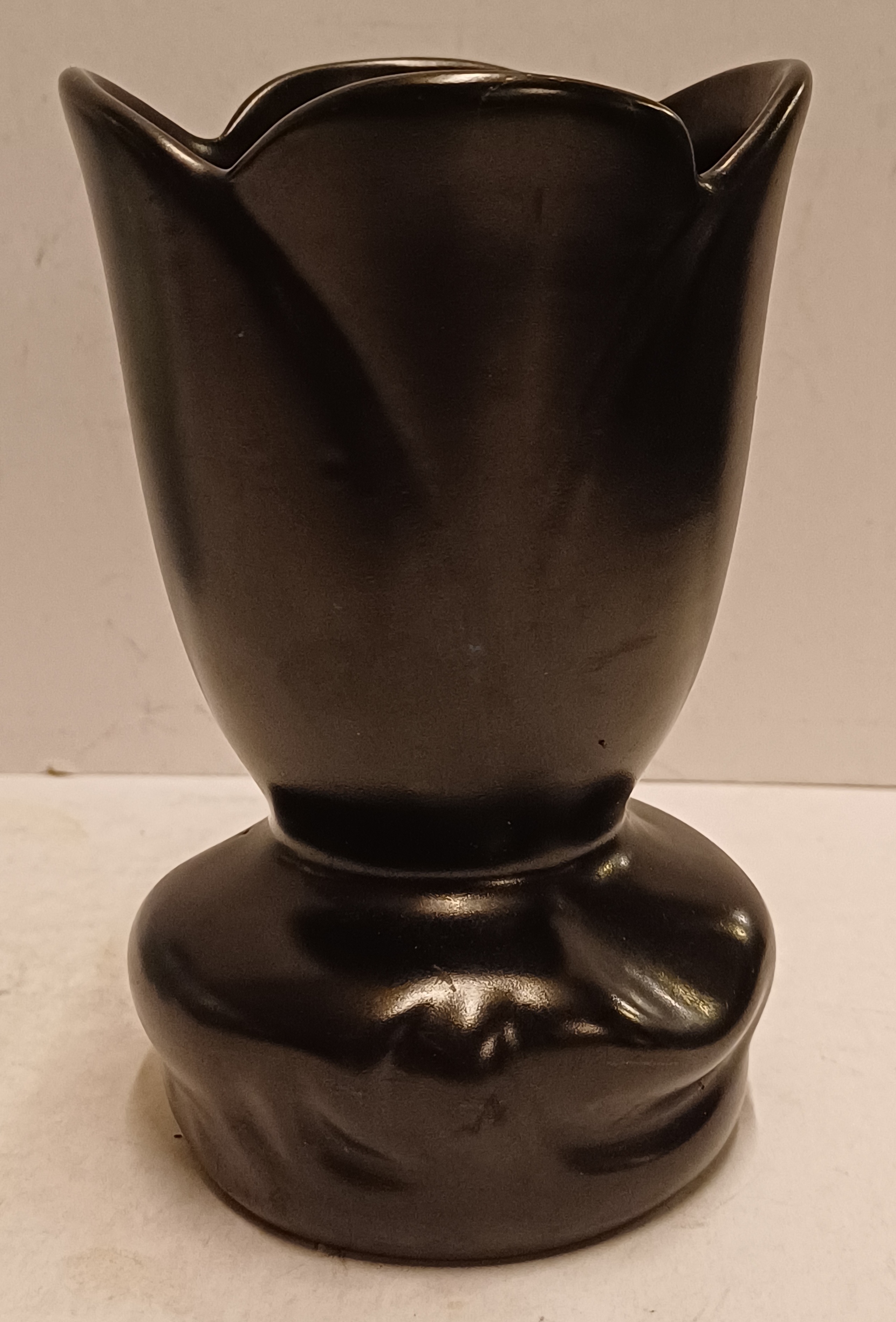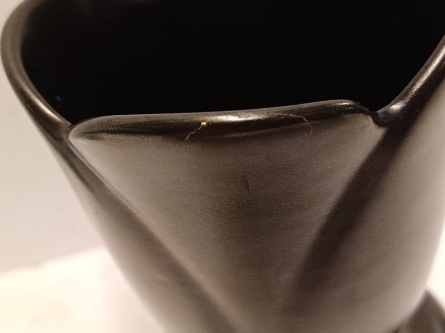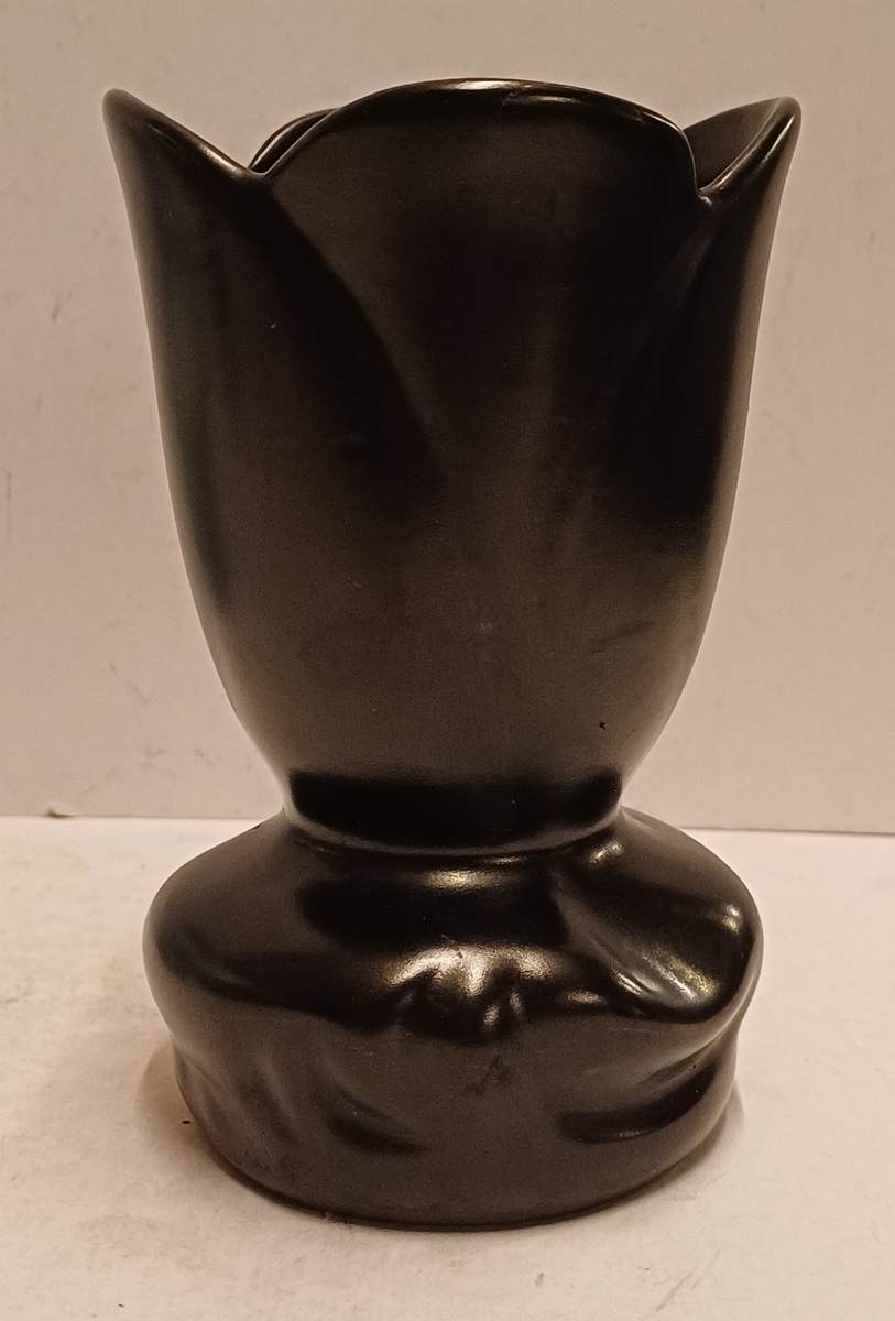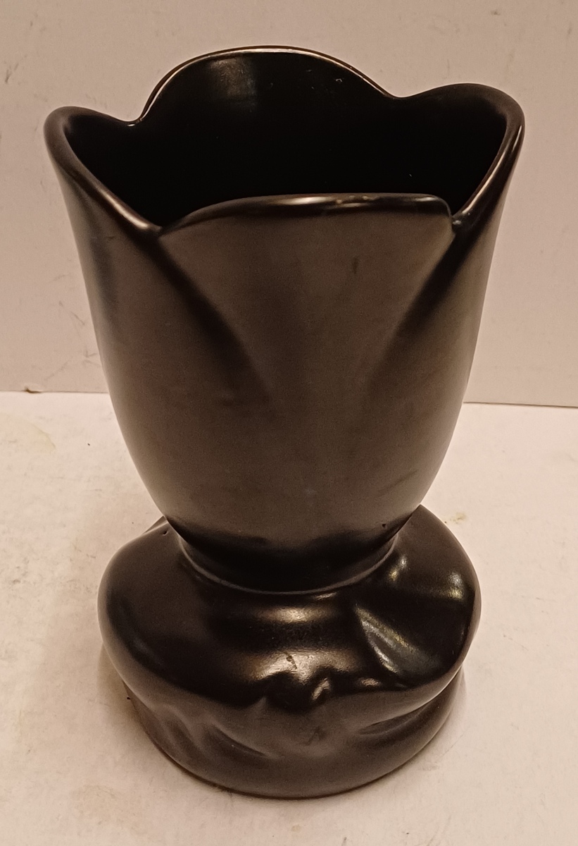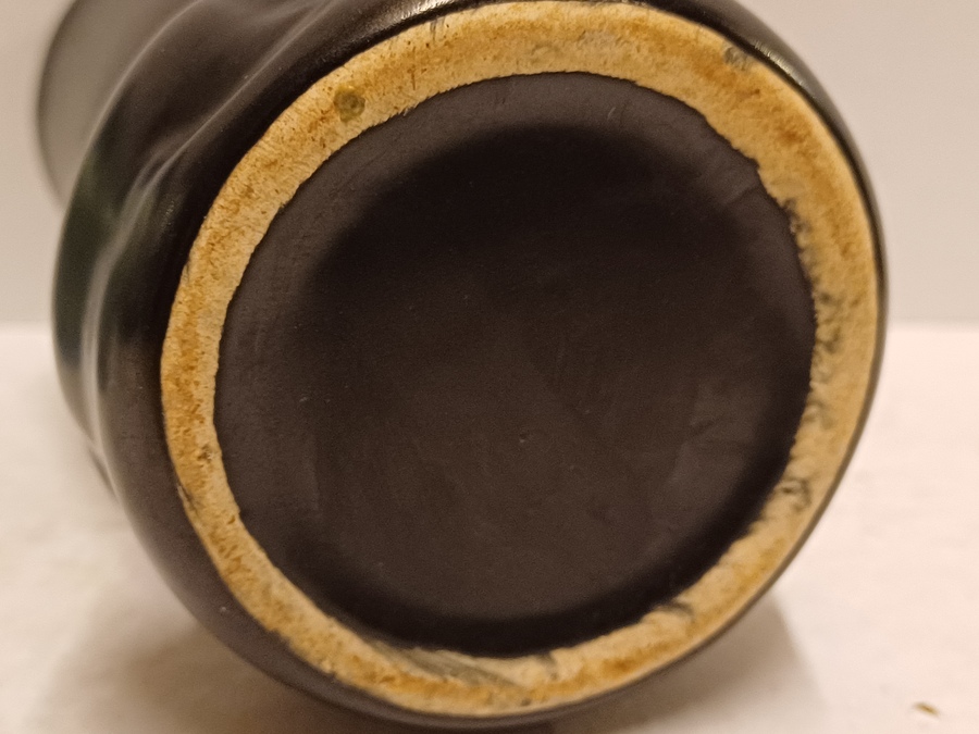 ~Zwart geglazuurd gegoten vaasje met zweepslag decor. Onderzijde niet gesigneerd.