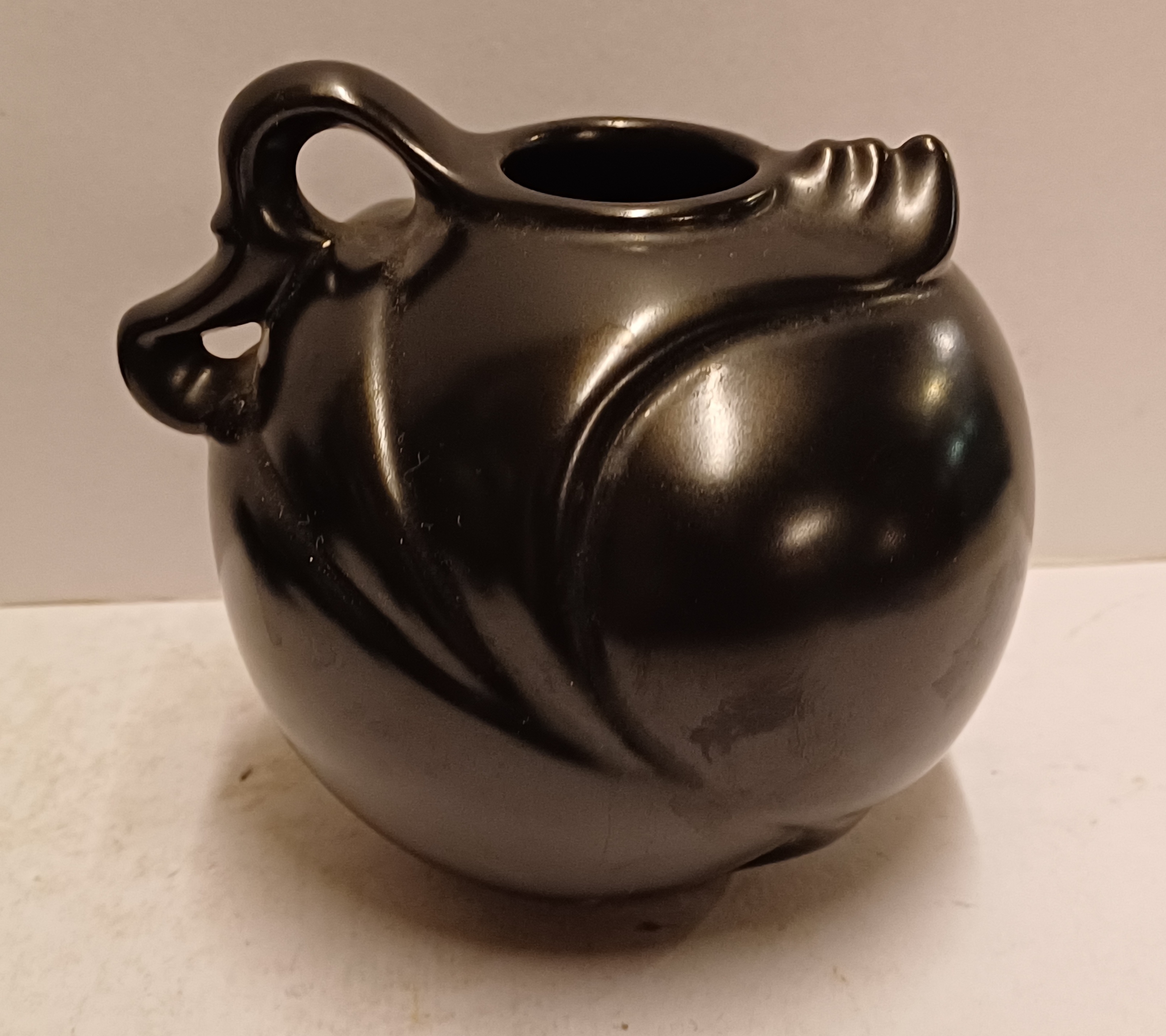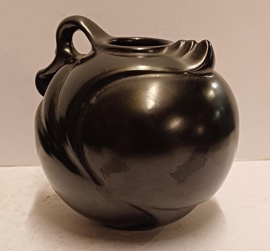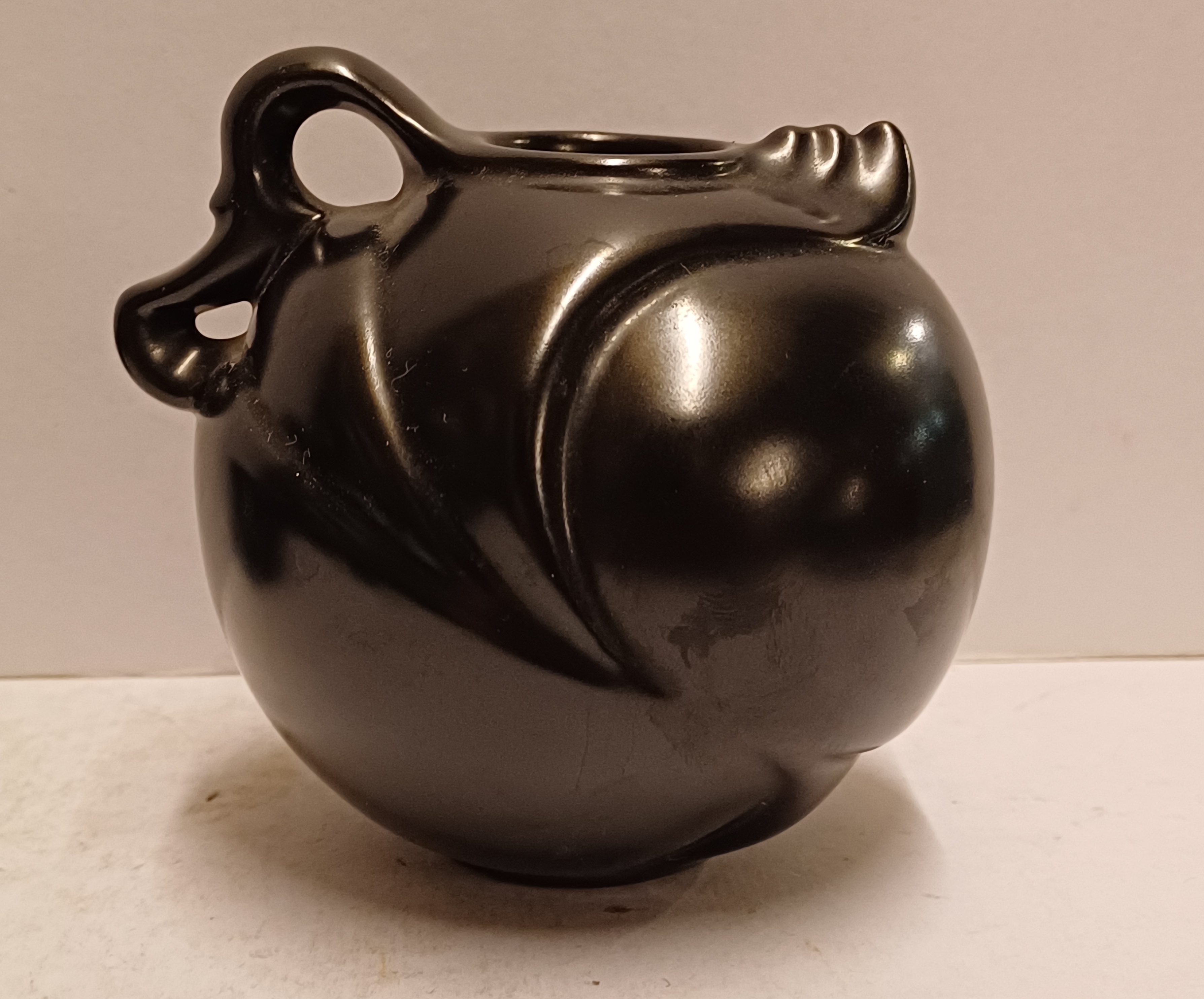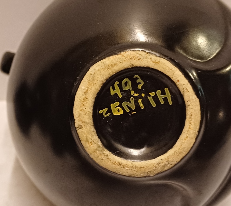 Zwart geglazuurd vaasje met grillig decor en dubbel oor. Onderzijde gemerkt Zenith en genummerd 403. Ontwerp Willem Stuurman.