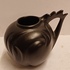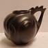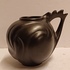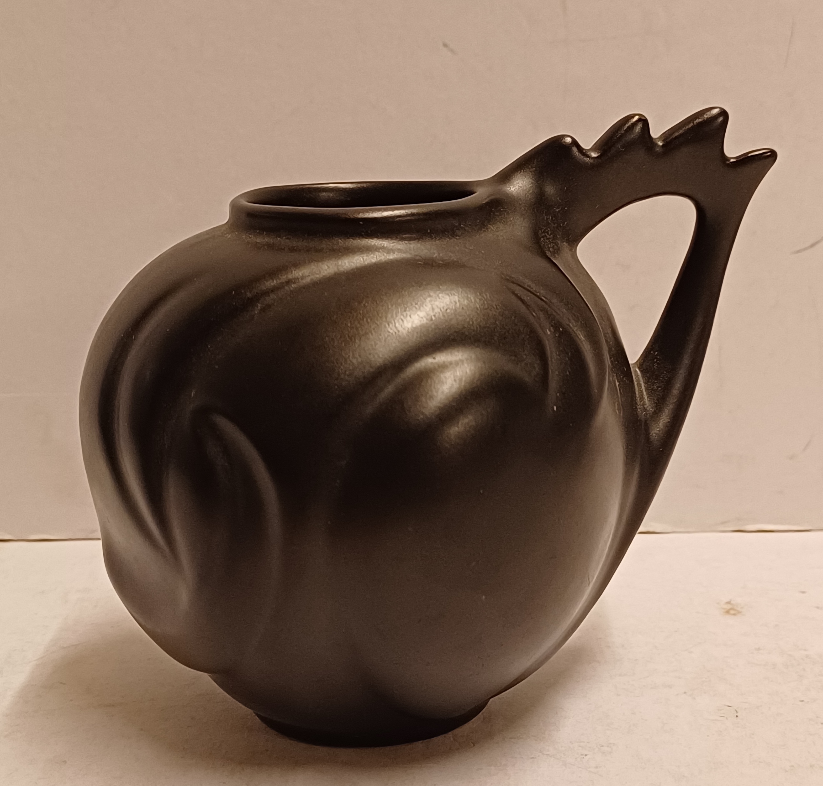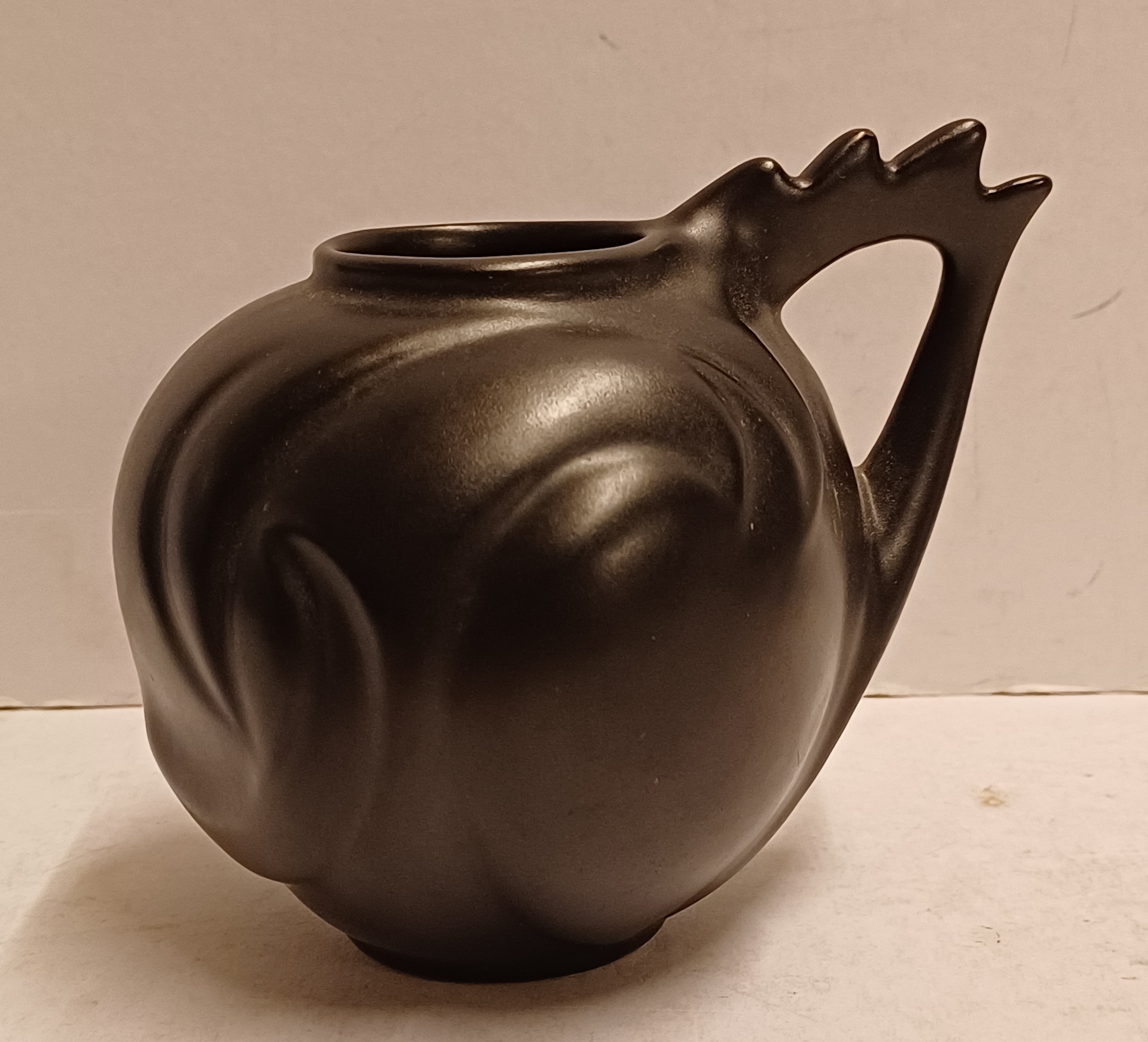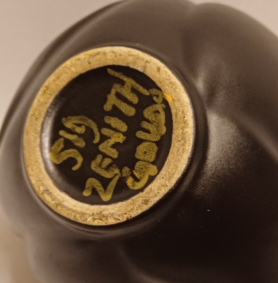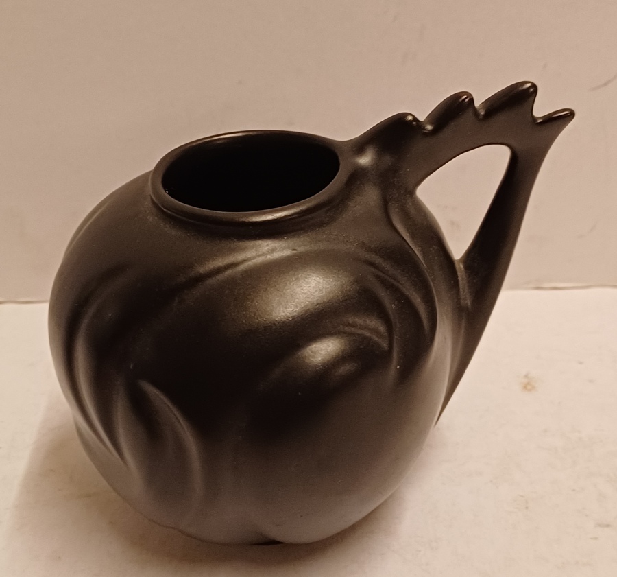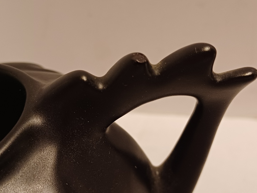Zwart geglazuurd gegoten vaasje met gekamd oor. Onderzijde met fabrieksmerk