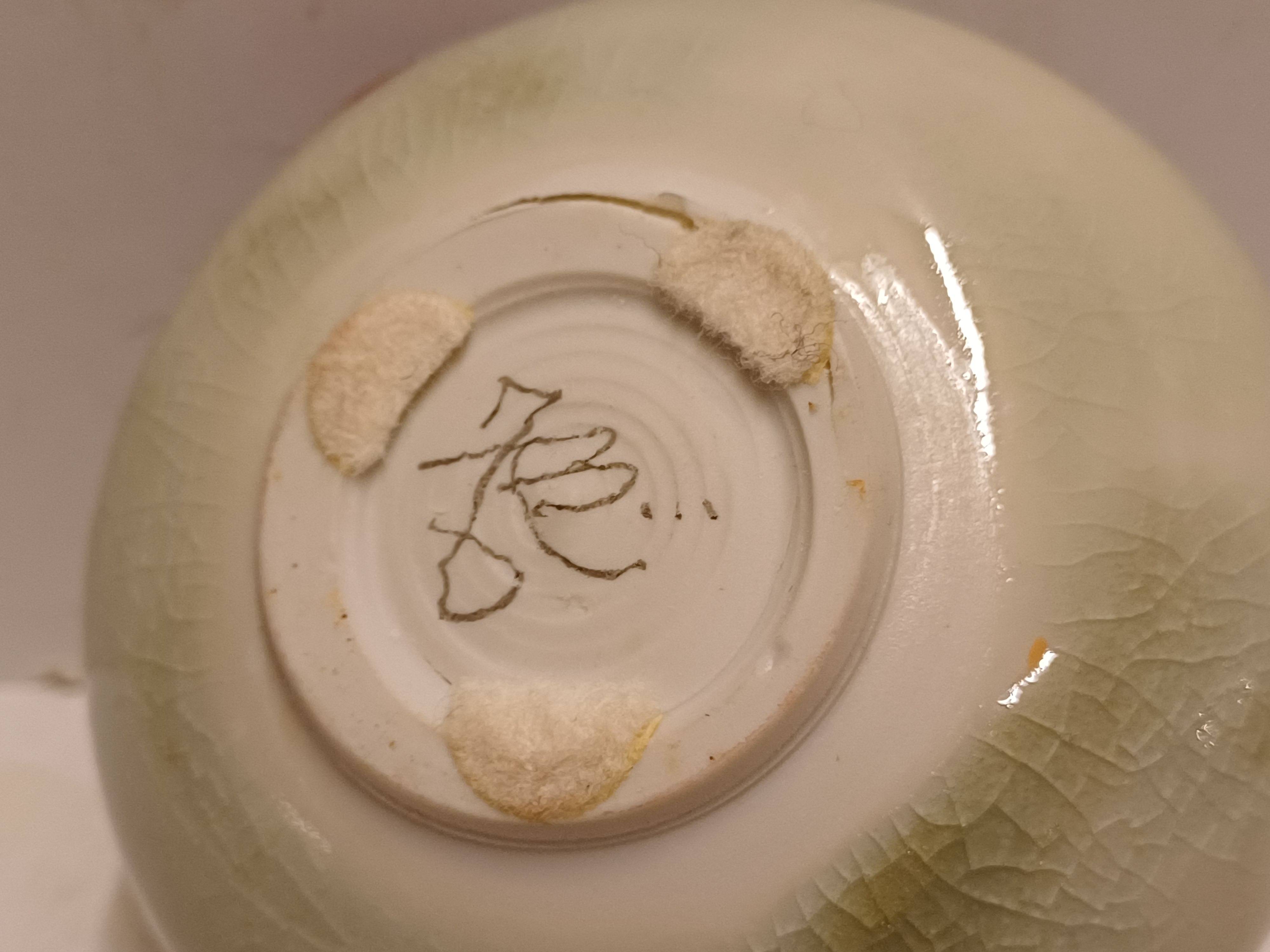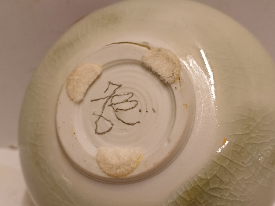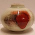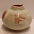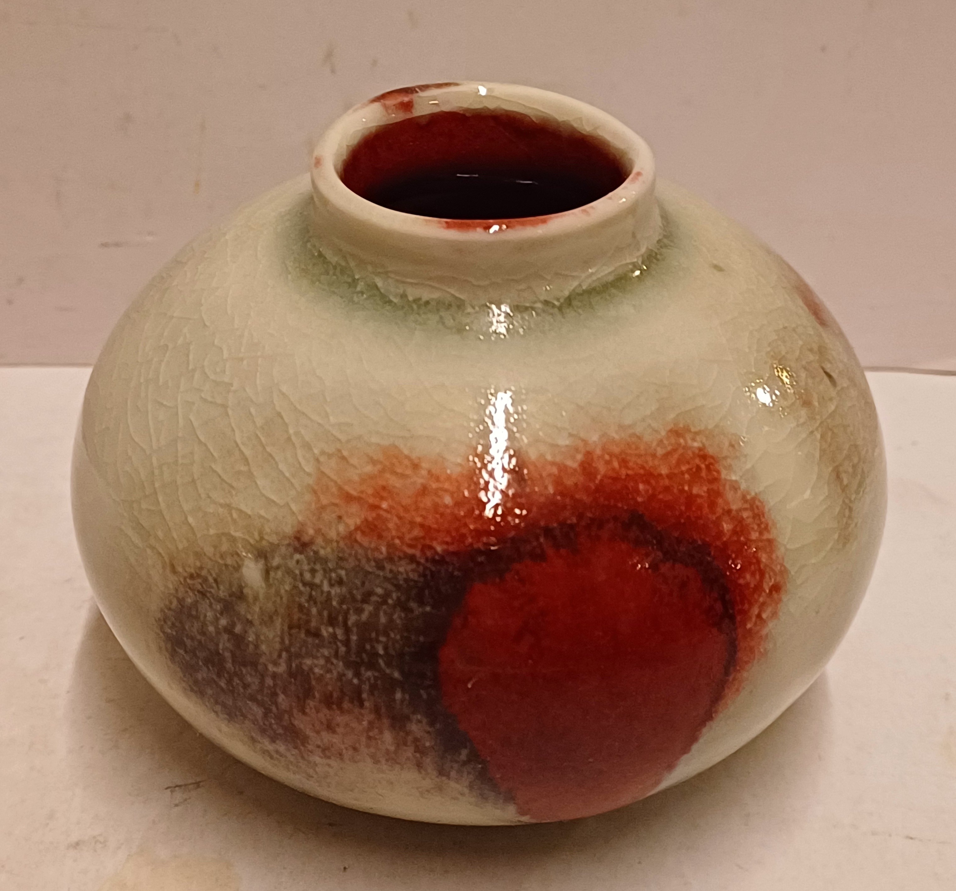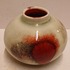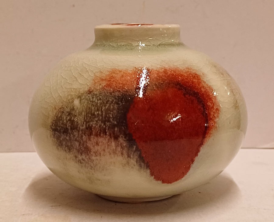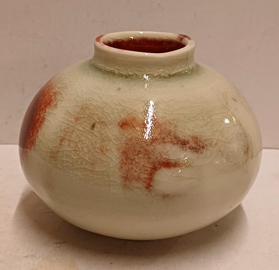 Vaasje met wittige celadon glazuur met rode splash op de buik. Onderzijde gesigneerd in potlood.