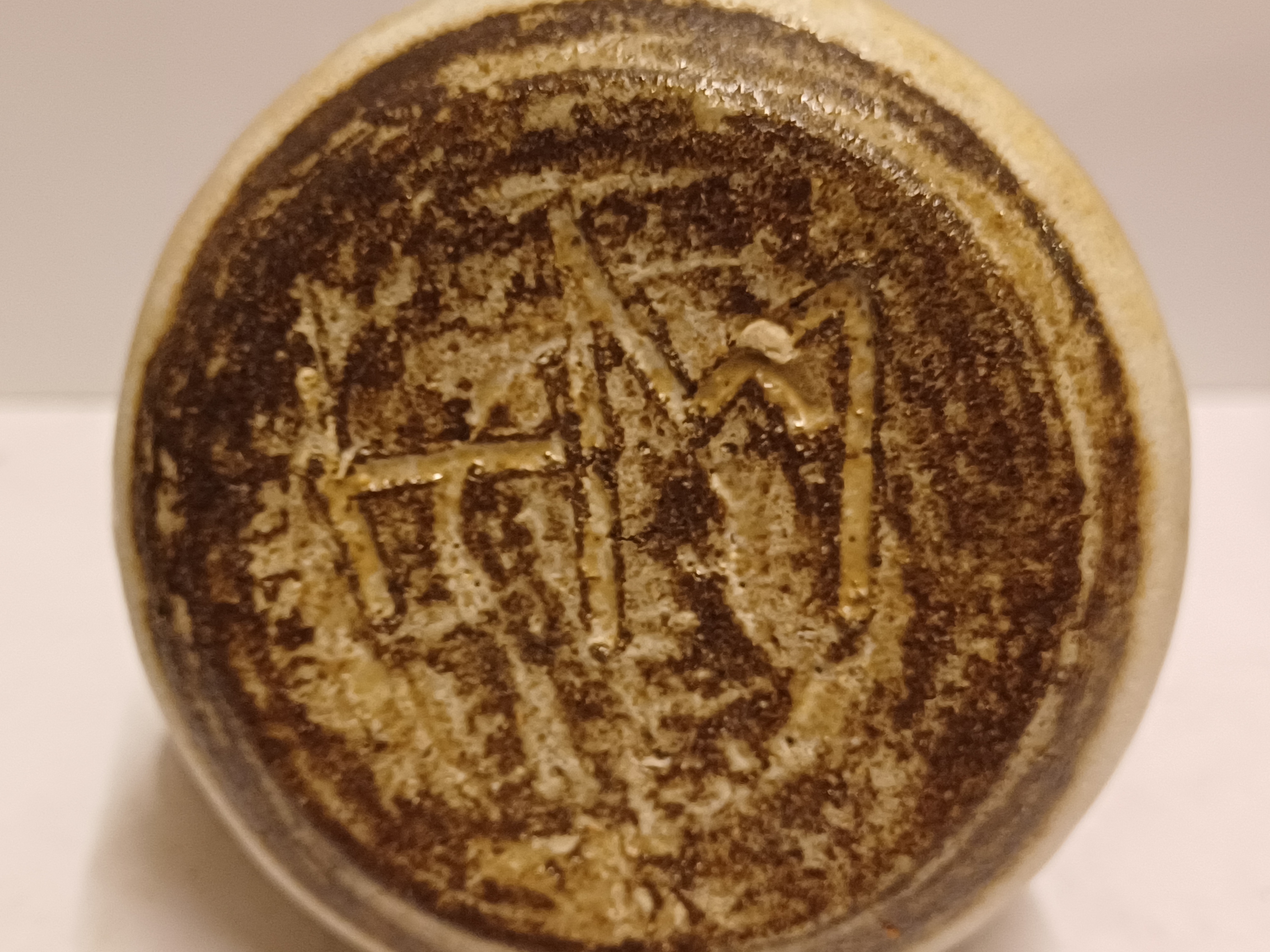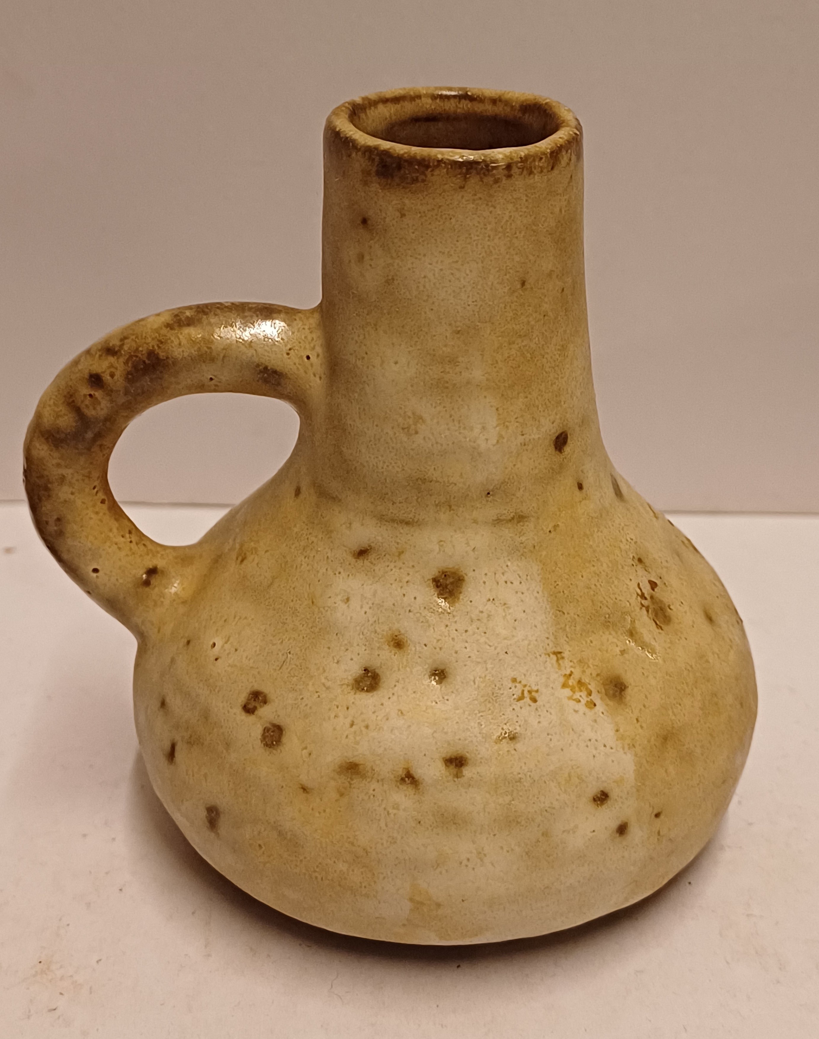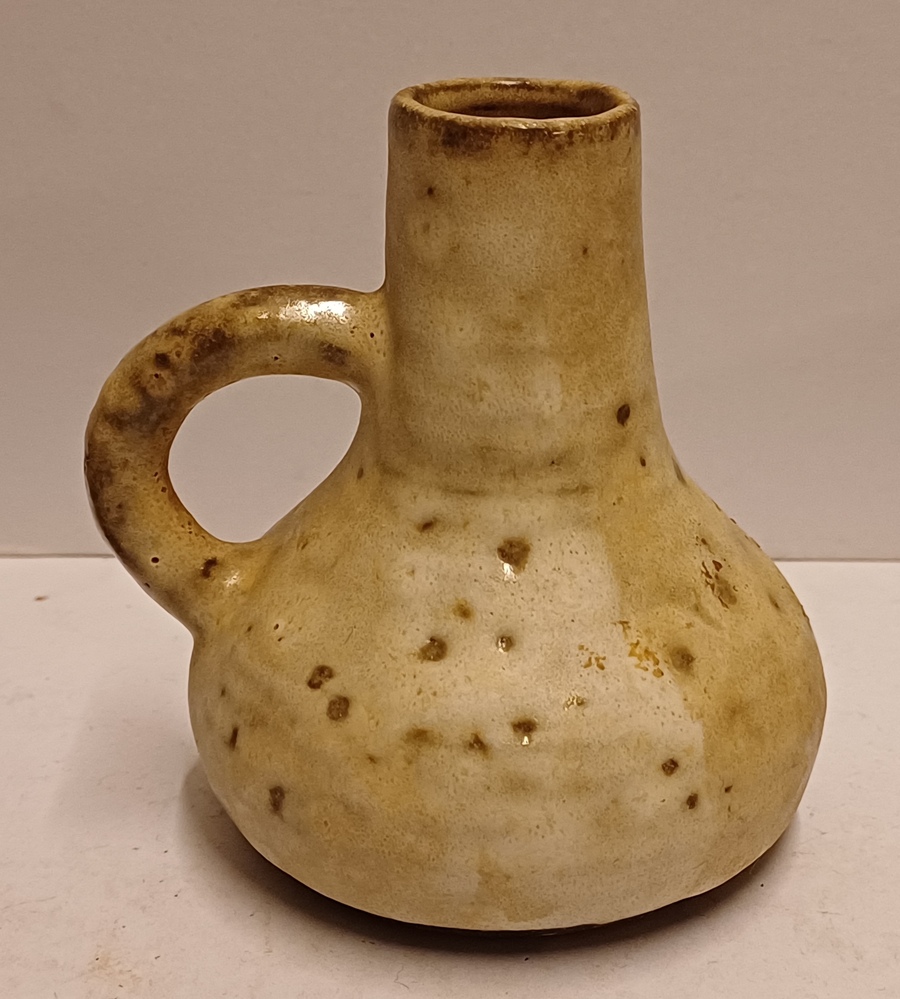 Klein aardewerken vaasje met oor. Onderzijde met monogram