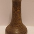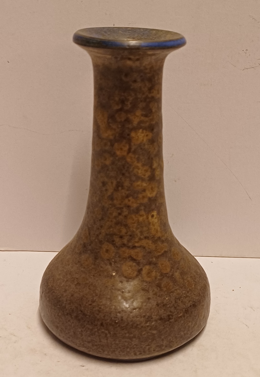 Donkerbruin geglazuurd vaasje met blauwe halsrand. Onderzijde gesigneerd.