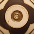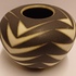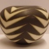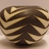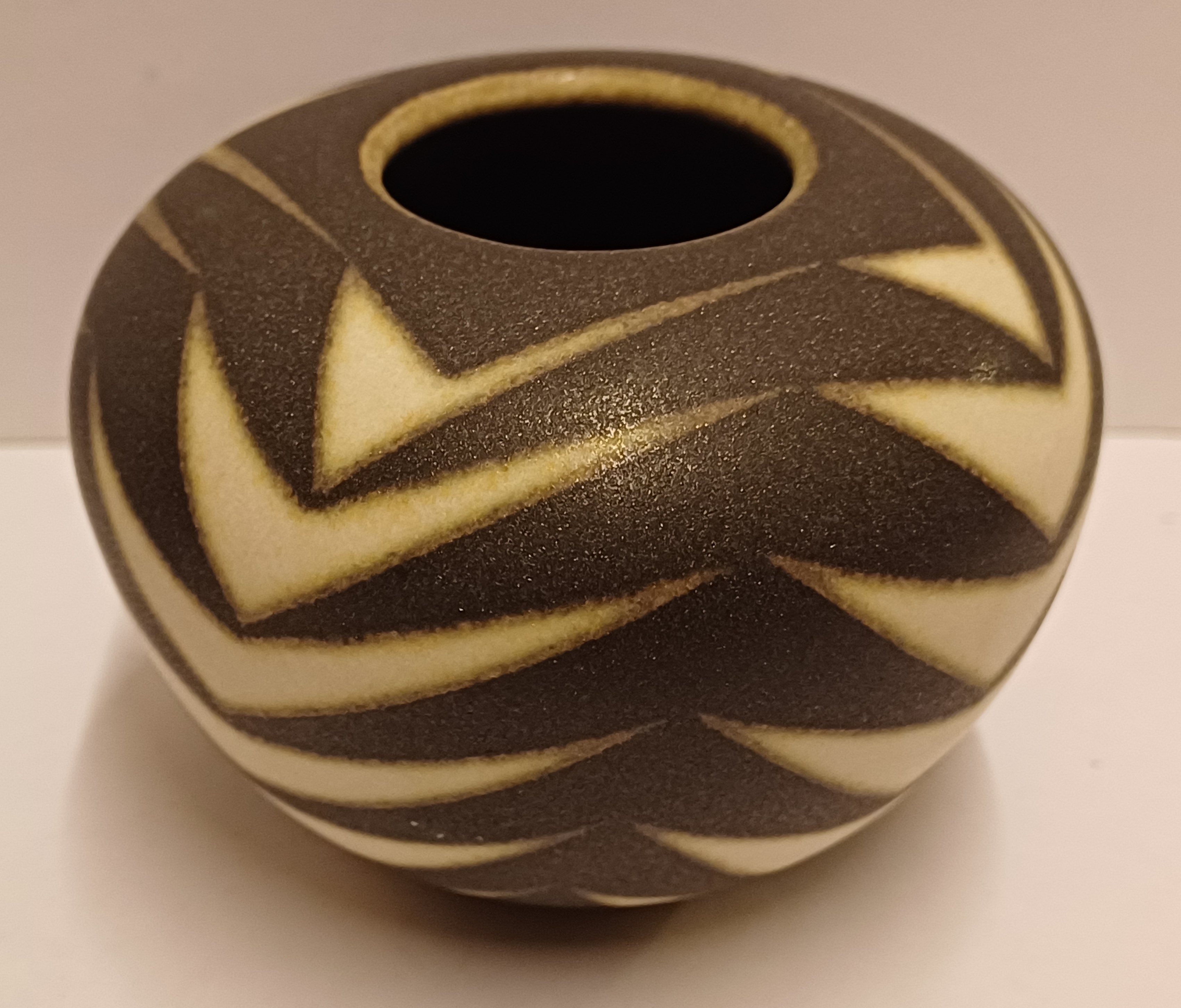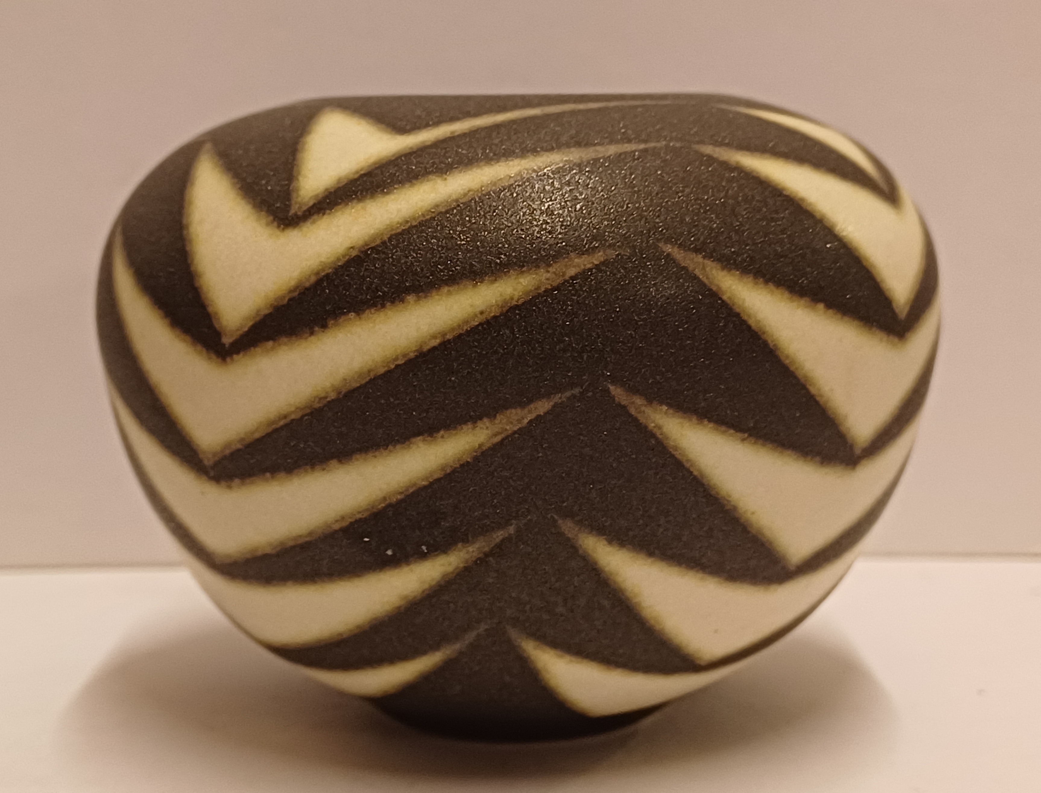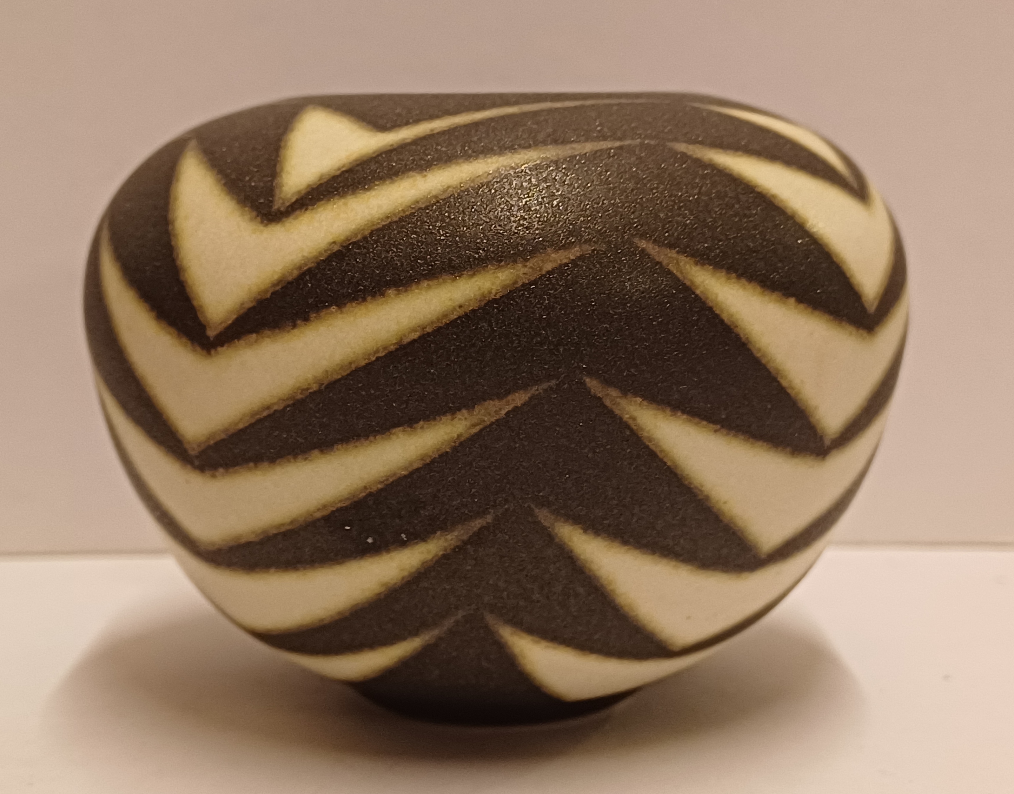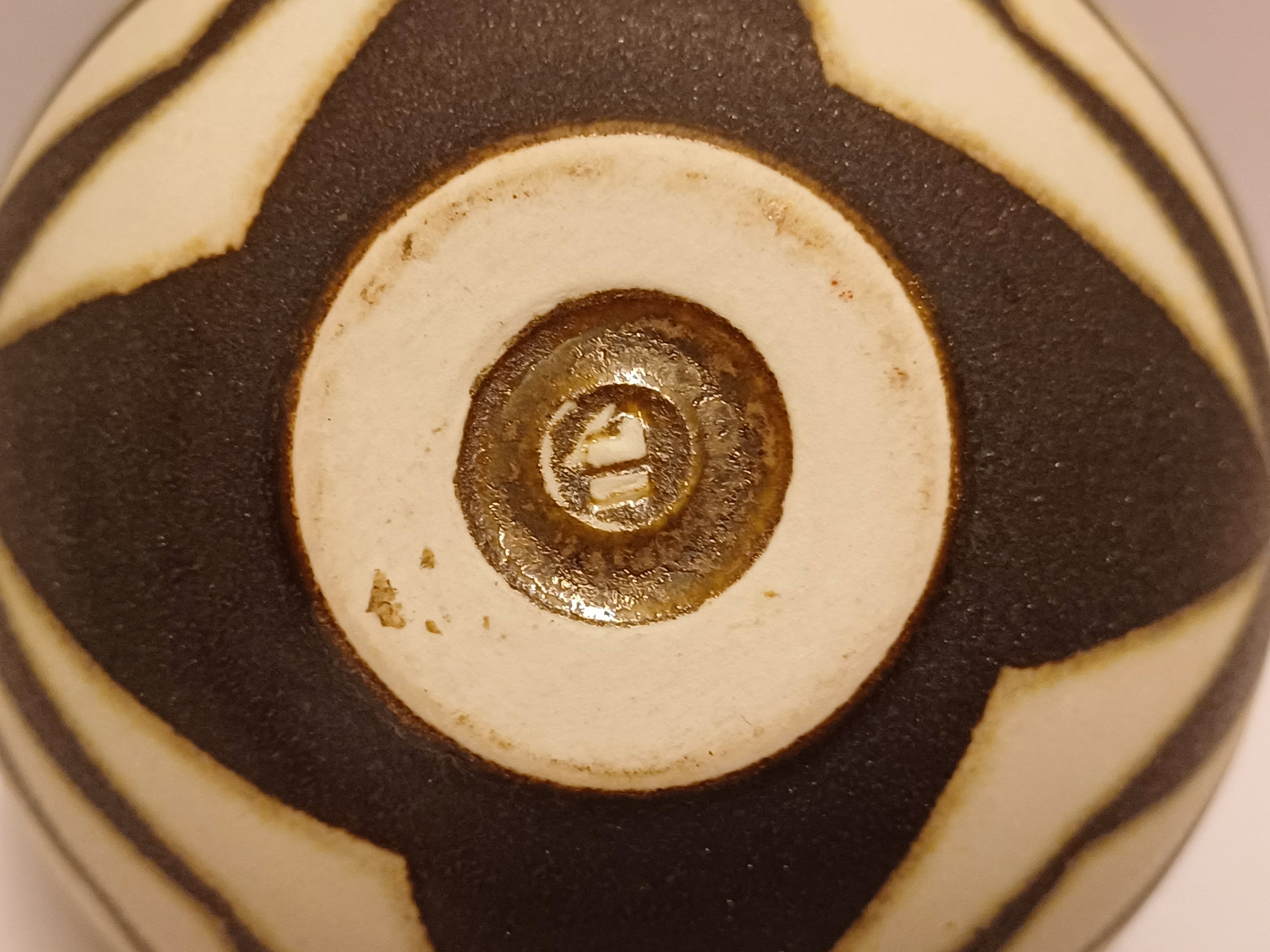 Klein bol vaasje met geometrische decoratie op donker fond. Onderzijde met kunstenaars monogram,