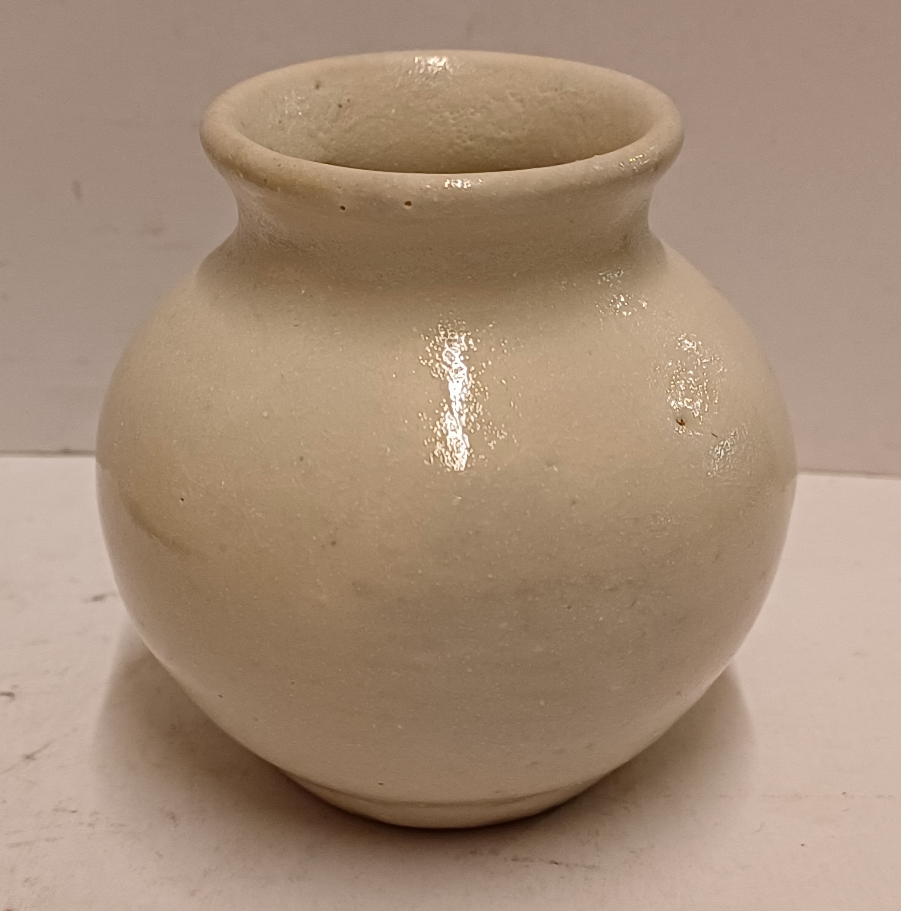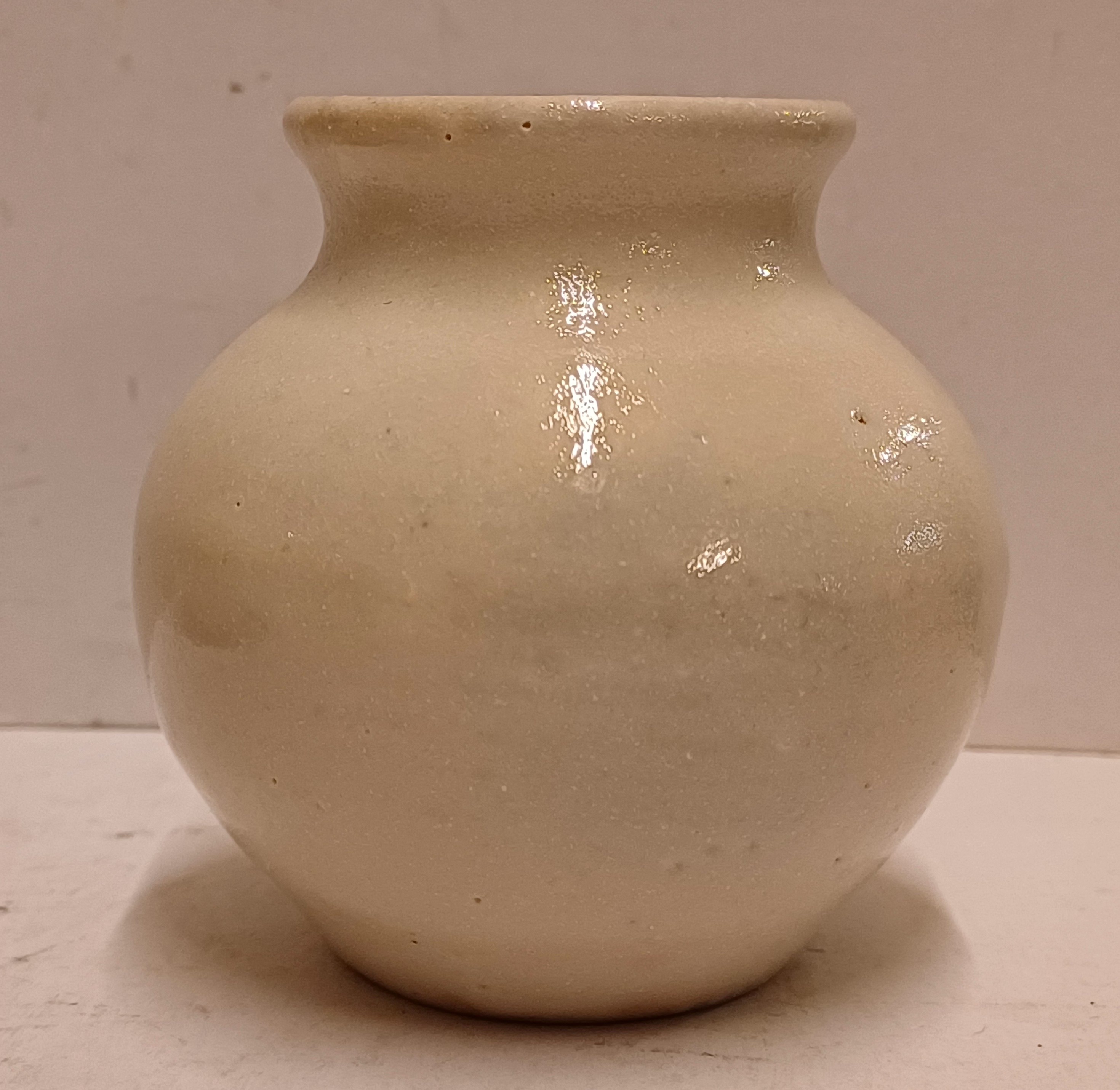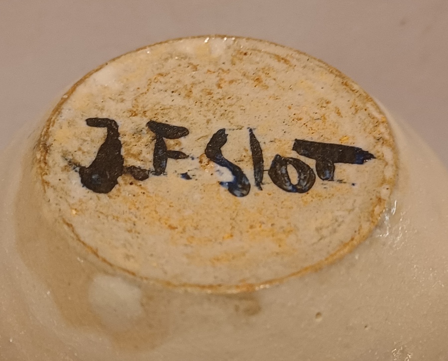 Klein aardewerken vaasje met witte glazuur. Onderzijde gesigneerd JF Slot