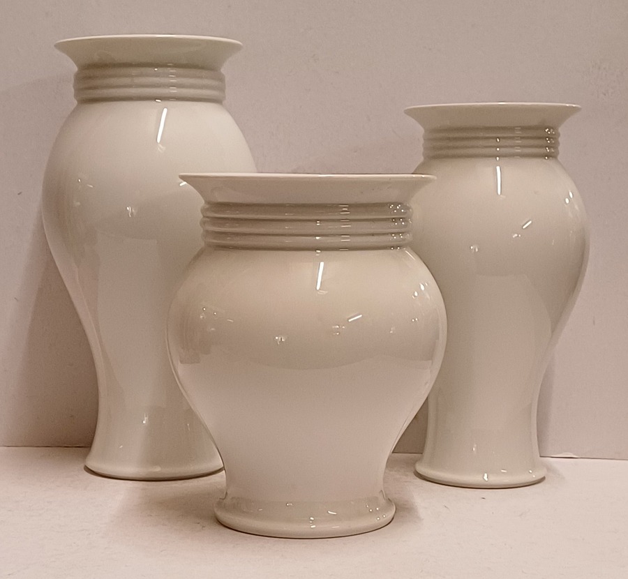 Een set van 3 porseleinen sample vazen. Wit porselein met met meerdere kragen. Uitvoering Rosenthal, niet gesigneerd gedateerd in stift 02-02-94.