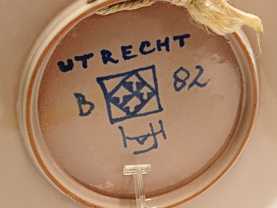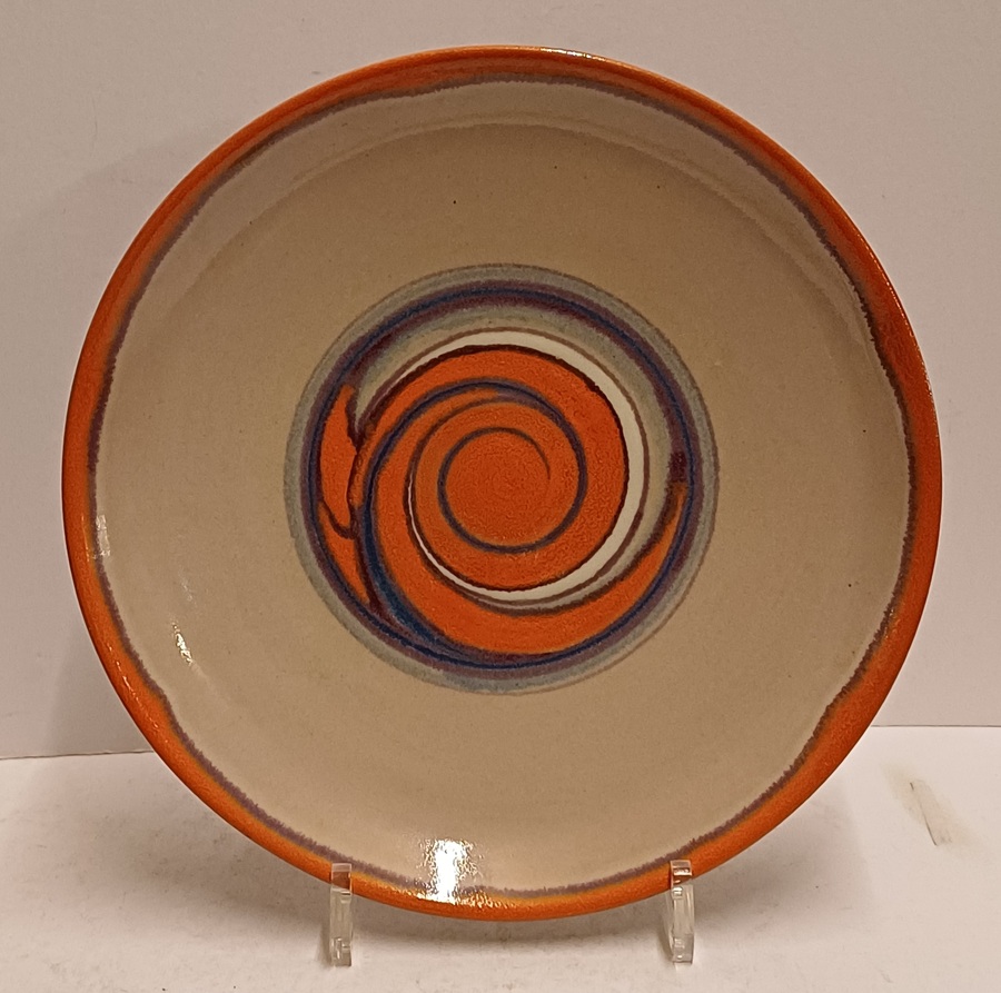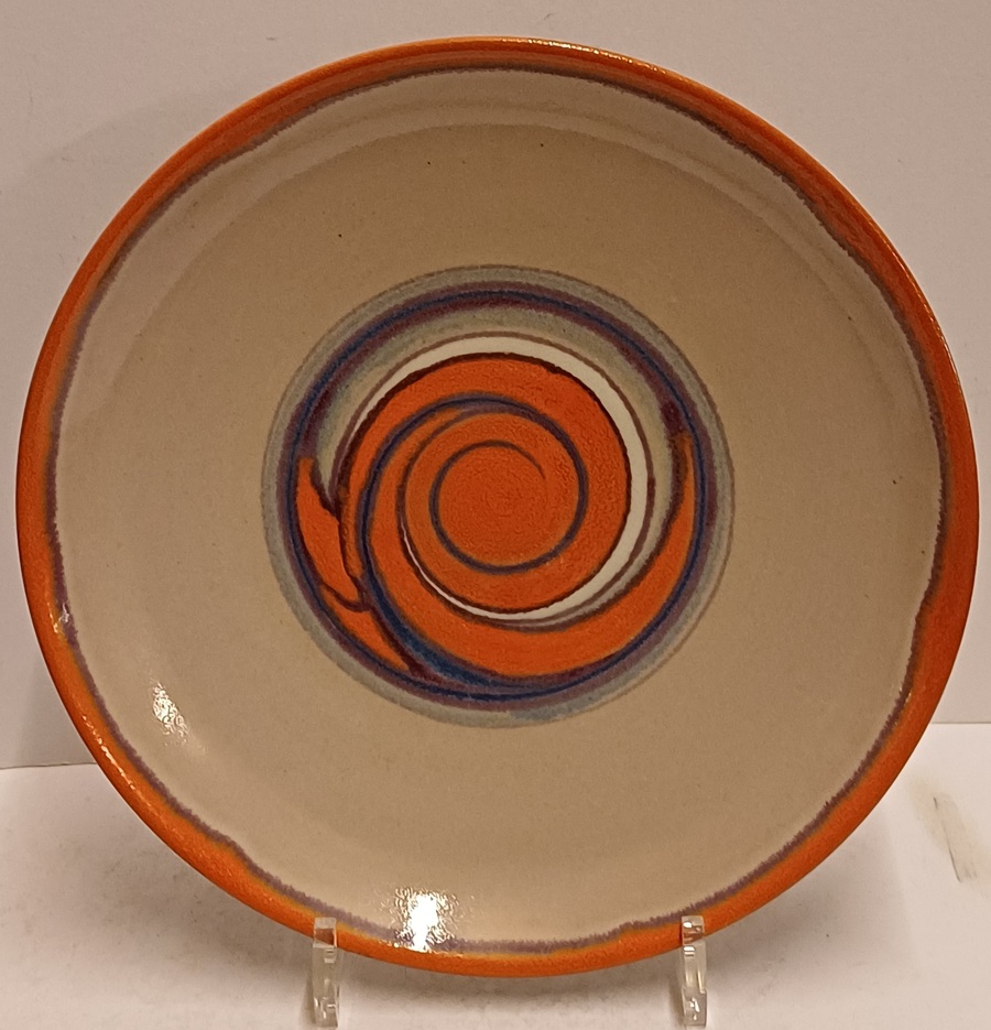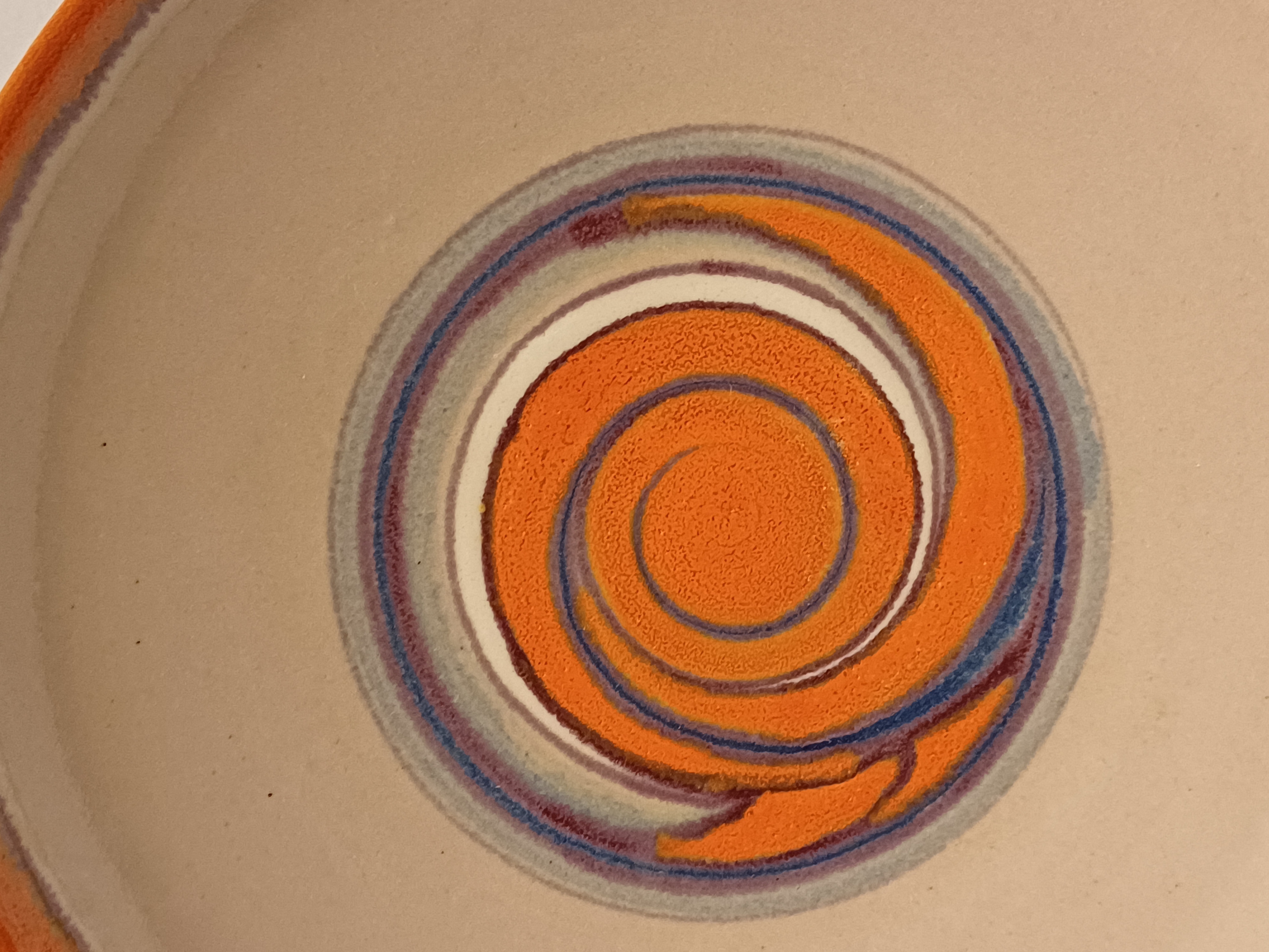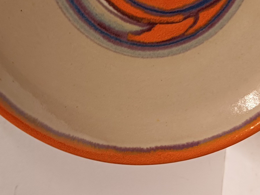 Piatto da parete con decorazione astratta in arancione e viola su fondo grigio. Retro con marchio dipinto e monogramma del pittore Jan van Ham.