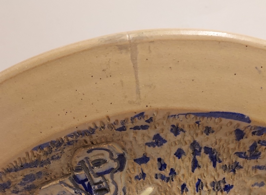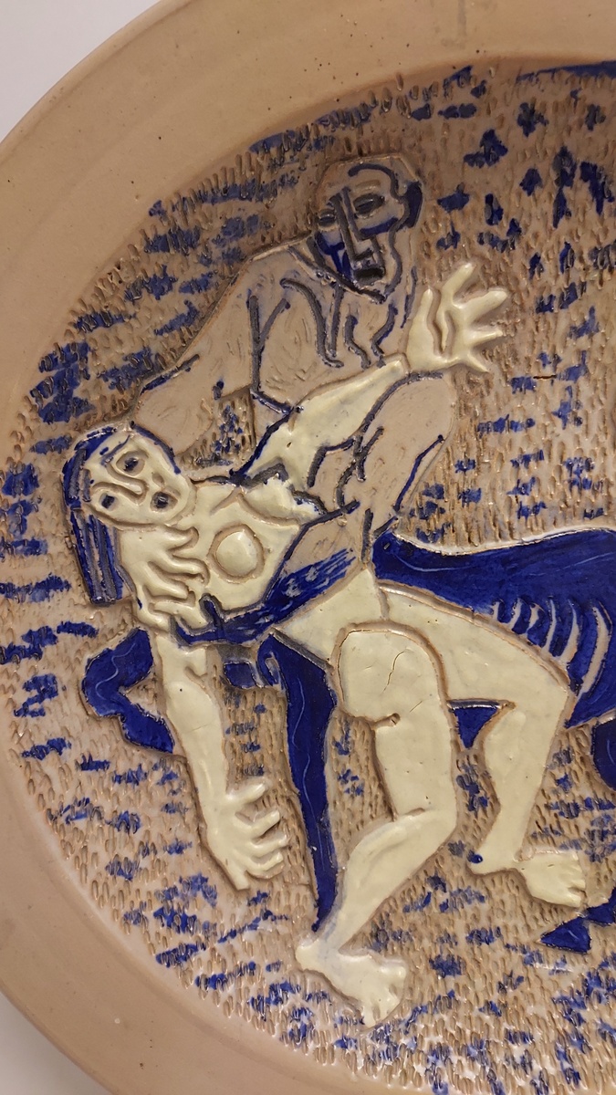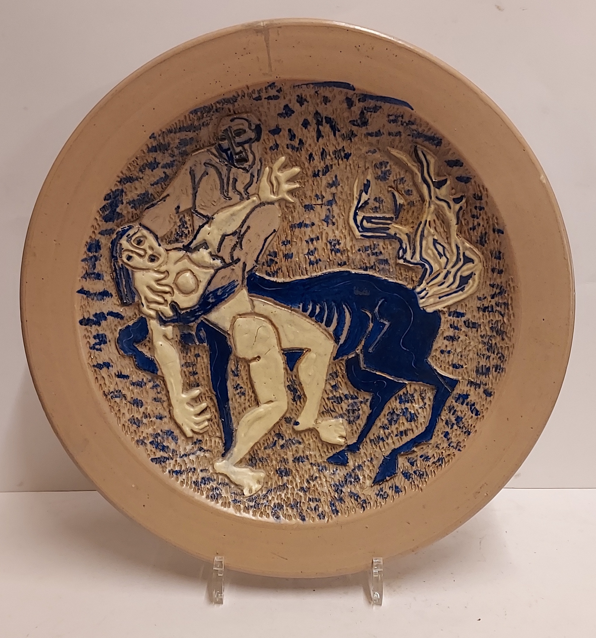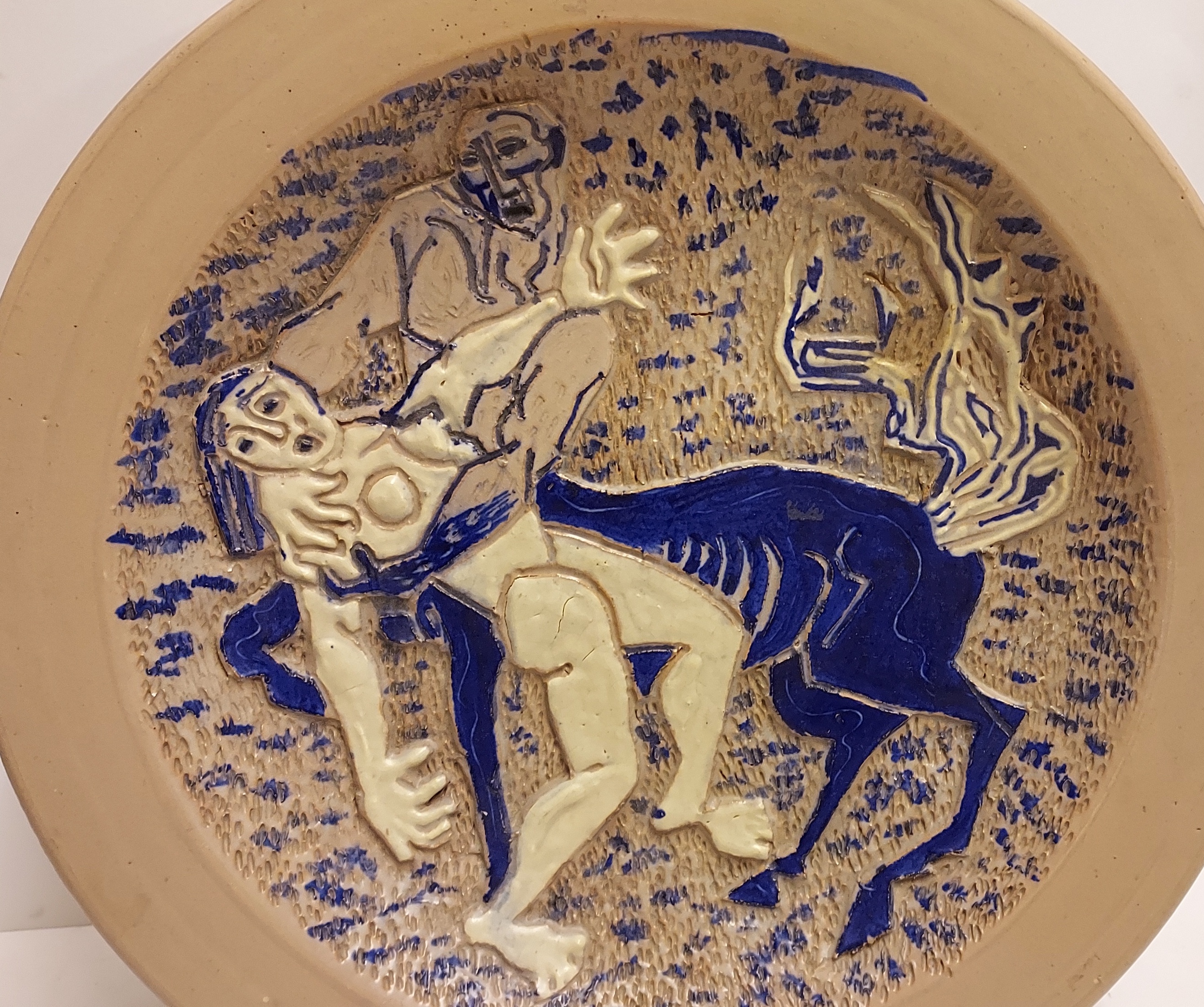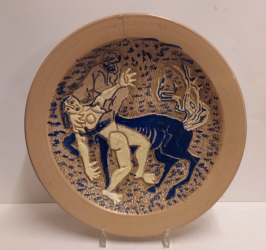 Piatto fatto a mano con decoro inciso raffigurante un Centauro che ha catturato una donna. Retro con marchio di fabbrica dipinto e firma dell'artista.