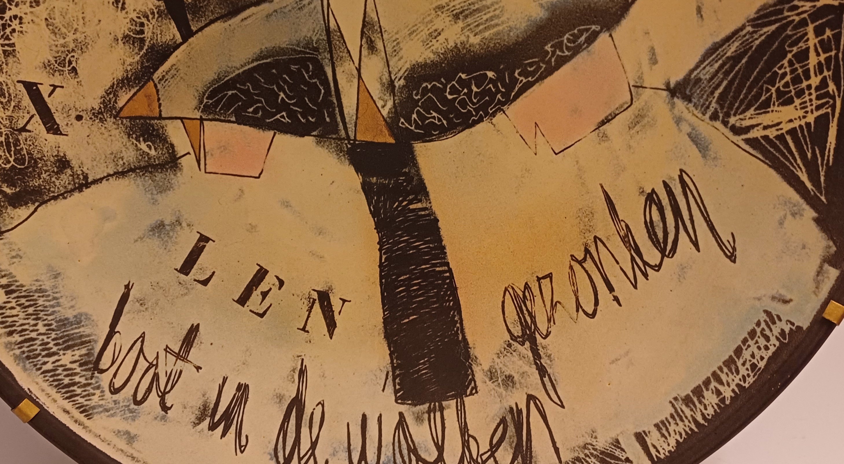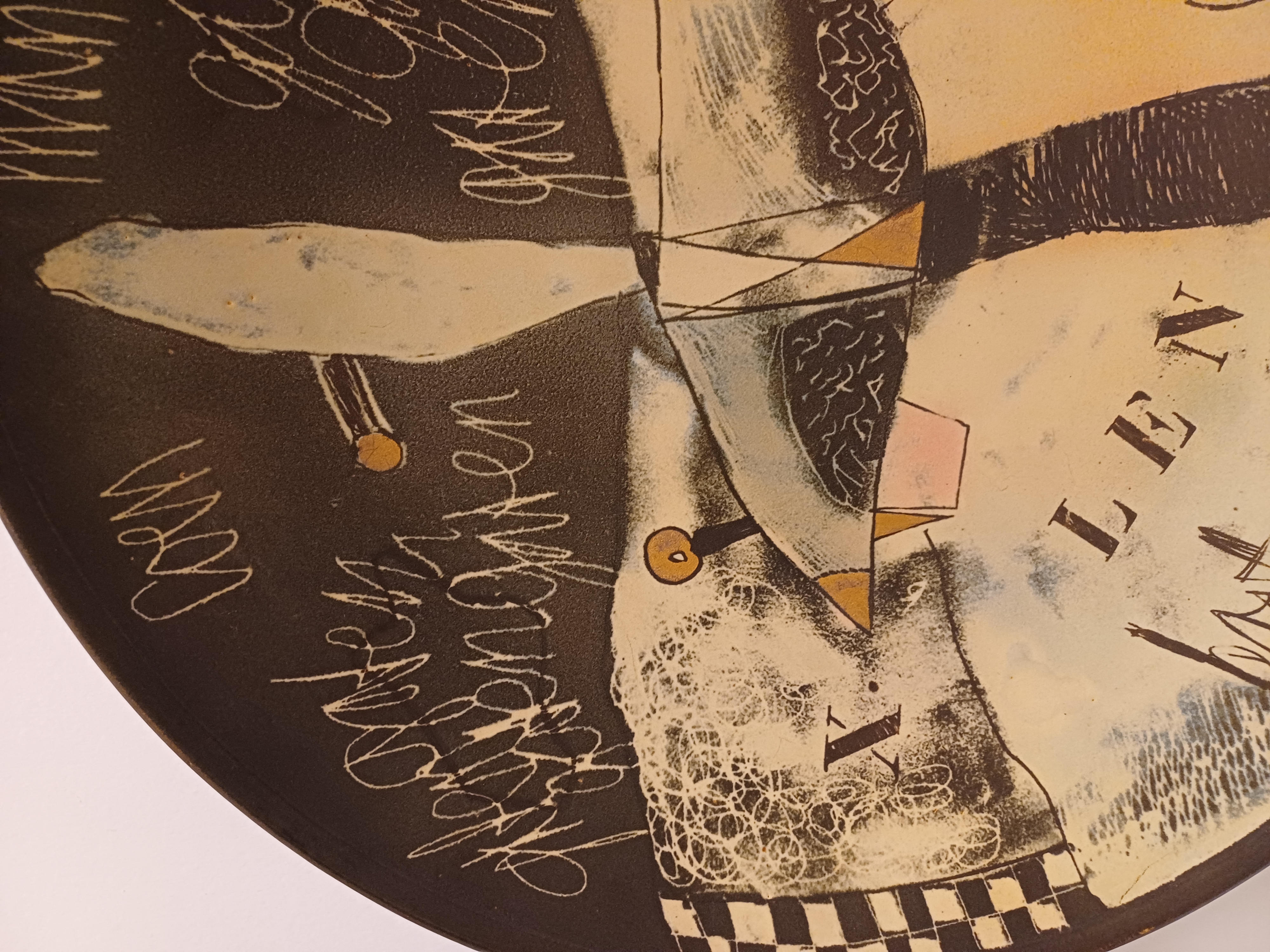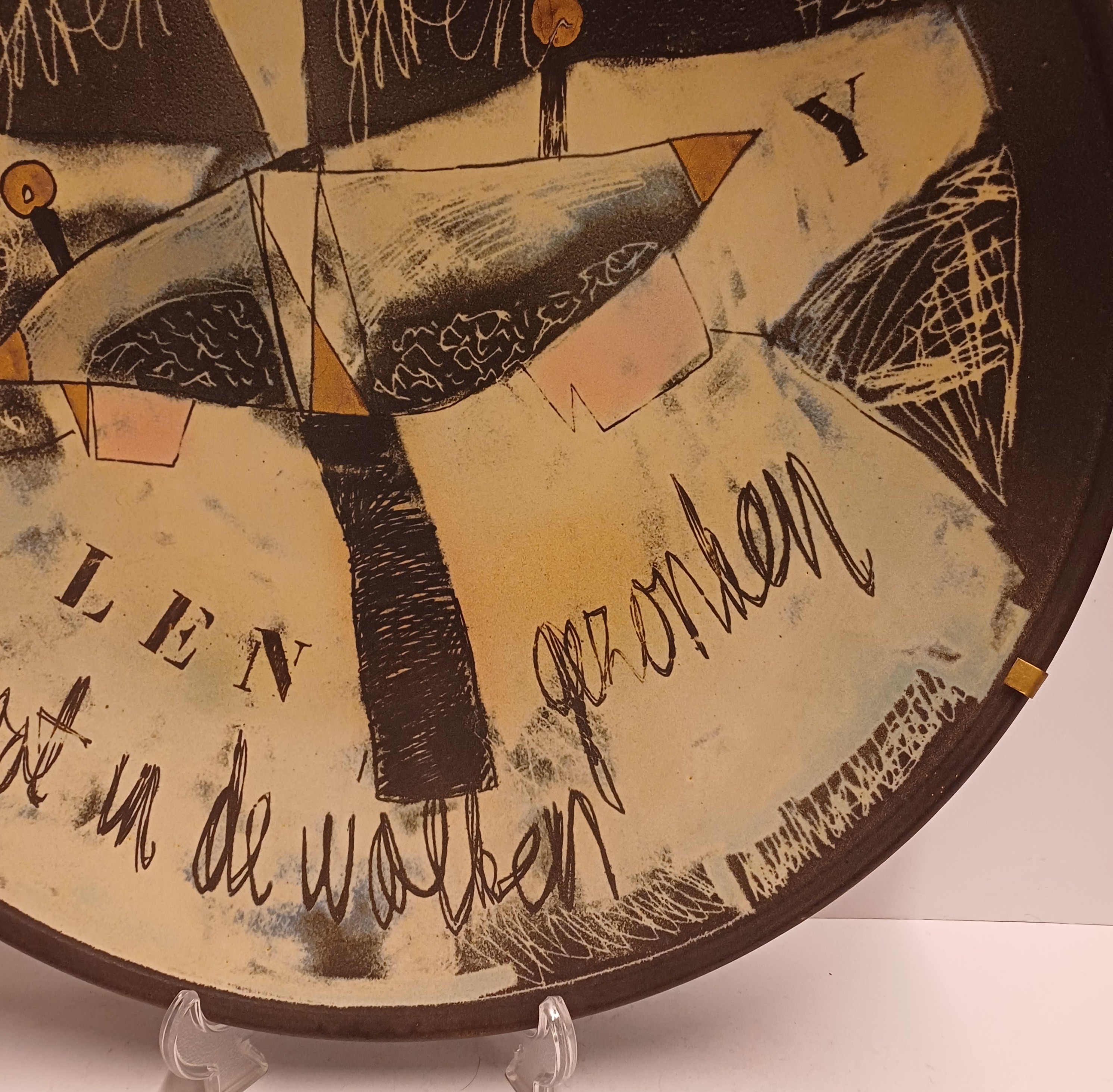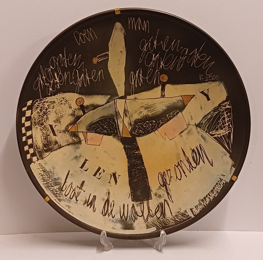 Piatto monumentale con rappresentazione di un aeroplano e decorato con testo "Gezonken boot in de wolken". Lato frontale firmato con monogramma e datato 2000. Retro con marchio dell'artista.