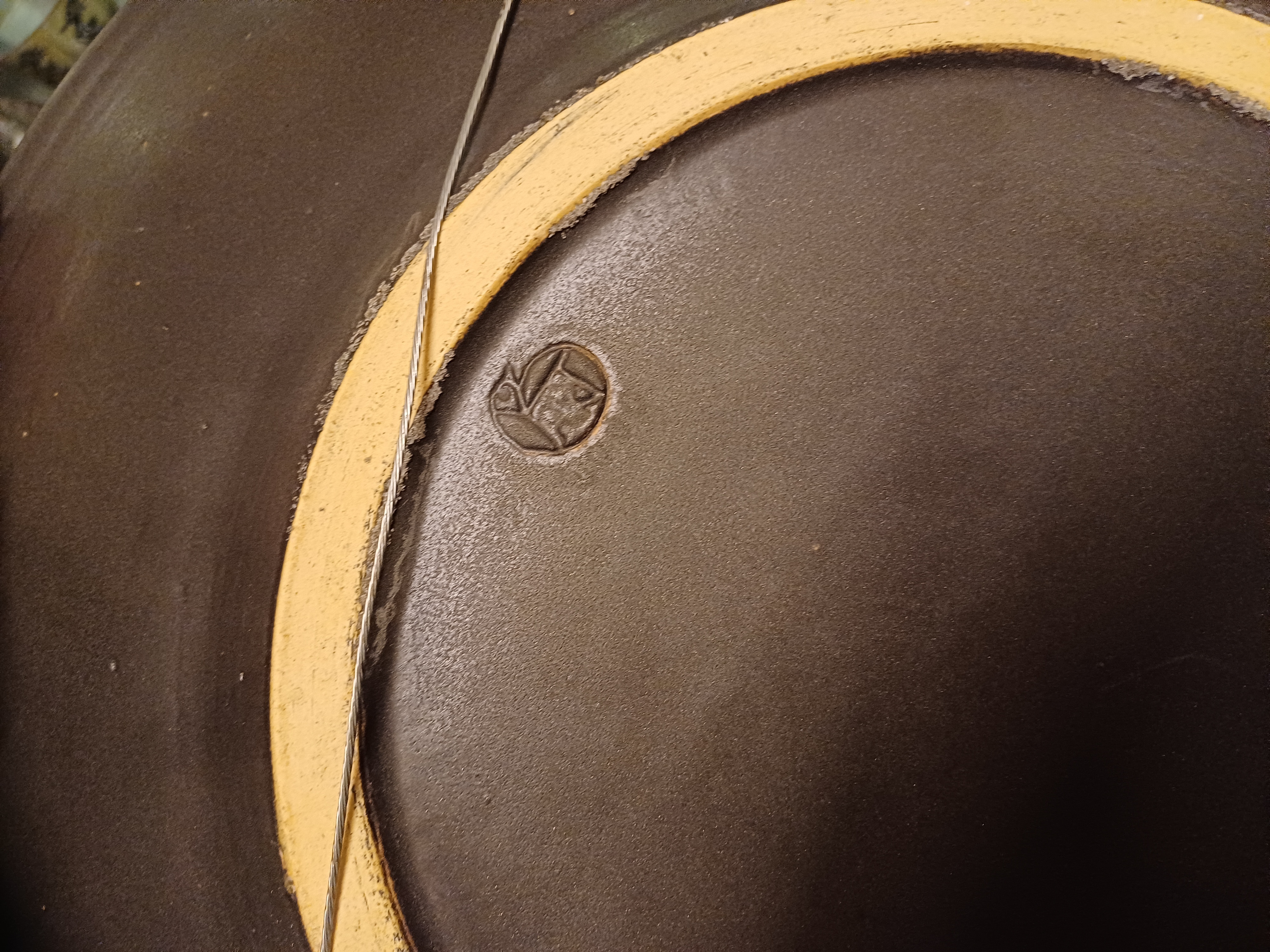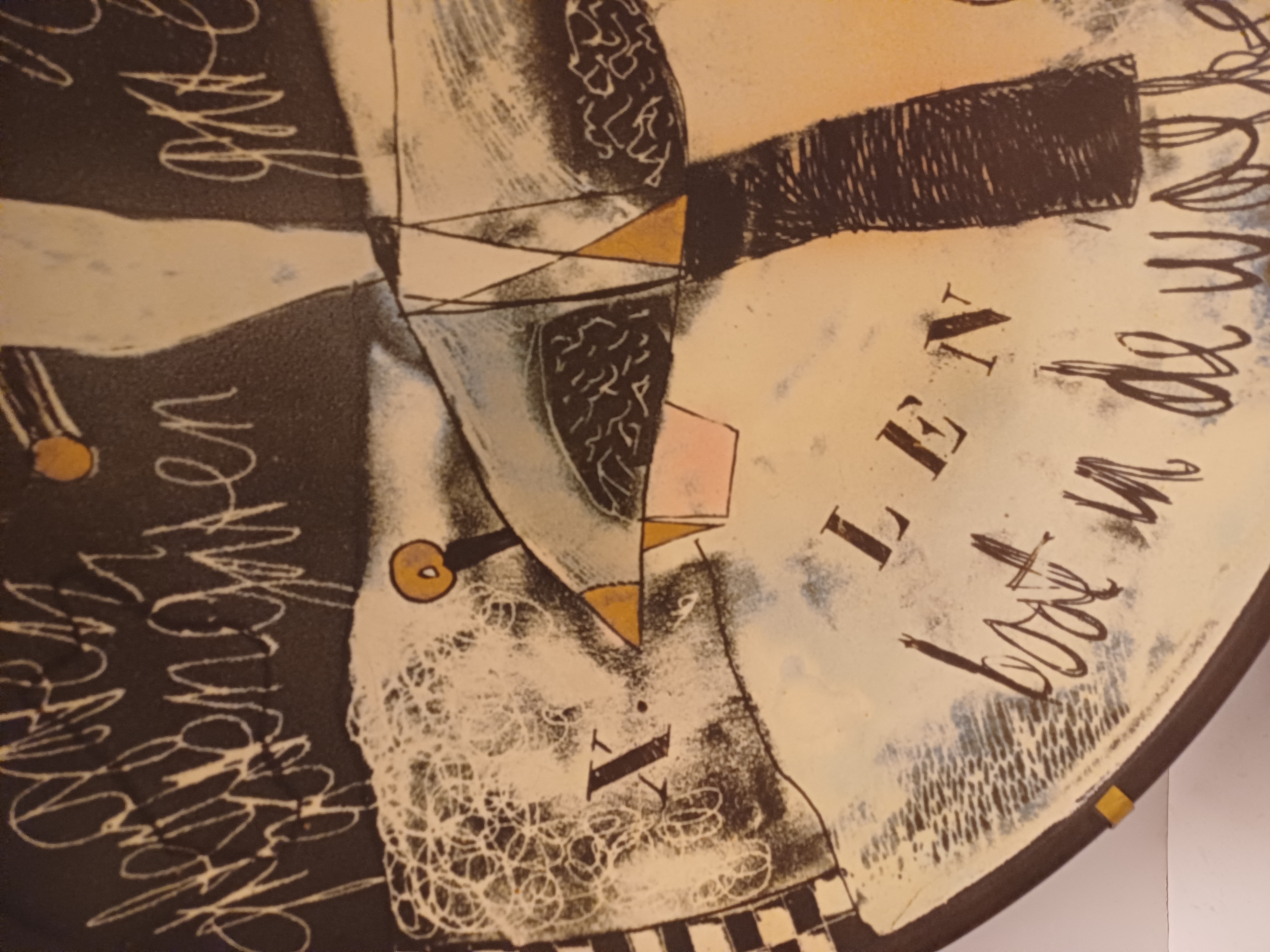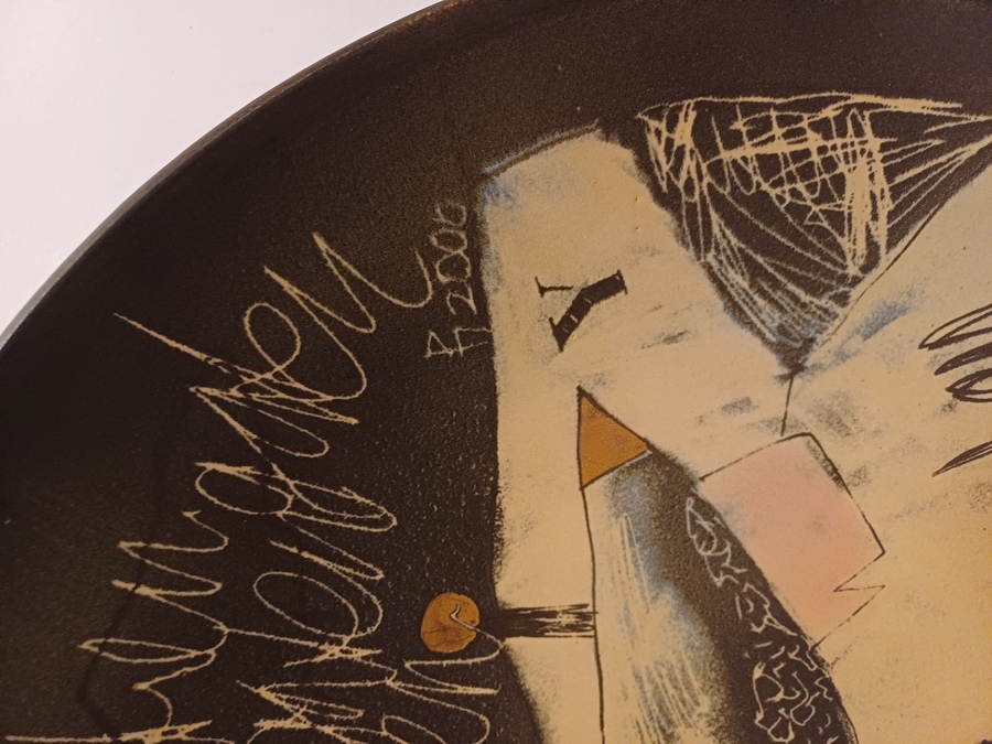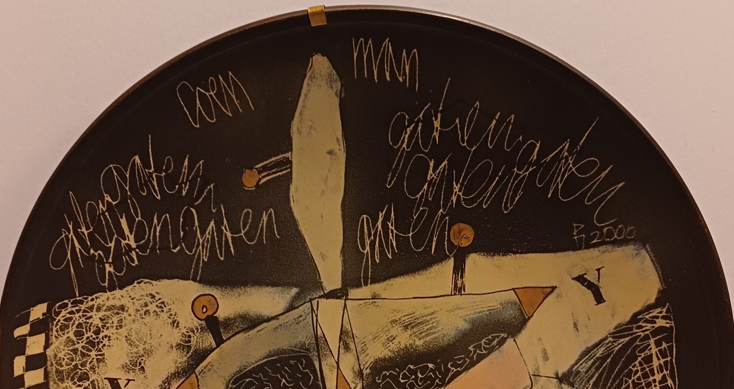Piatto monumentale con rappresentazione di un aeroplano e decorato con testo "Gezonken boot in de wolken". Lato frontale firmato con monogramma e datato 2000. Retro con marchio dell'artista.