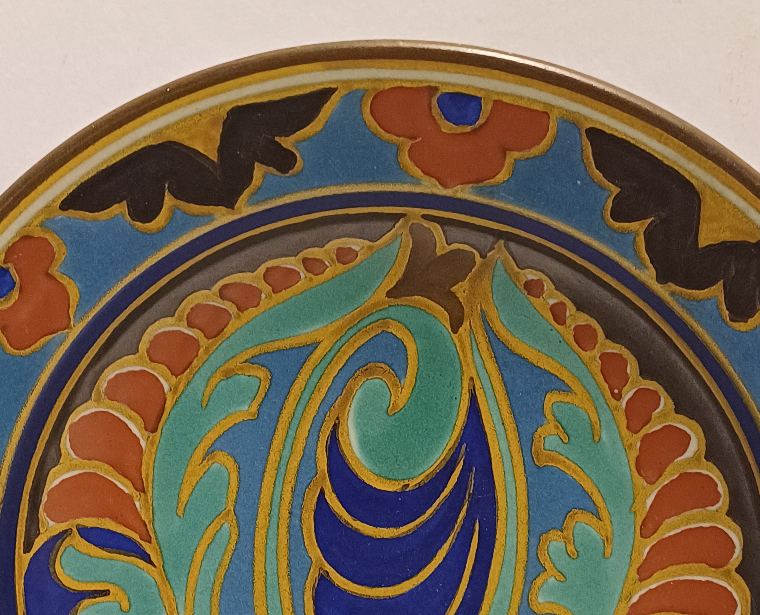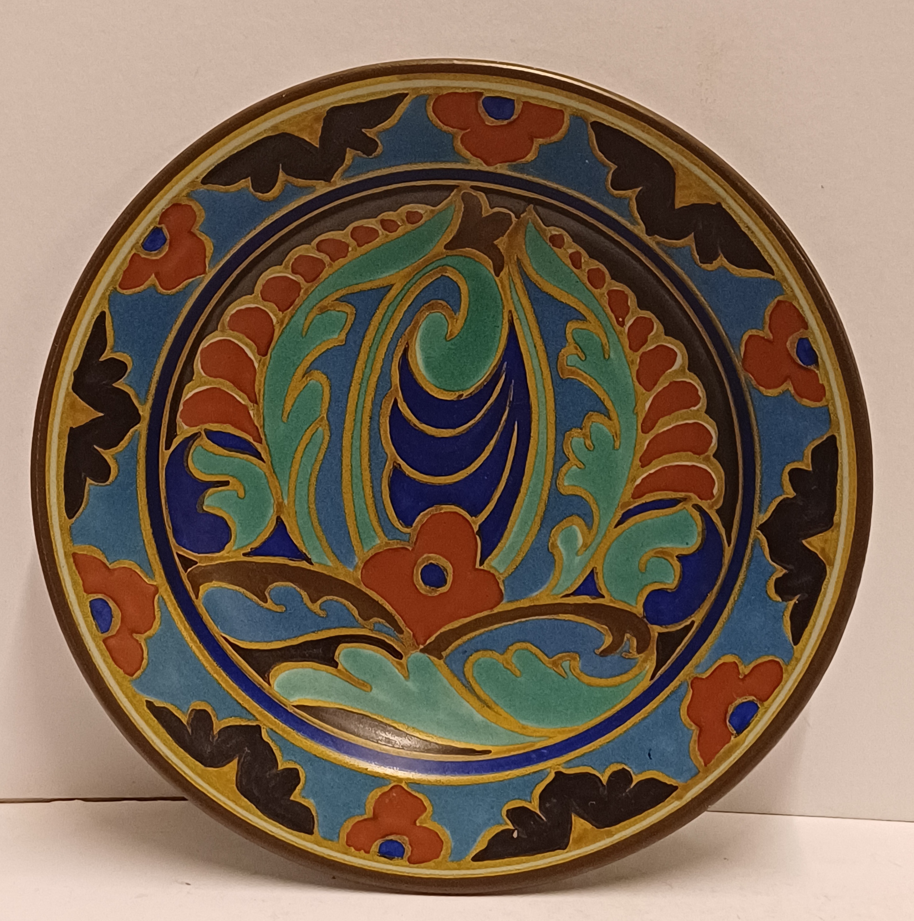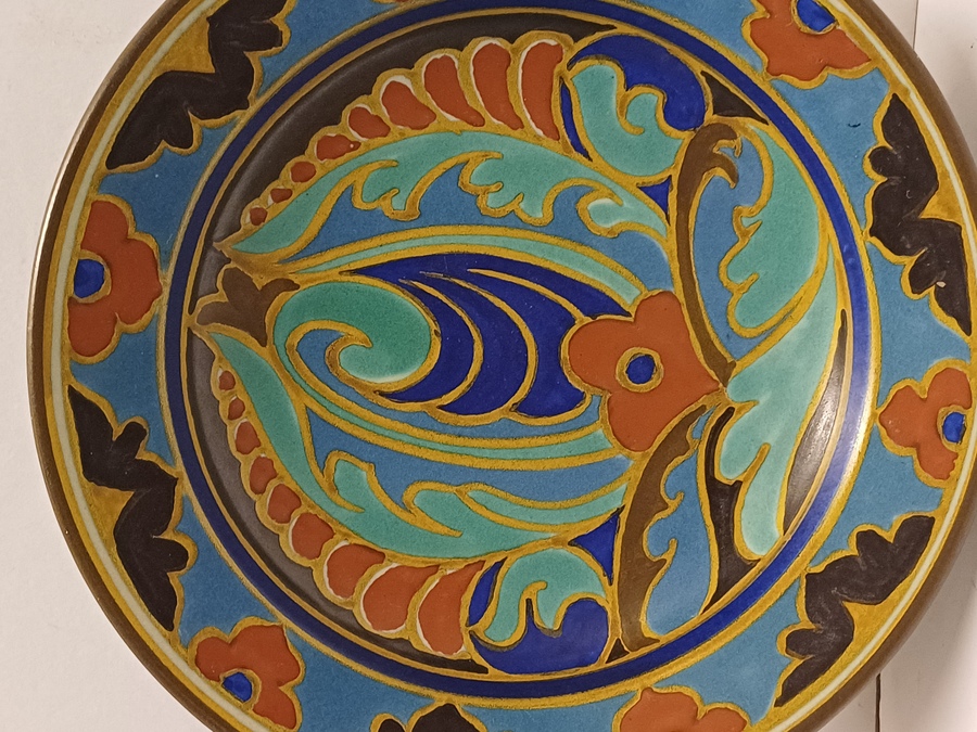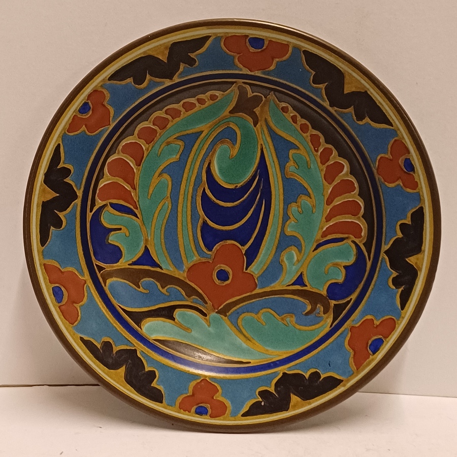 Platelen bord met gestileerd floraal decor westland. Achterzijde met fabrieksmerk, decornaam en jaarletter 1926.