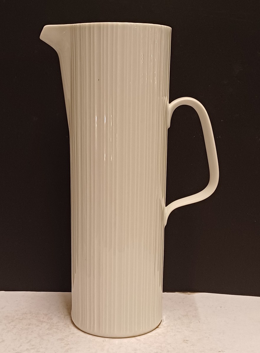 Porseleinen van buiten gematteerde schenkkan met verticaal lijn decor. Model Variation, ontwerp Tapio Wirkkala voor Rosenthal. Onderzijde met fabrieksmerk.