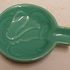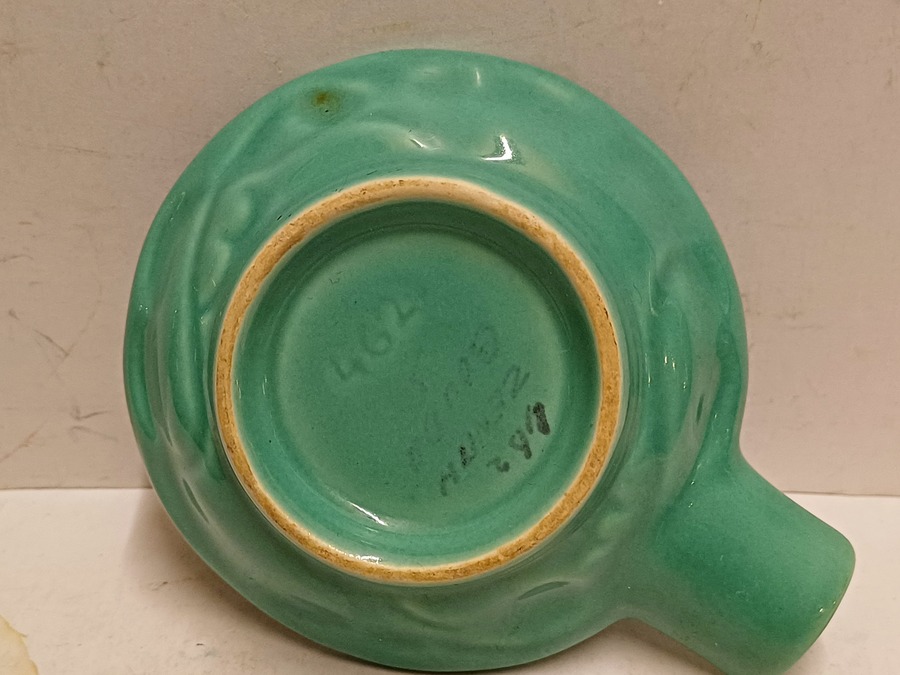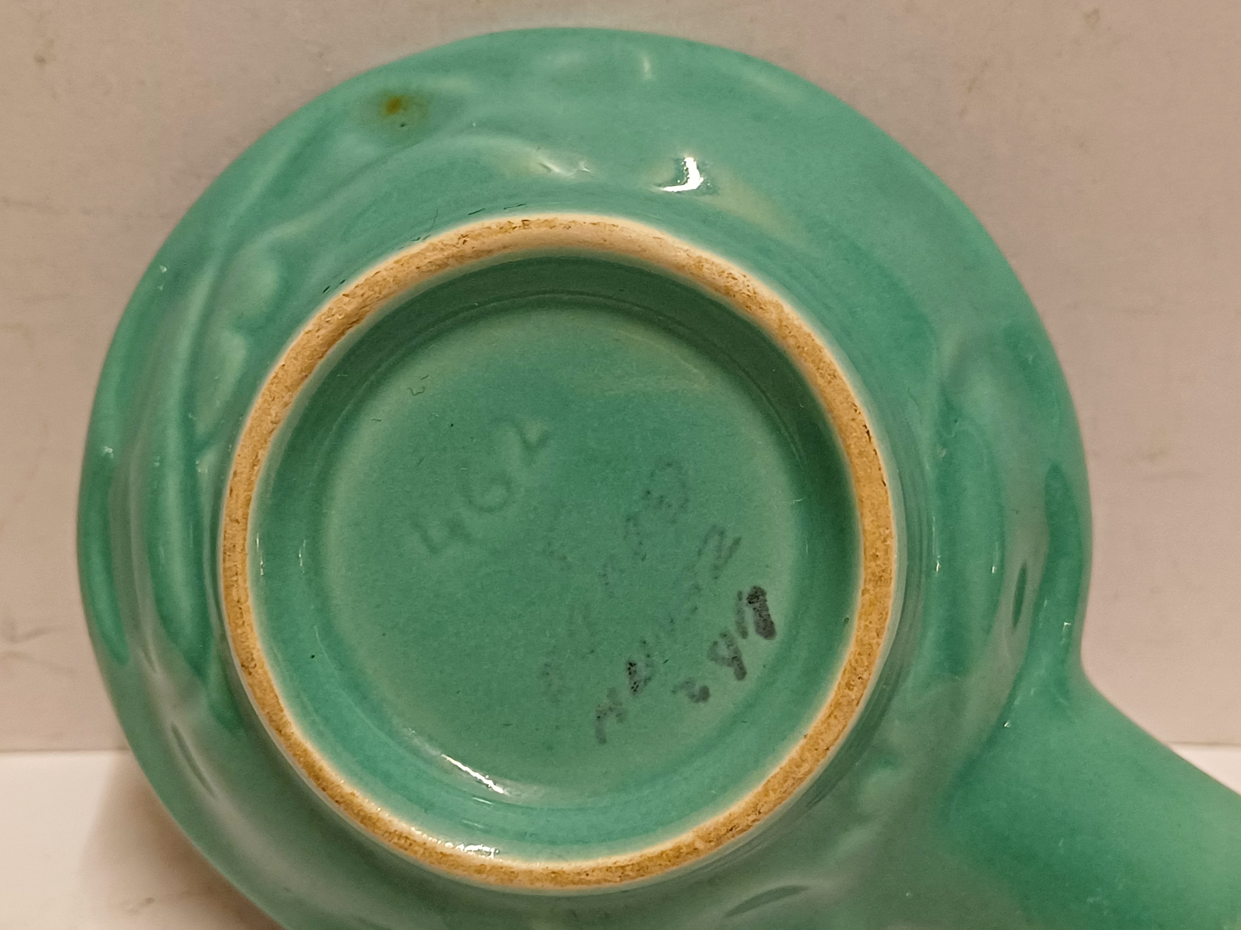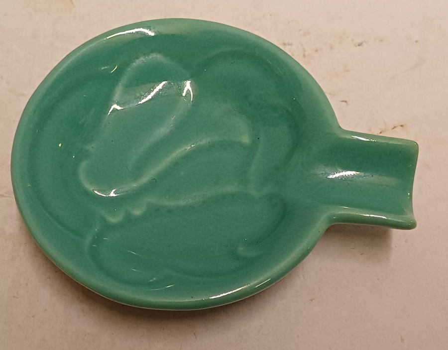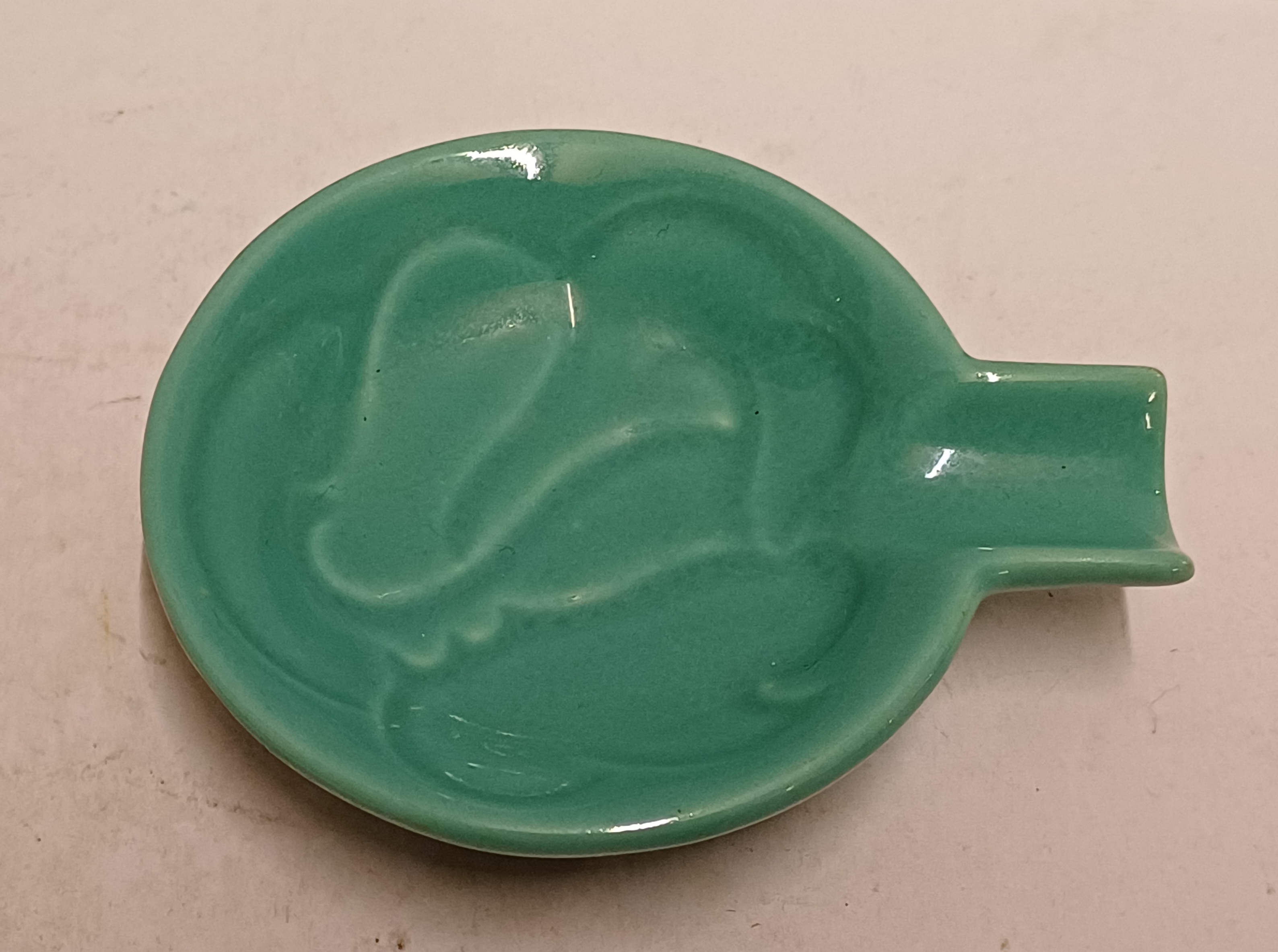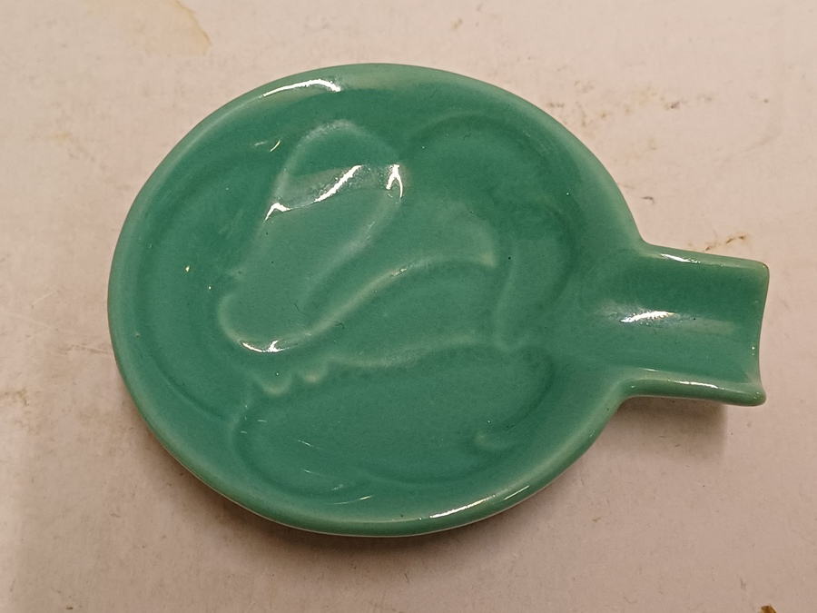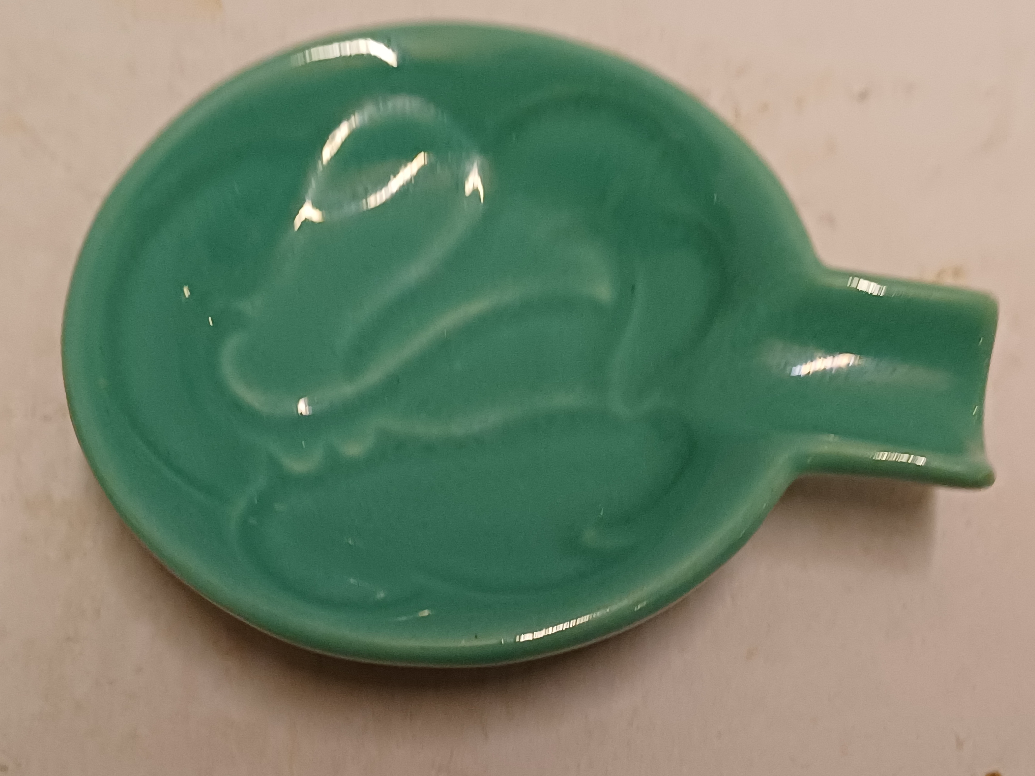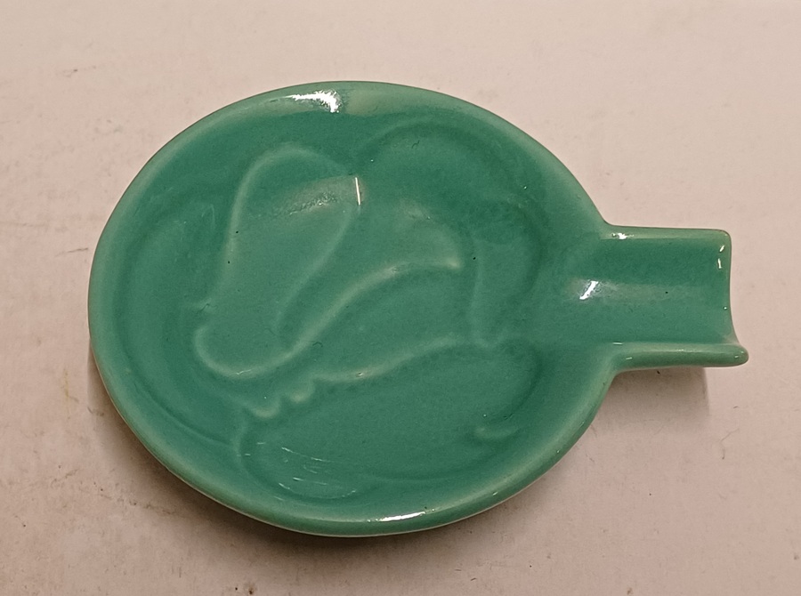 Groen geglazuurd gegoten asbak met grillige decoratie. Onderzijde gemerkt.