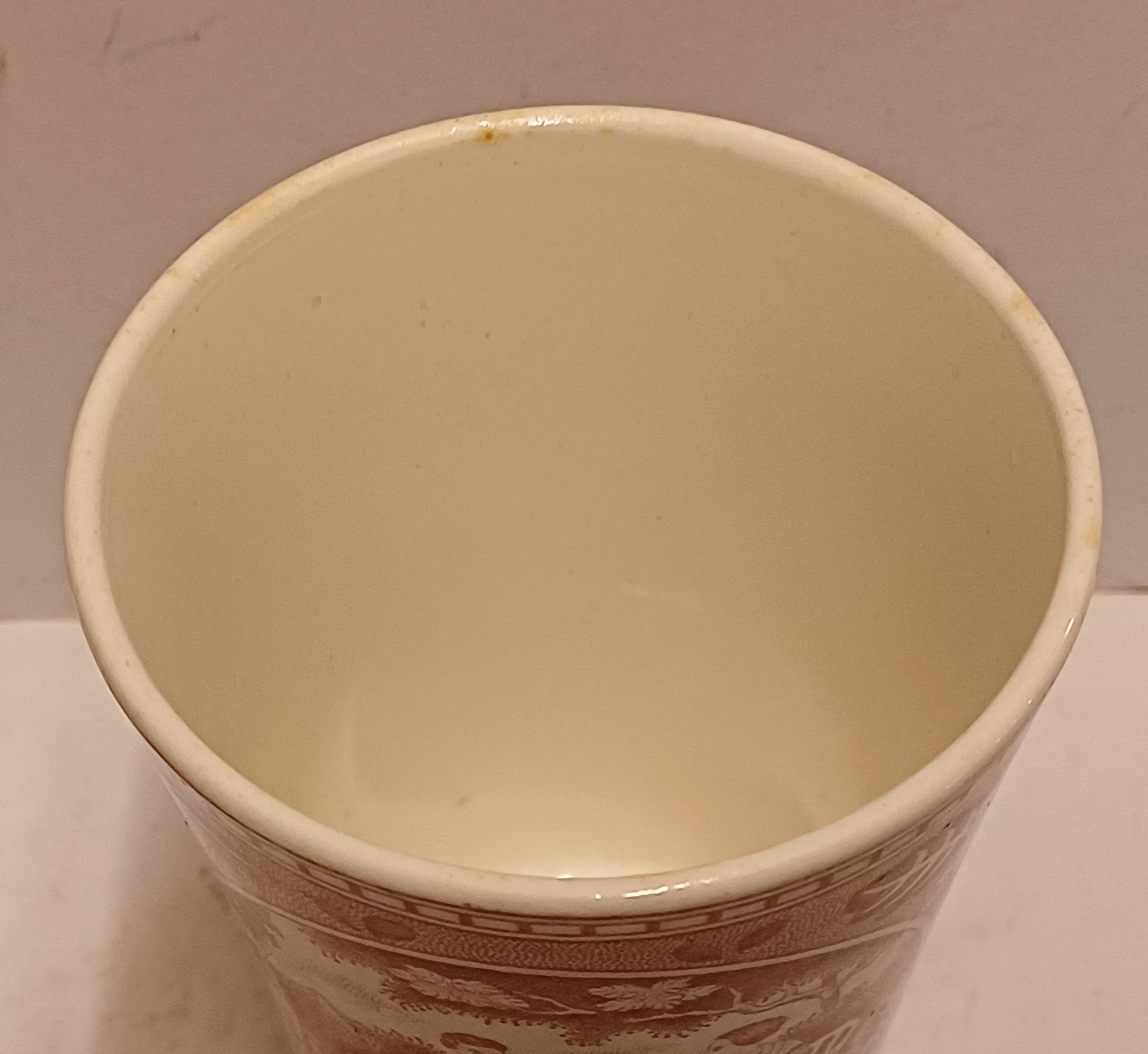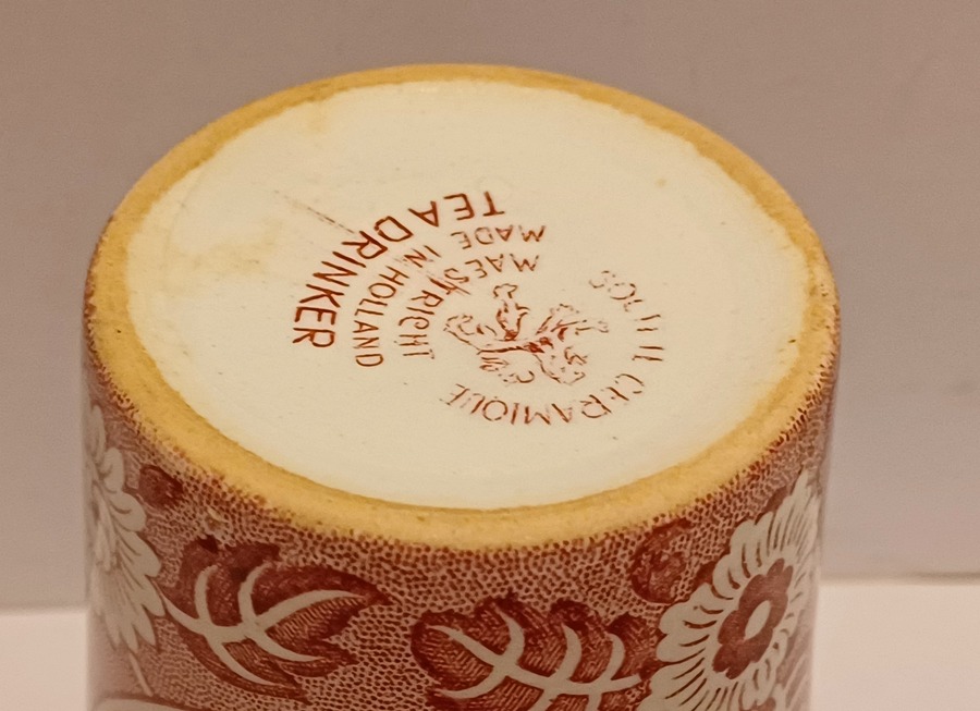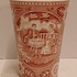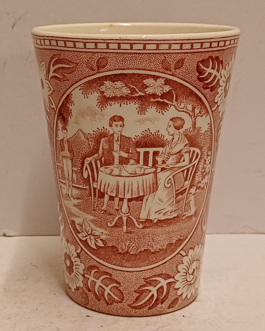 Aardewerken beker met rood transfer decor Tea Drinker. Uitvoering Societe Ceramique Maastricht.