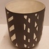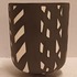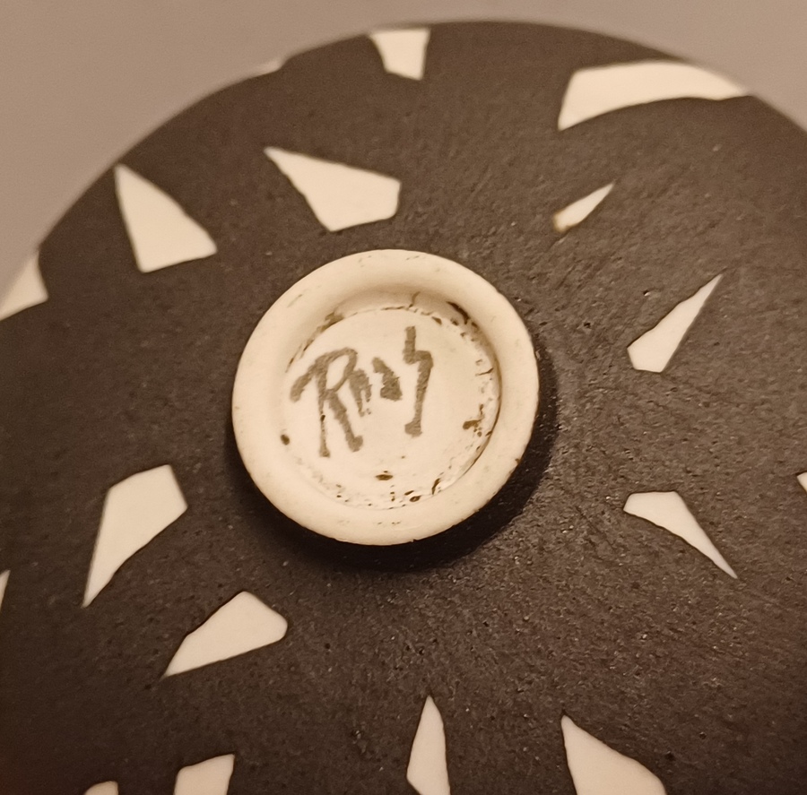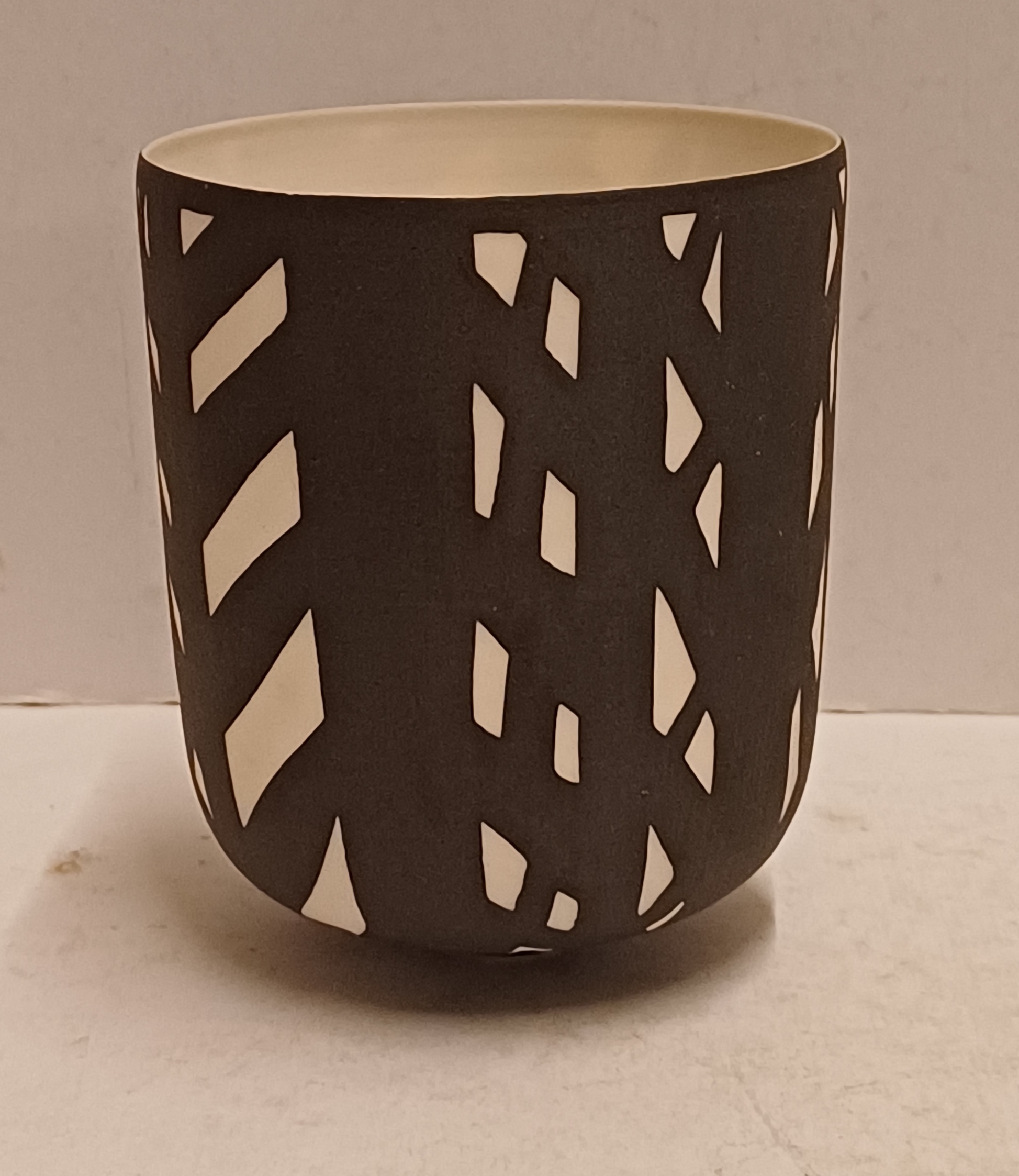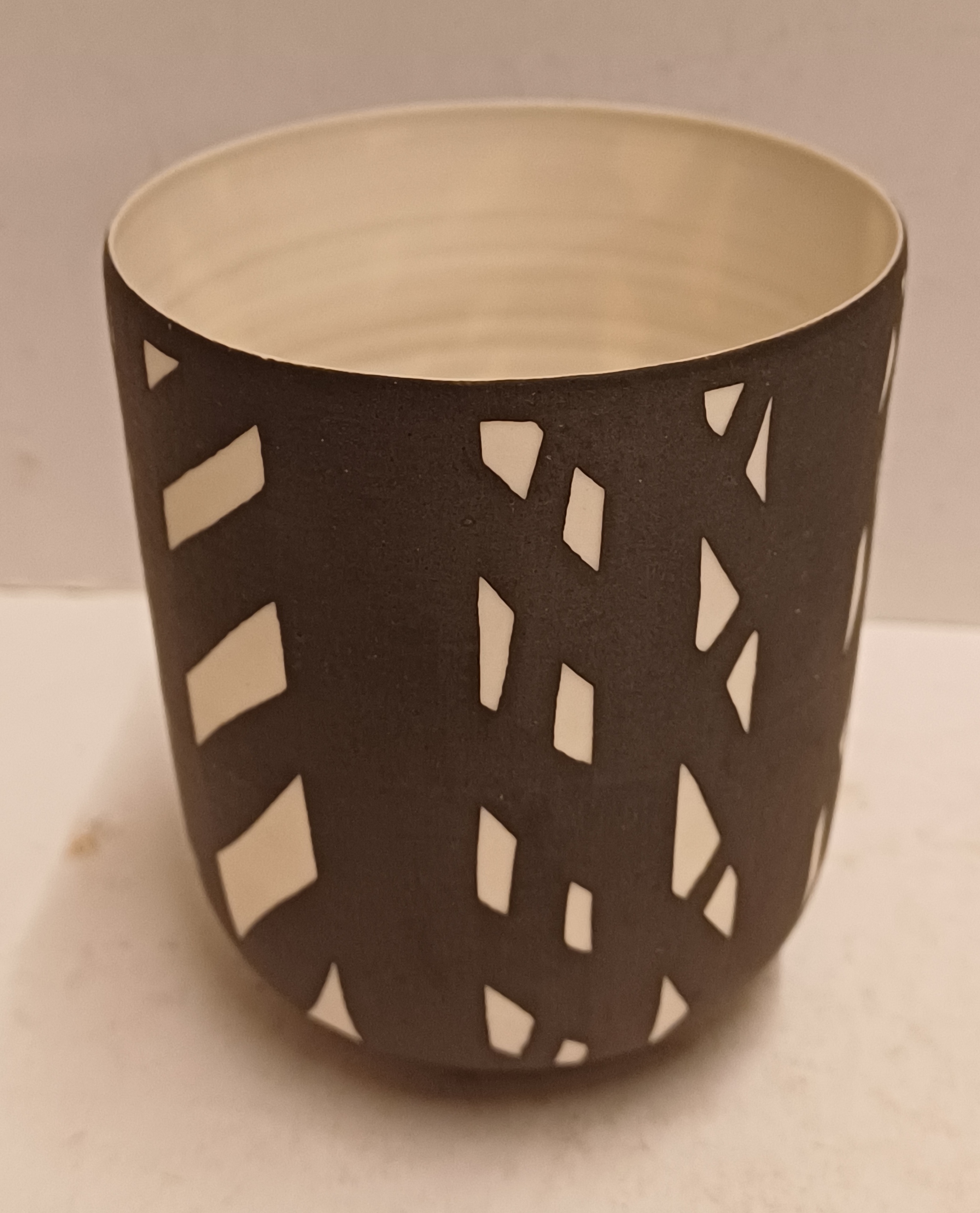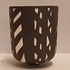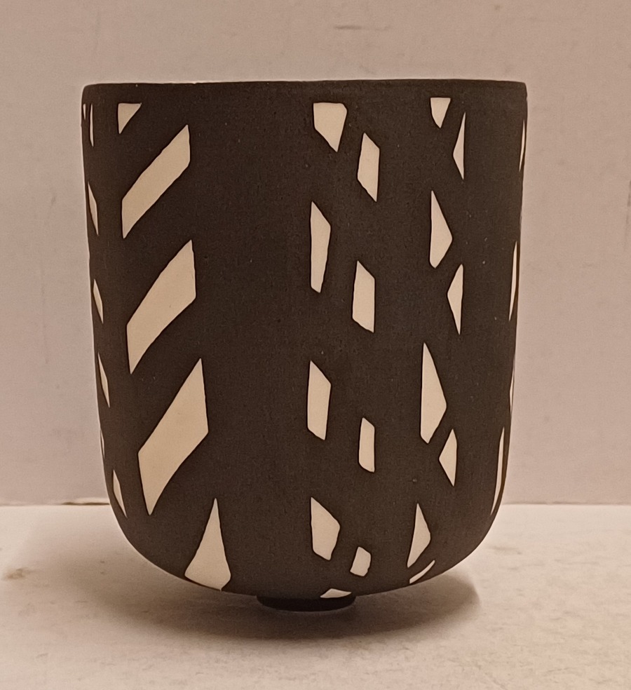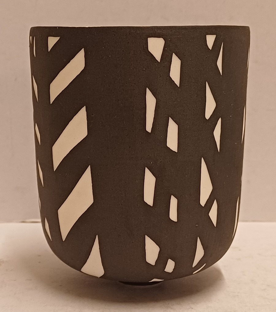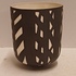 Biscuit porseleinen bekervaasje met zwart geometrisch decor. Onderzijde gesigneerd Roos.