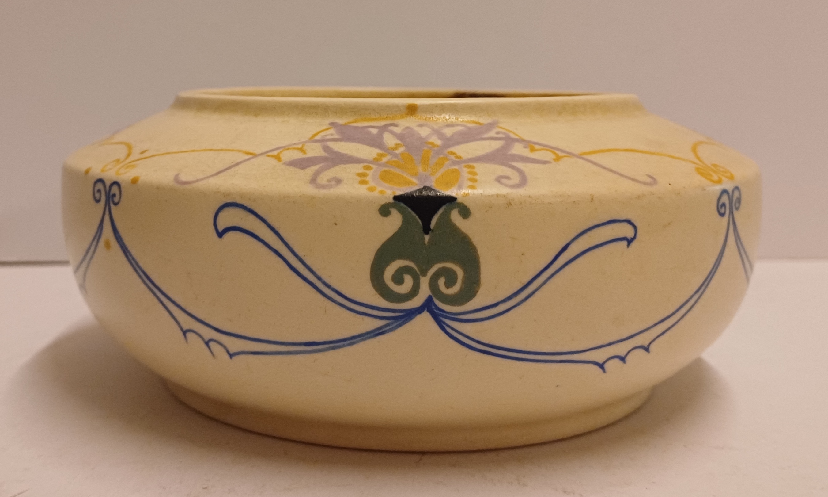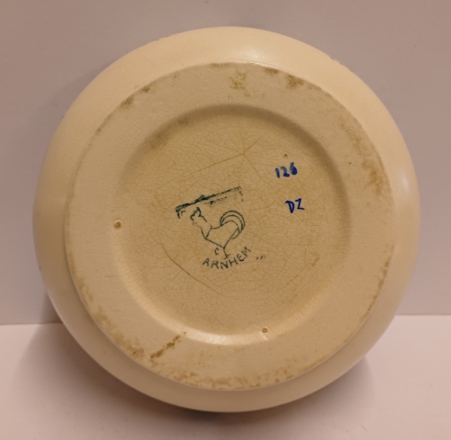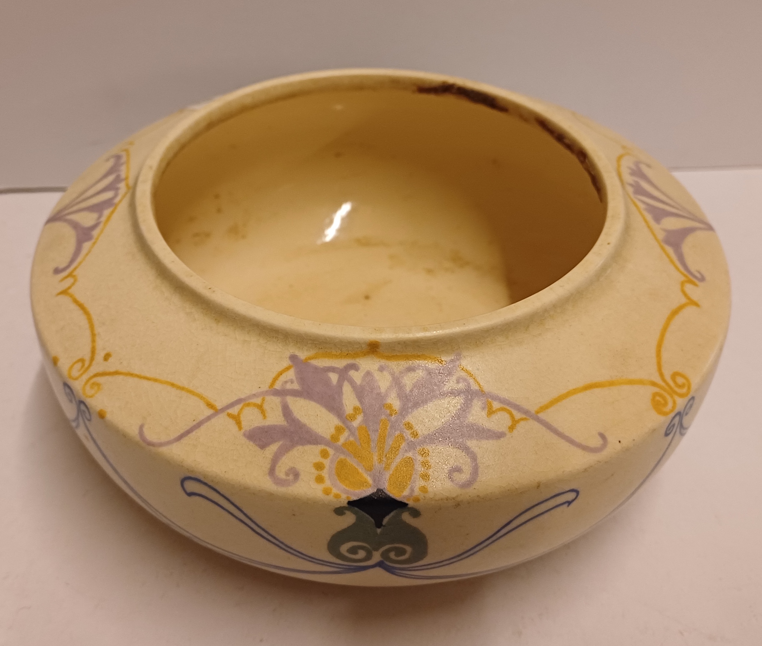 Platelen bloempot met gestileerd lineair decor op creme fond. Onderzijde met fabrieksmerk.