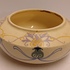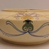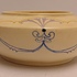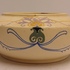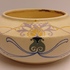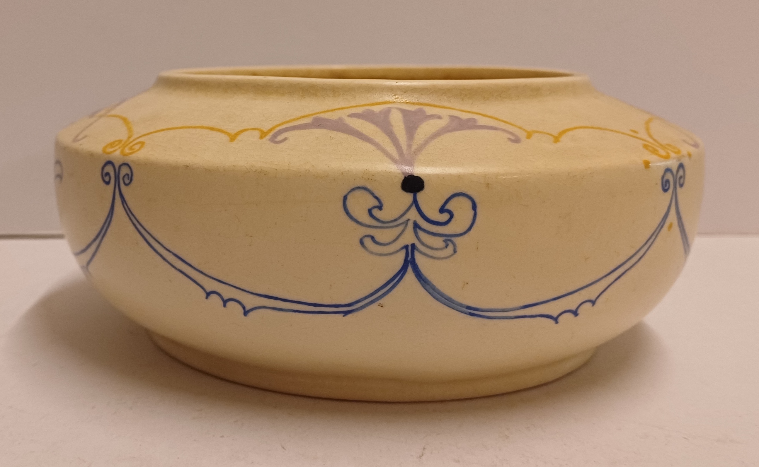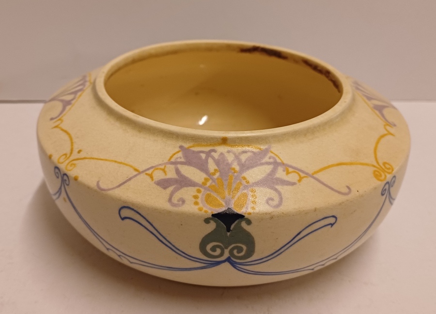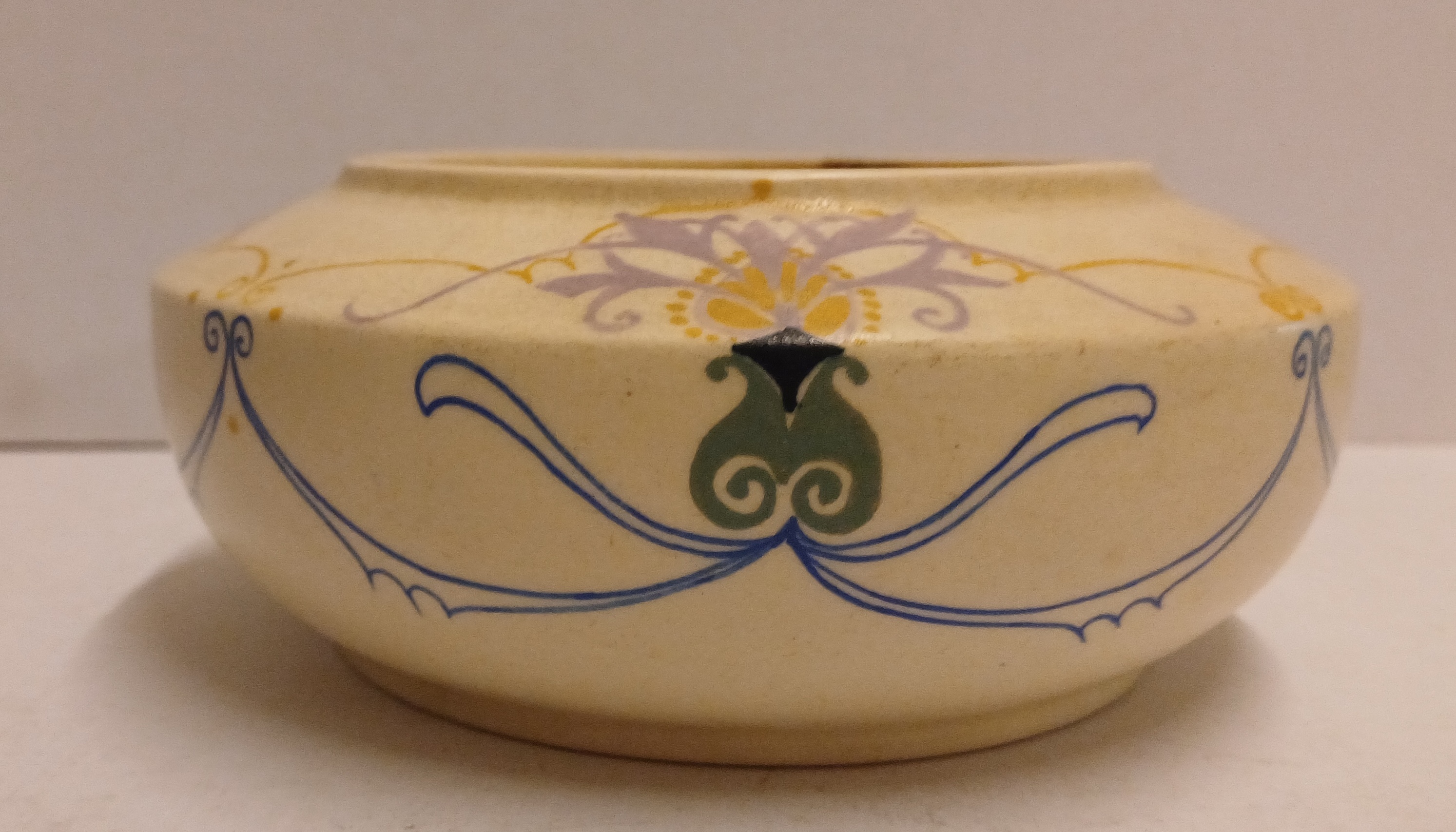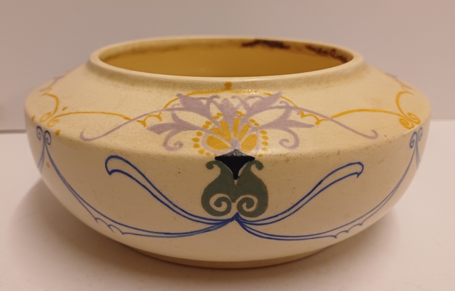 Platelen bloempot met gestileerd lineair decor op creme fond. Onderzijde met fabrieksmerk.