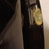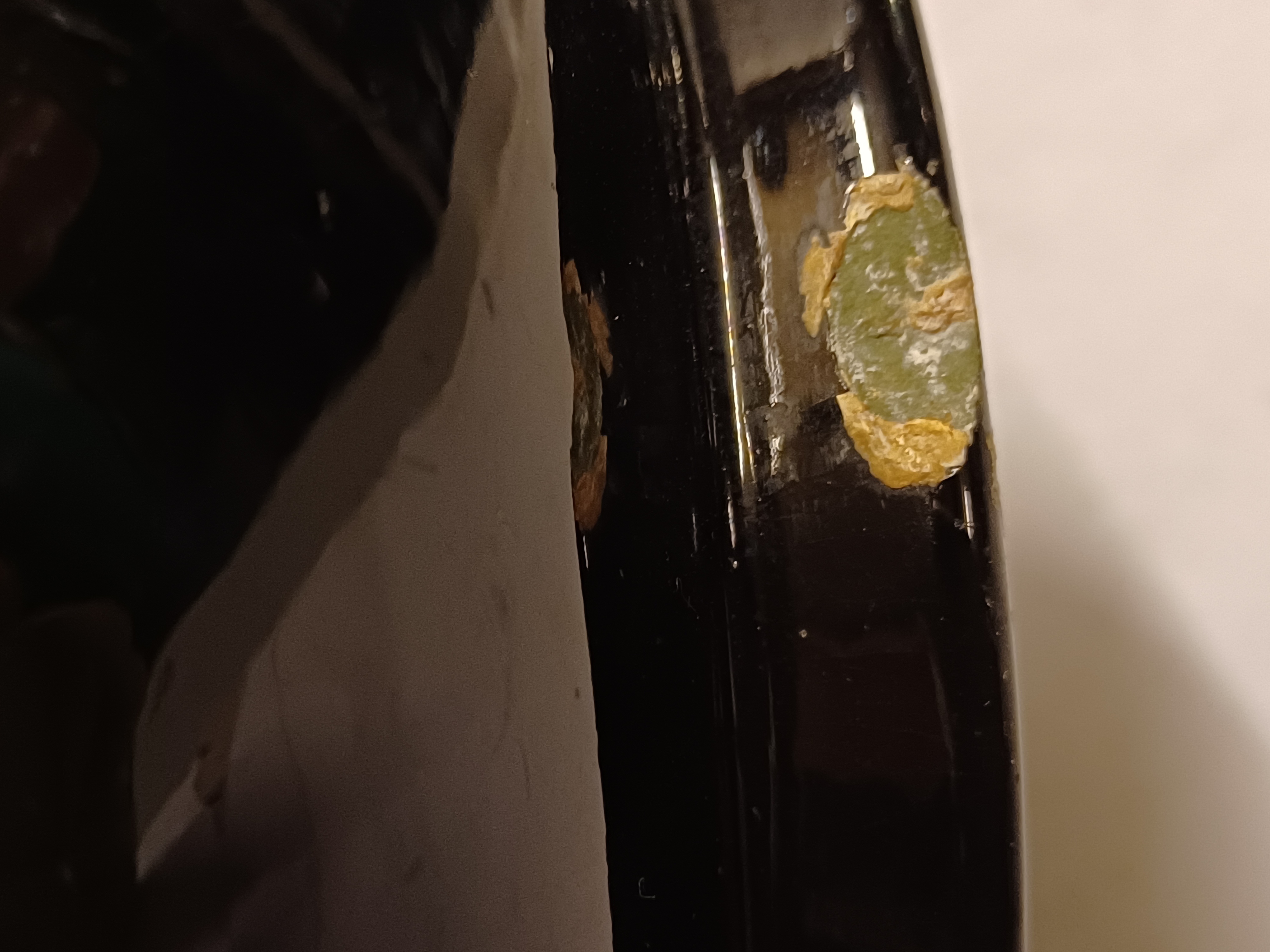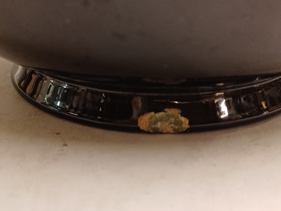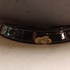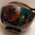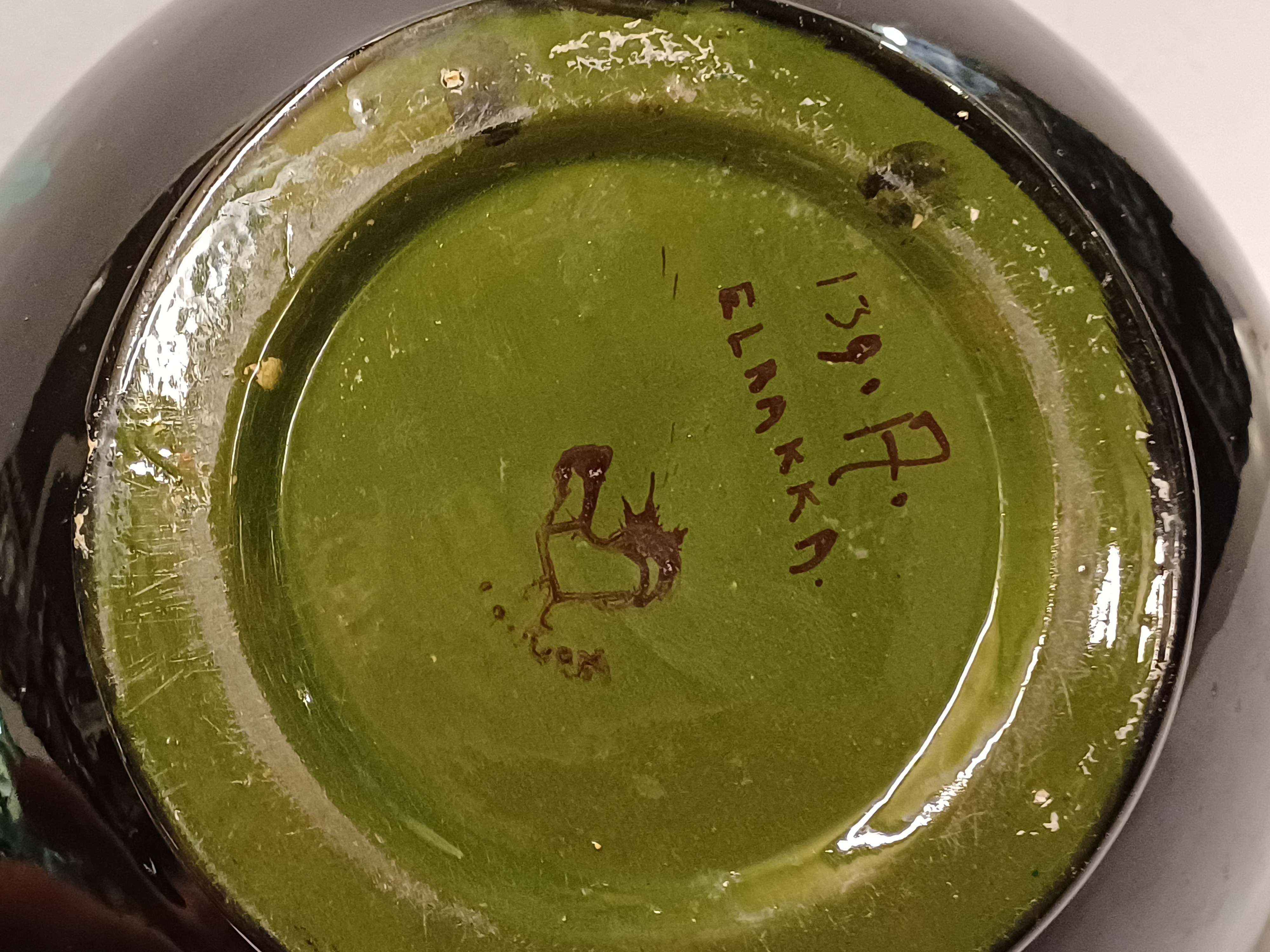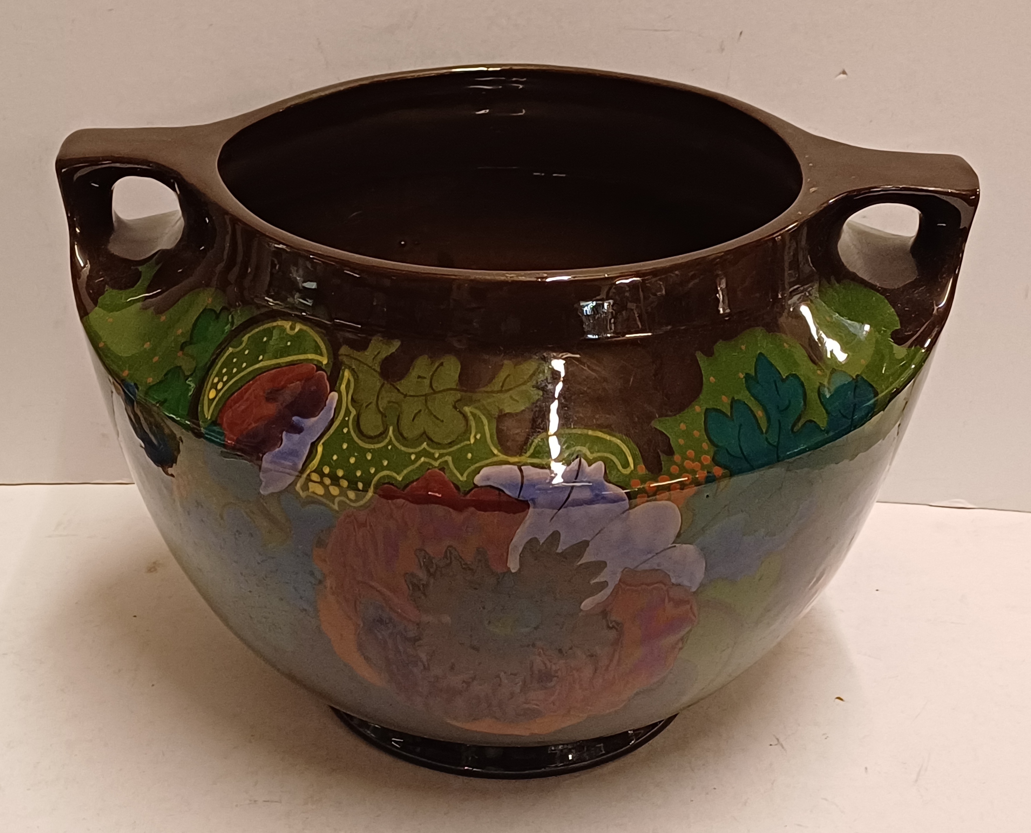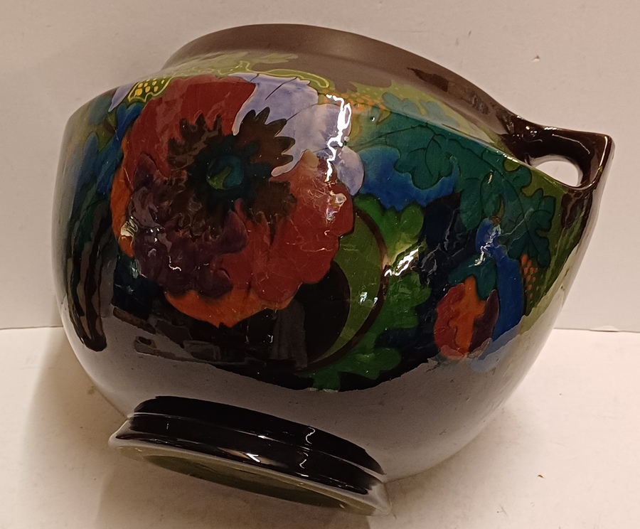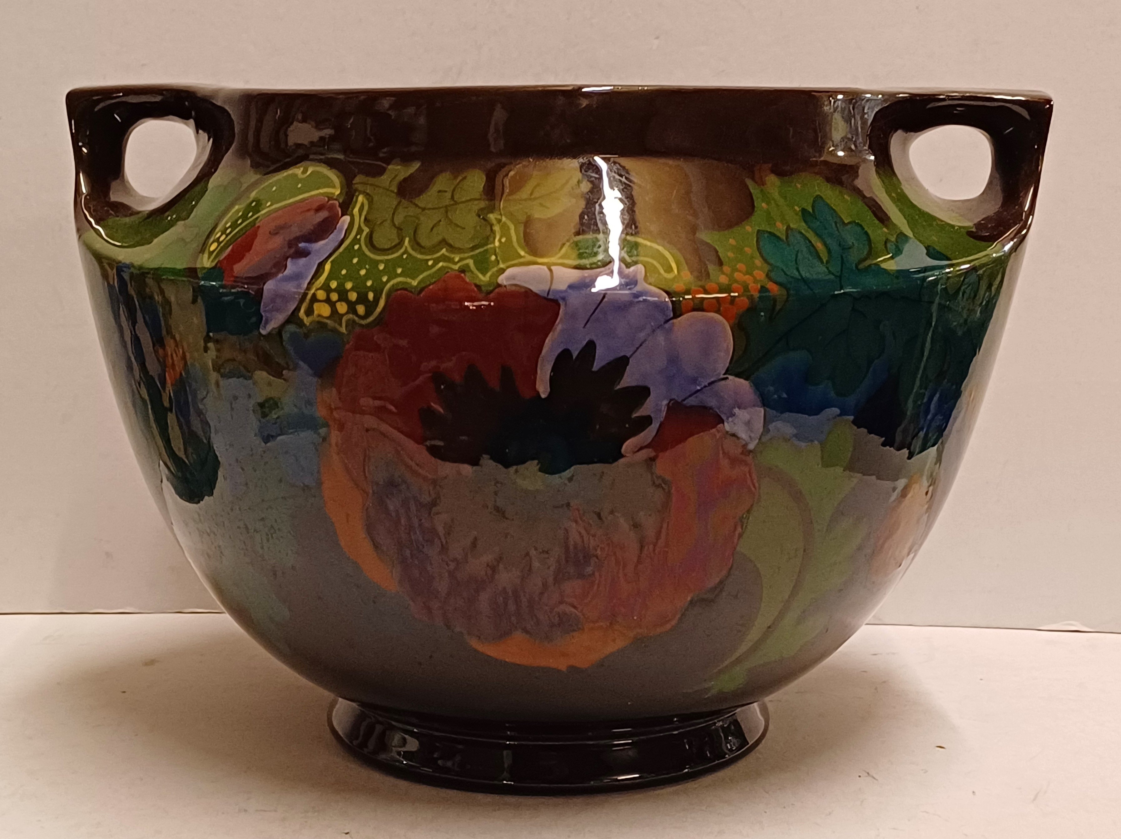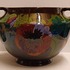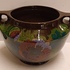 Glansplatelen bloempot met floraal decor op donker fond. Onderzijde met fabrieksmerk.