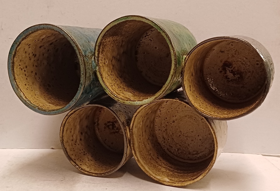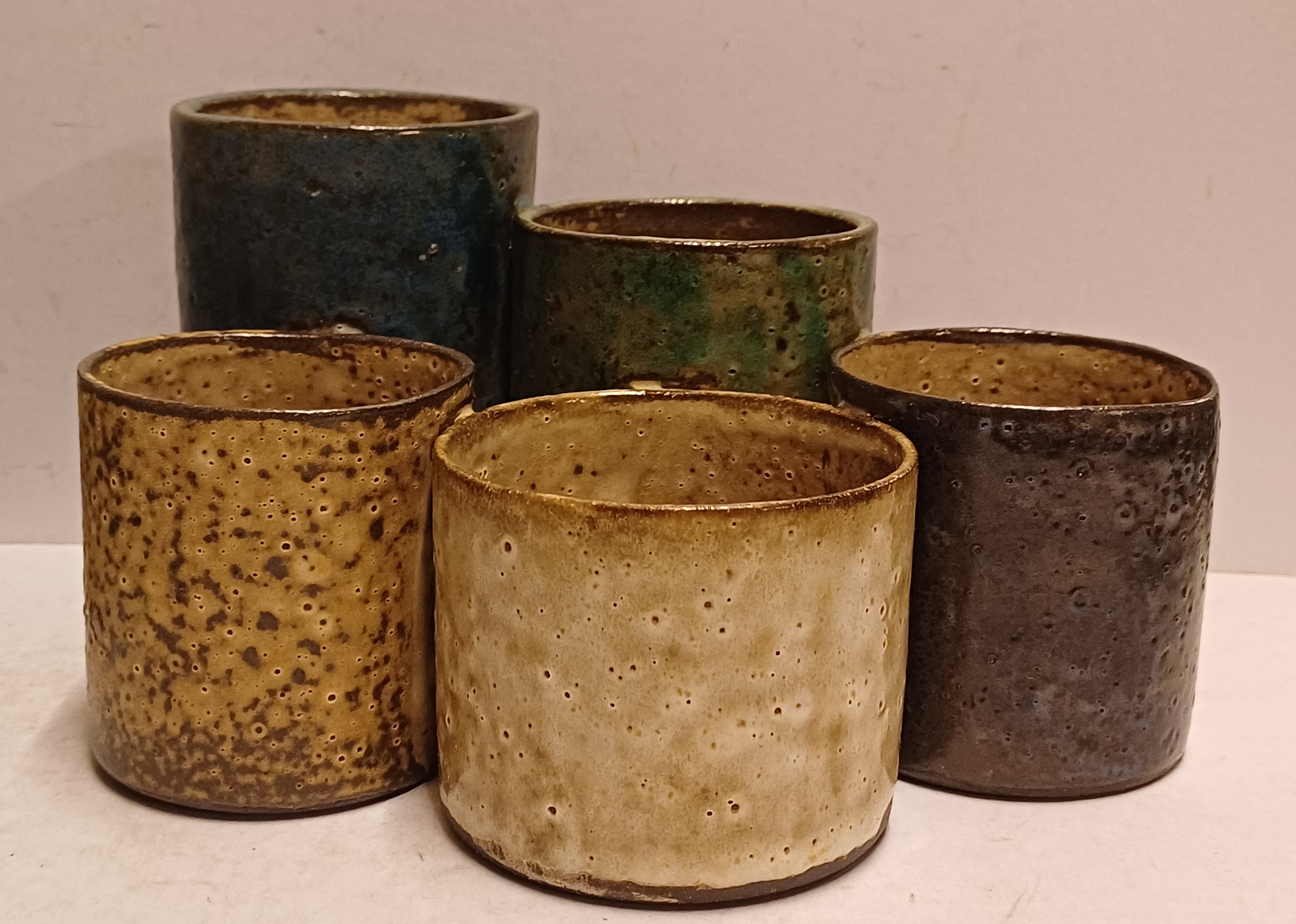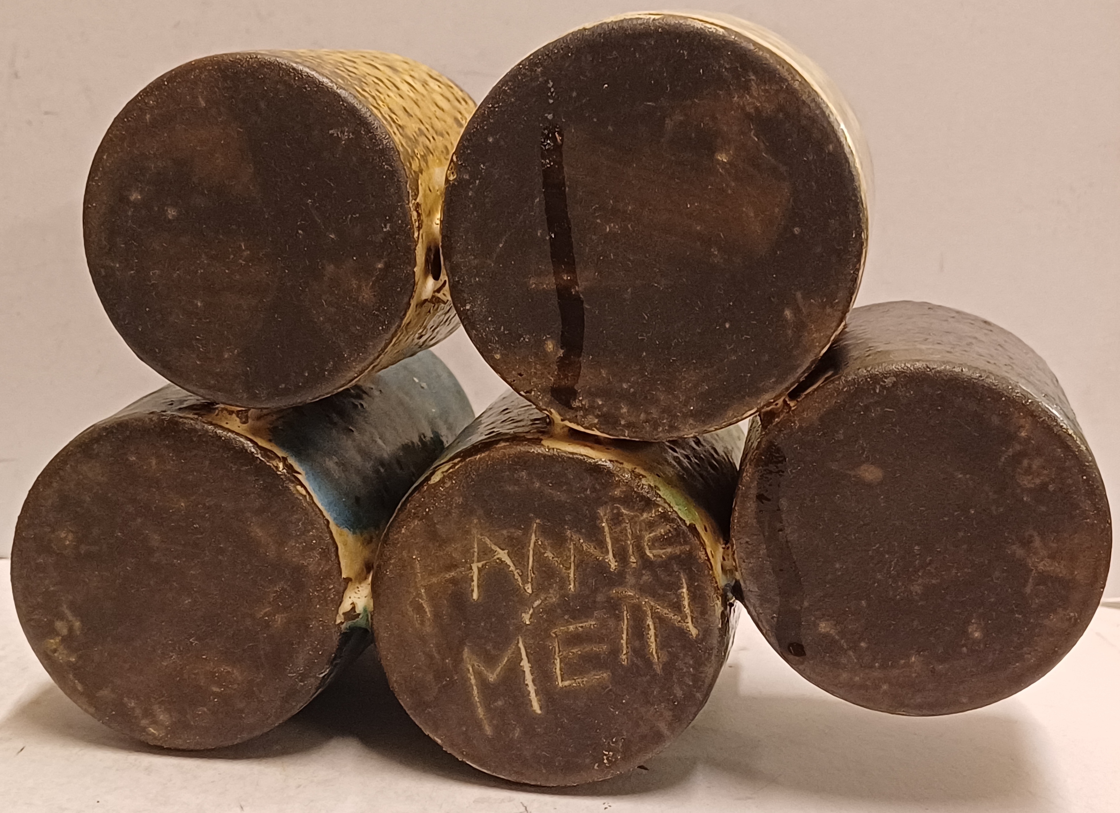 Een geschakelde reeks met bloempotjes met verschillende glazuren. Onderzijde gemerkt.