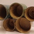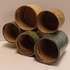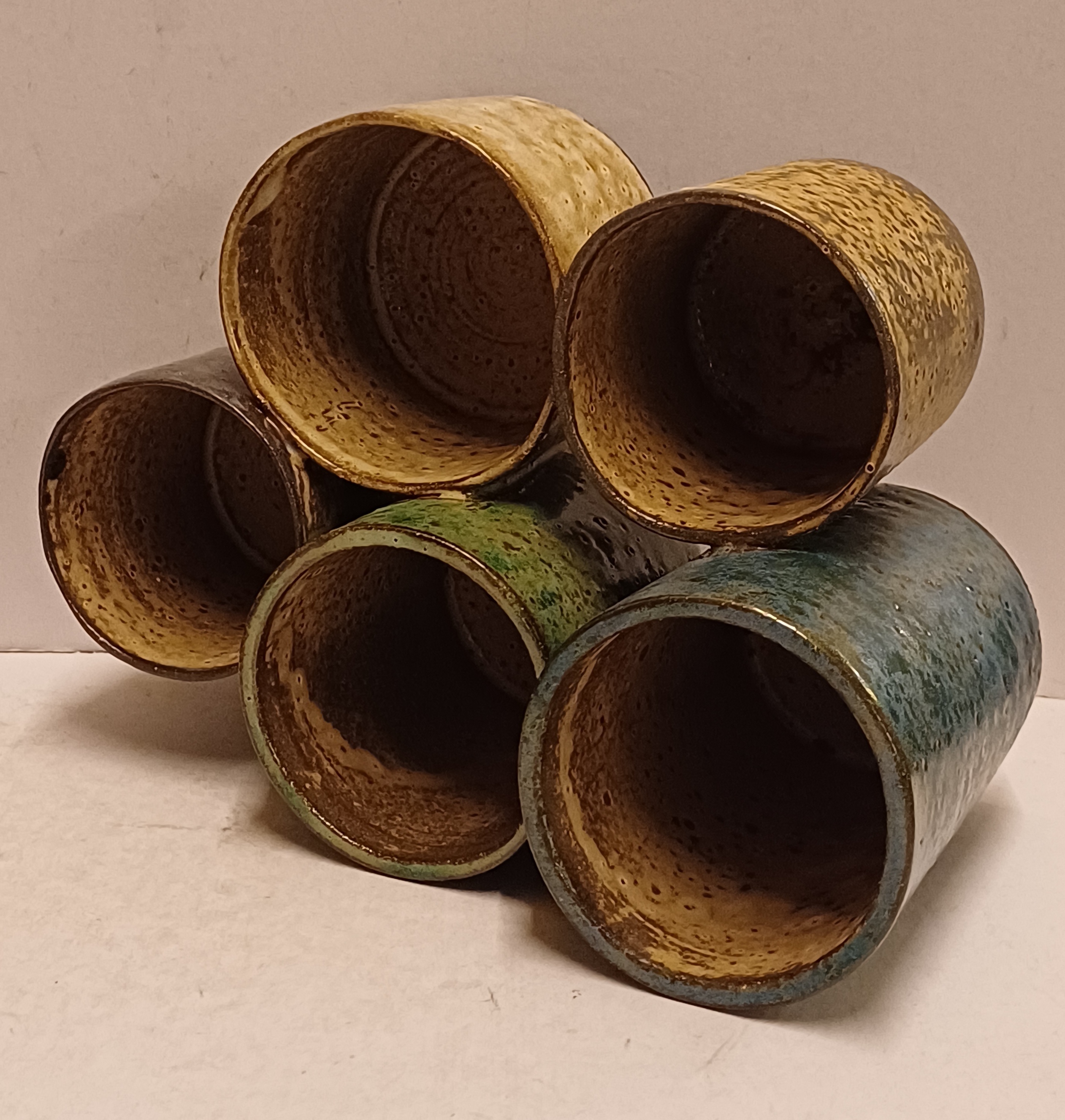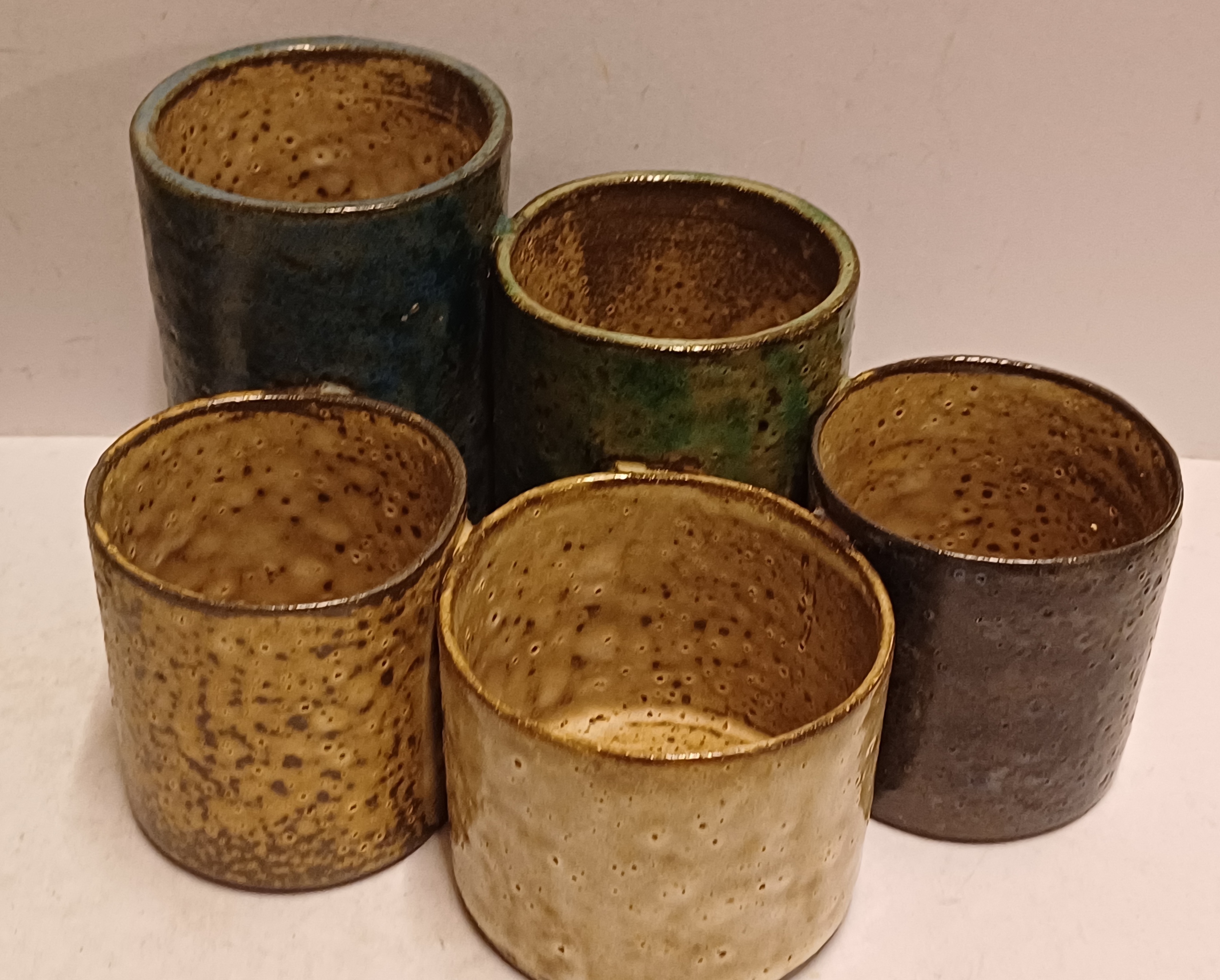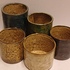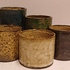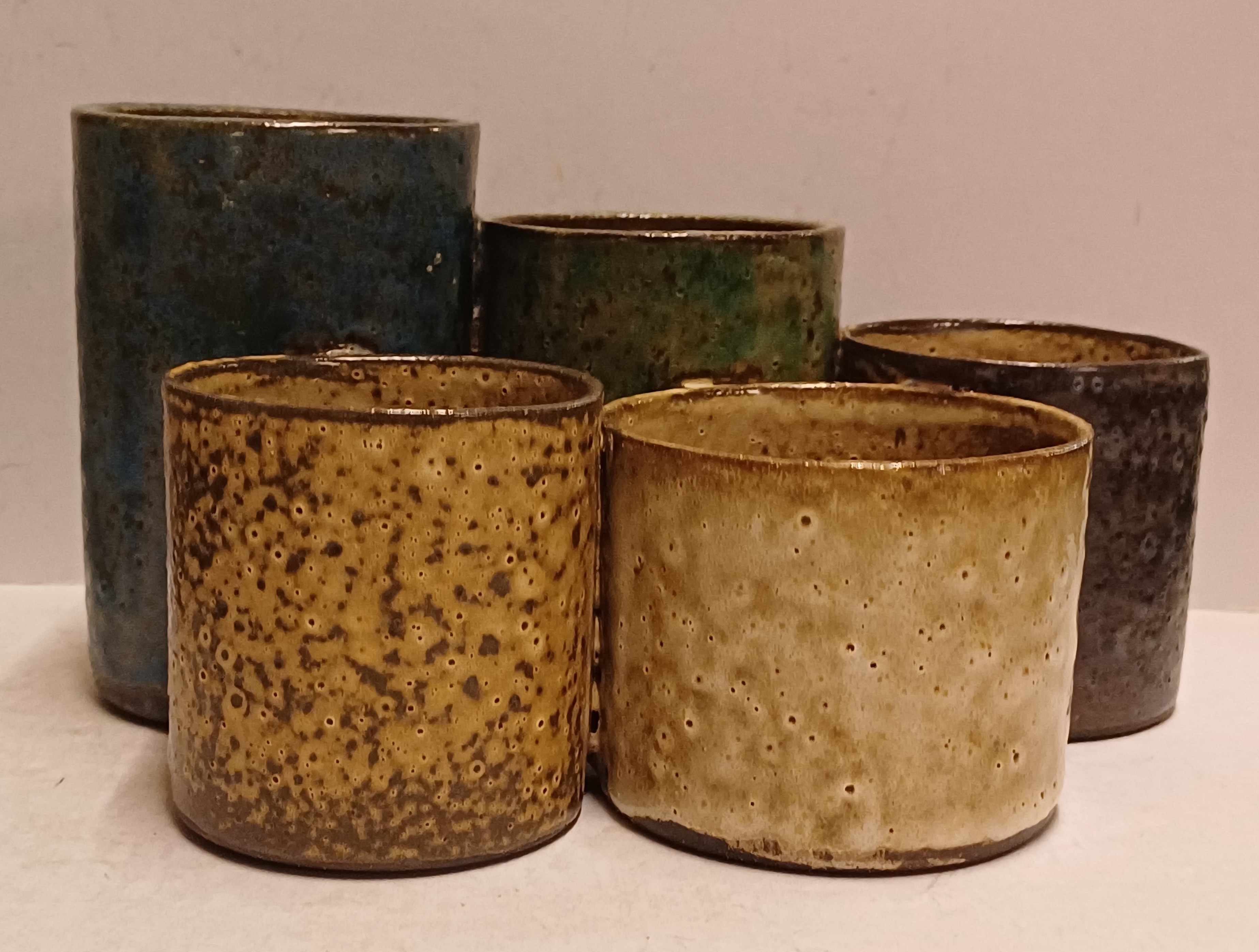 Een geschakelde reeks met bloempotjes met verschillende glazuren. Onderzijde gemerkt.