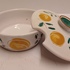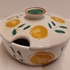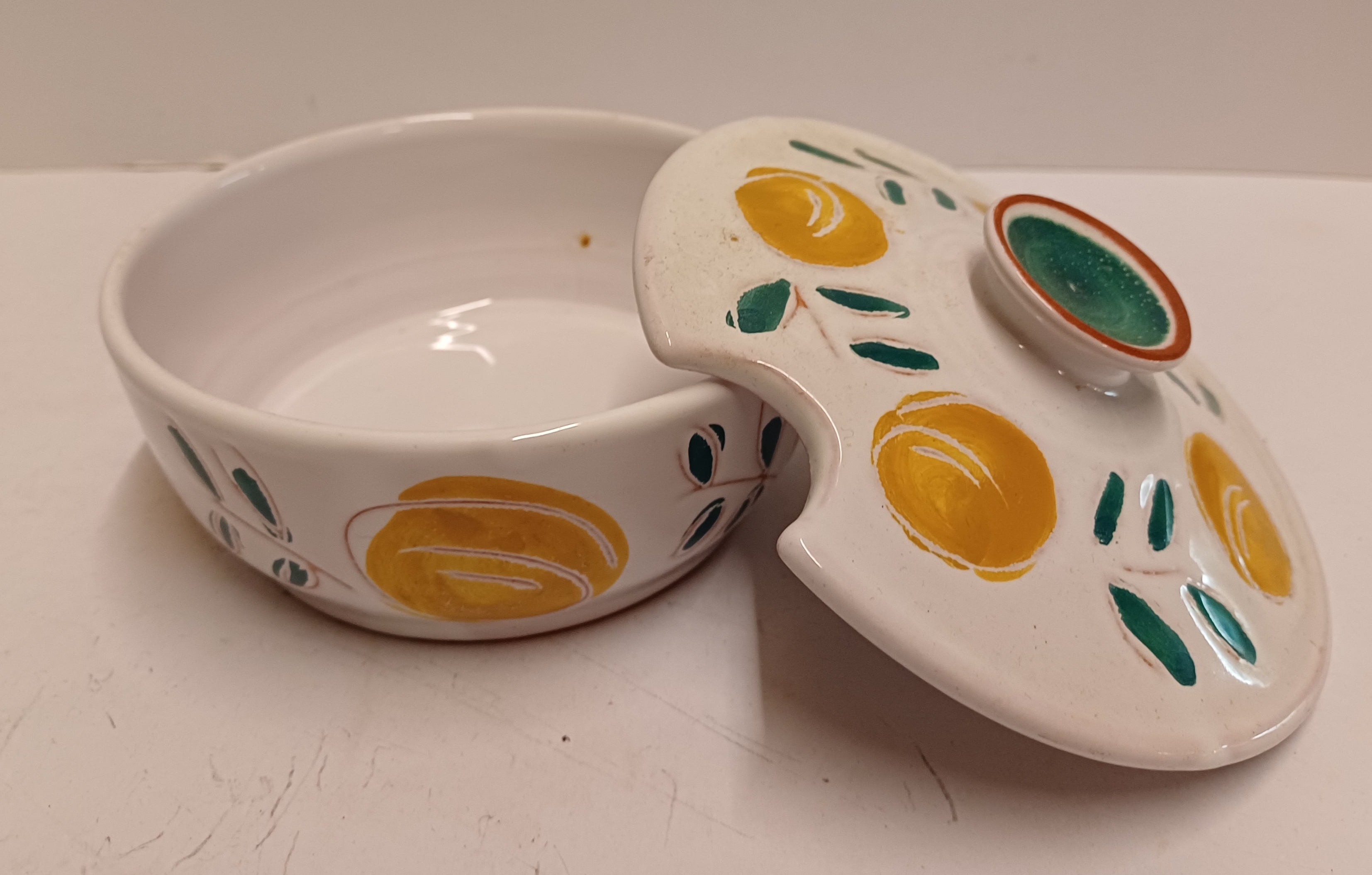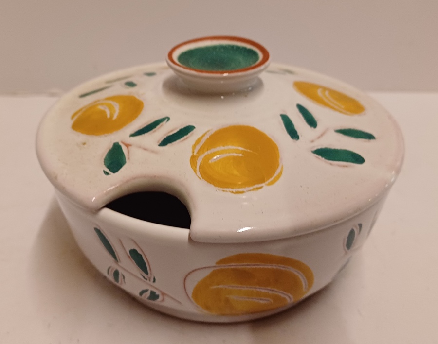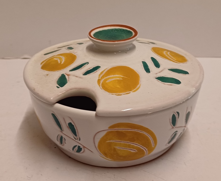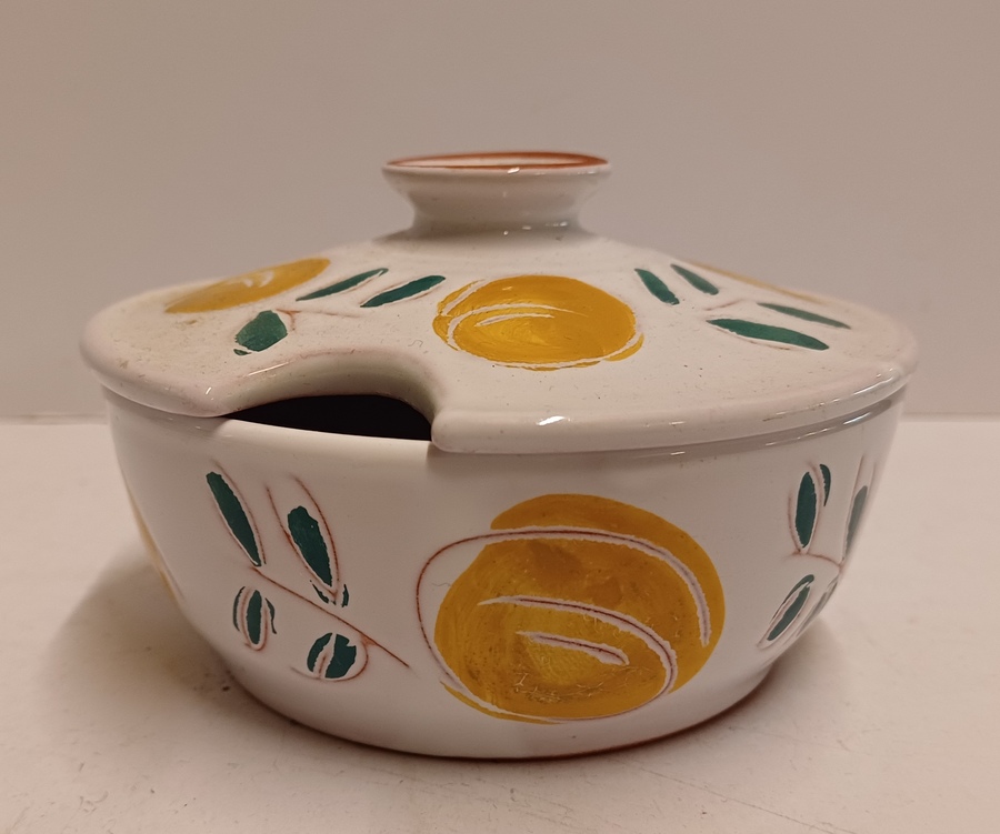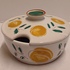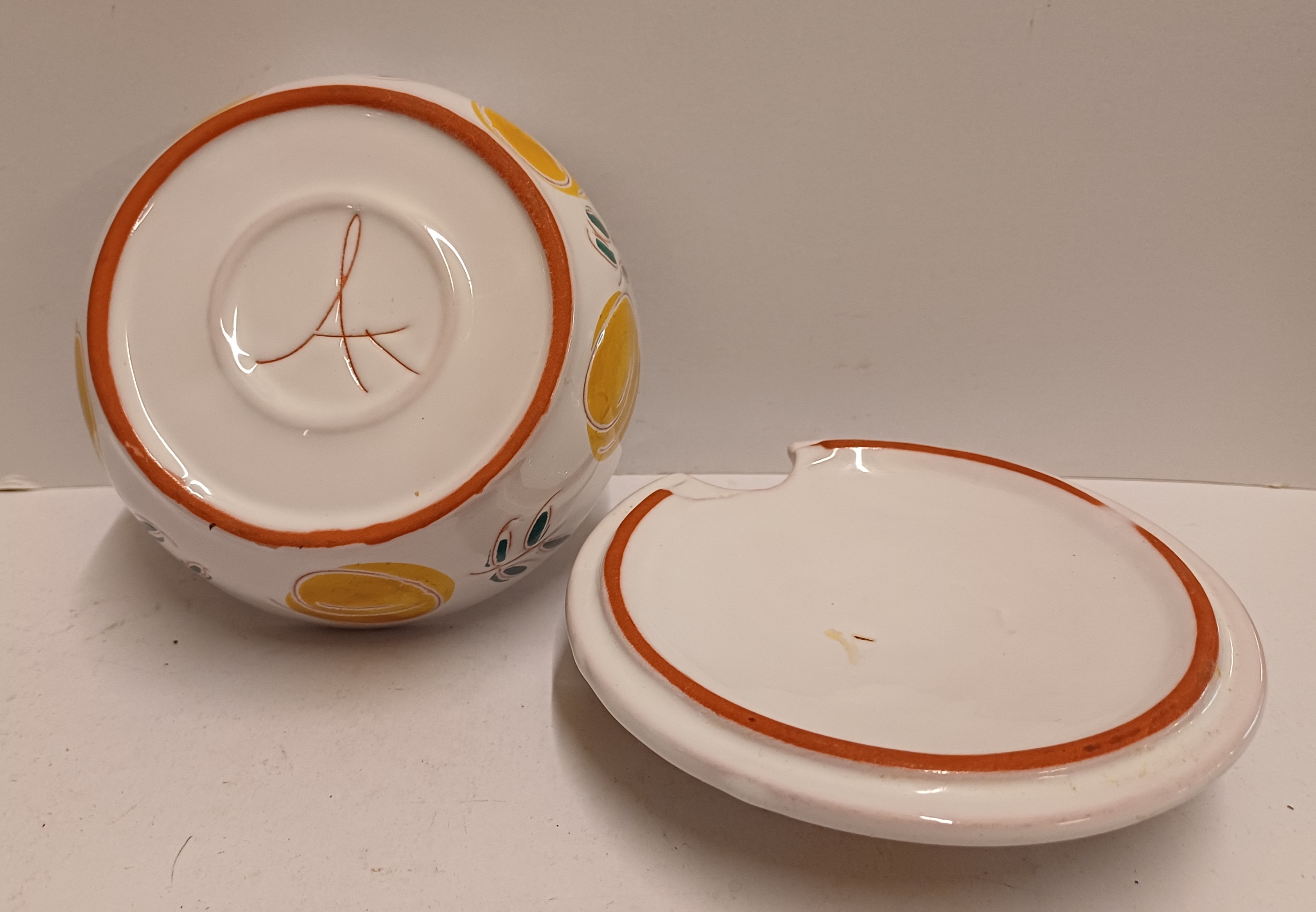 Bonbon schaaltje met tinglazuur en decor van vruchten. Onderzijde met signatuur A...