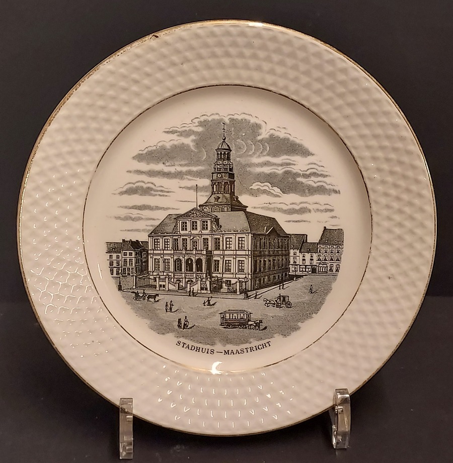 Monochroom zwart decor Stadhuis Maastricht. Achterzijde gemerkt en turfdatering 1889.
