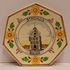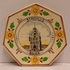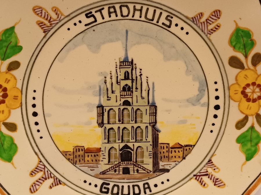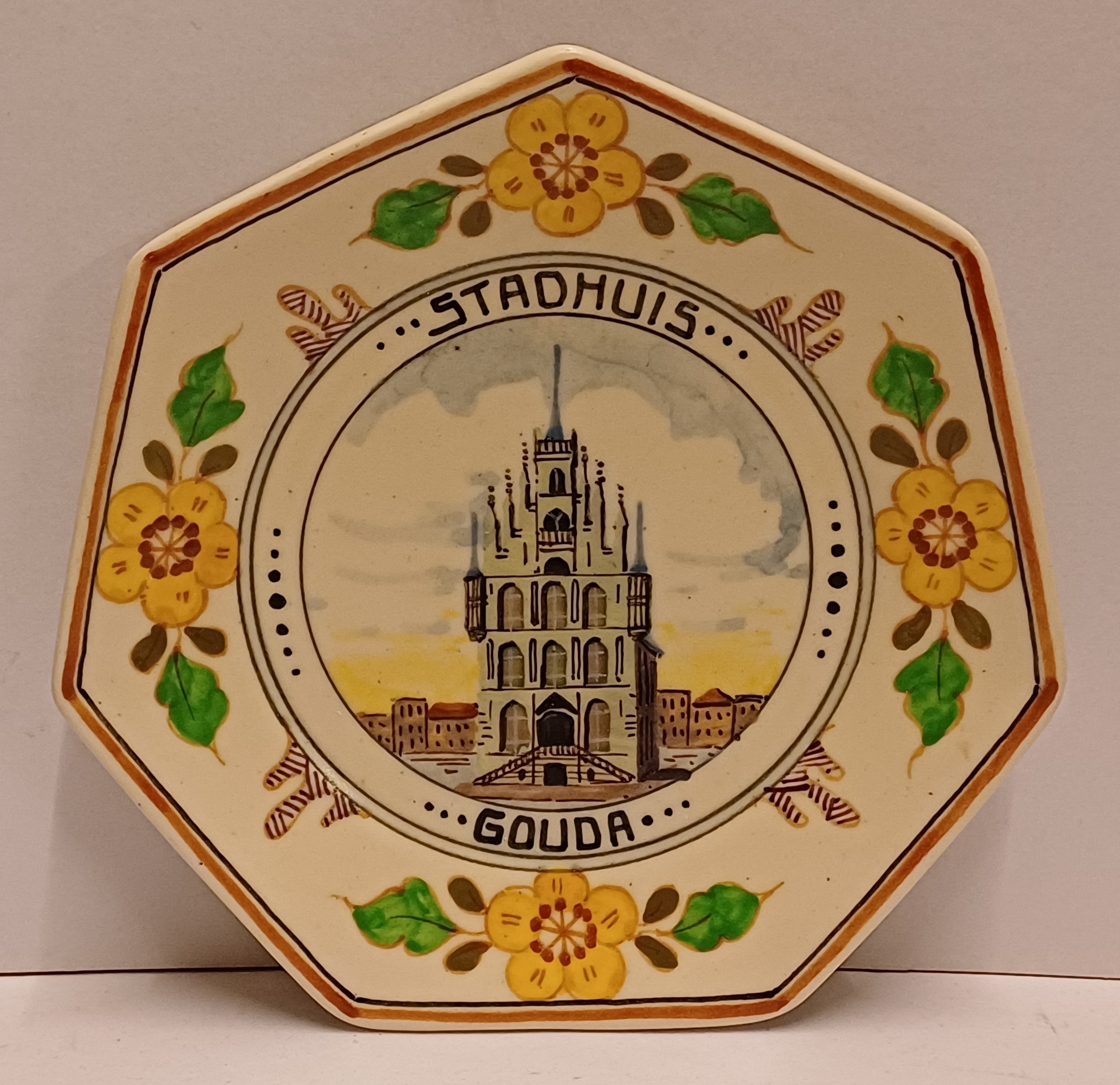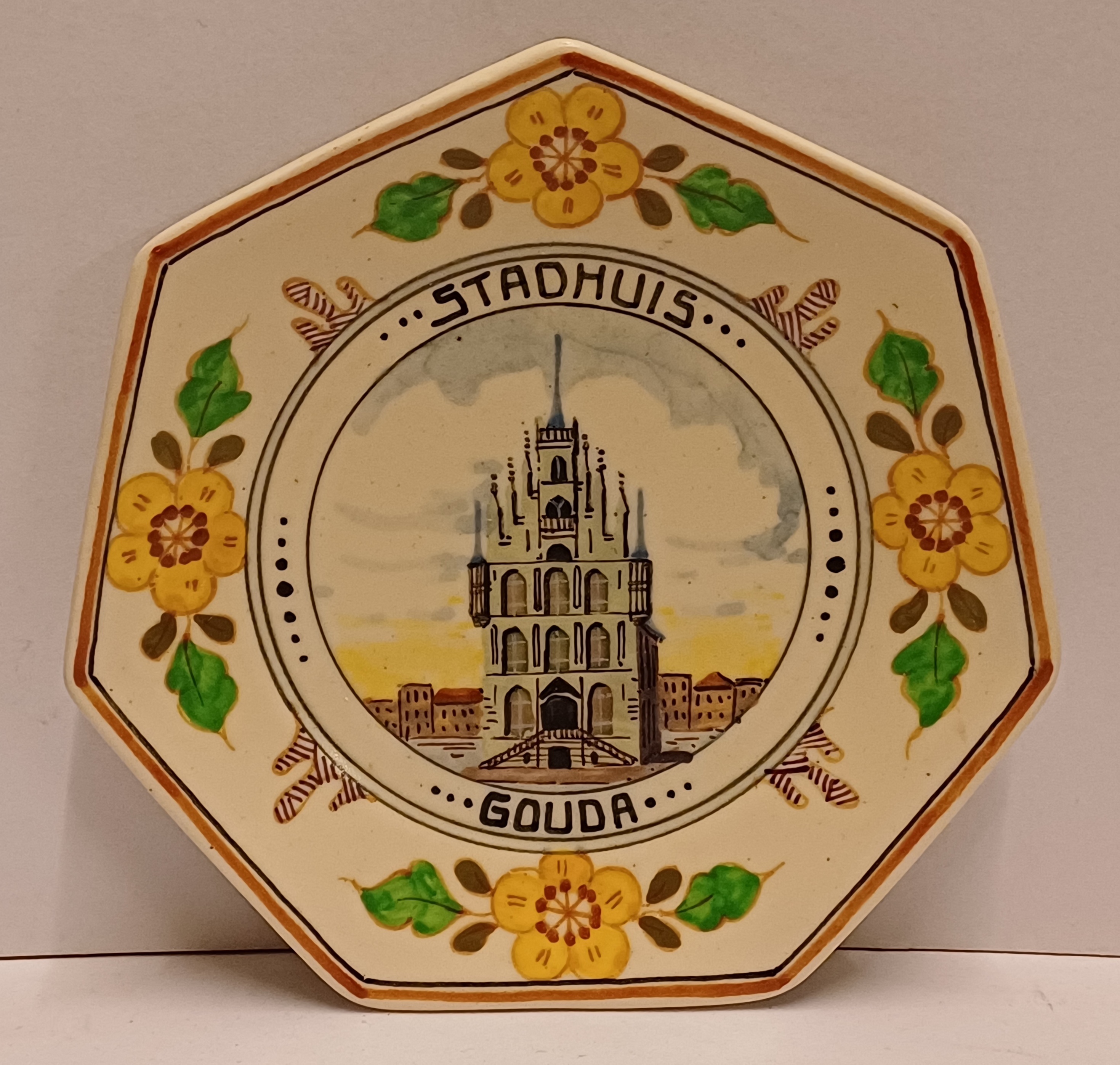 7-kantig bordje met in het midden geschilderde voorstelling van de waag te Gouda. Daaromheen gedecoreerd met bloemen. Achterzijde gesigneerd.