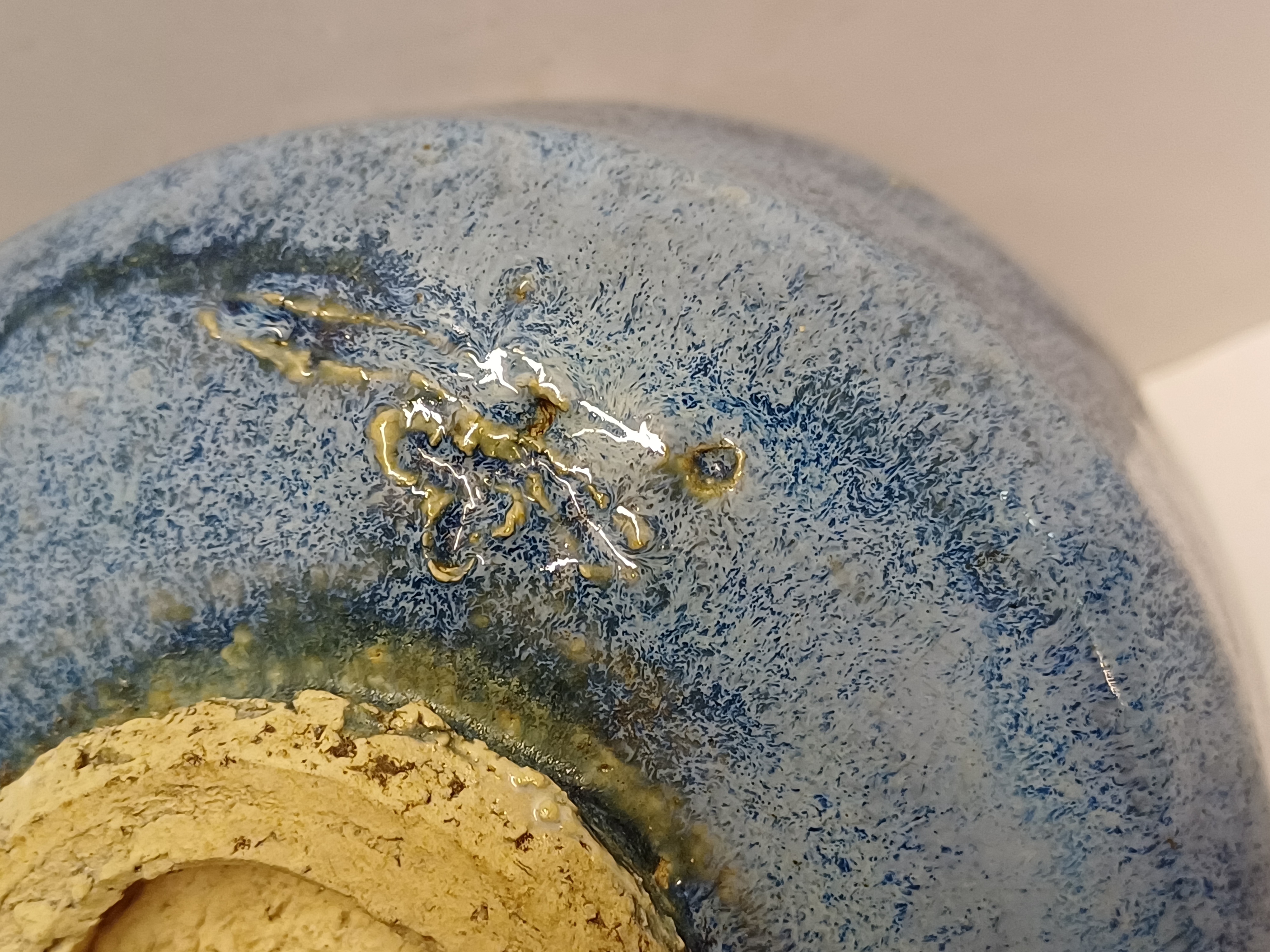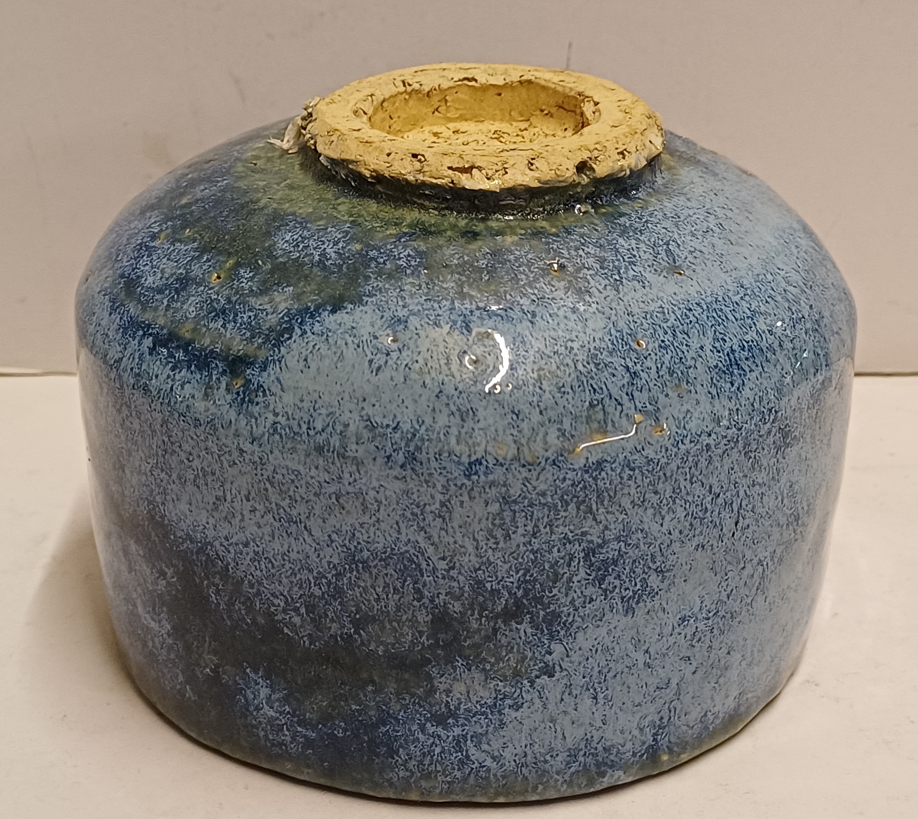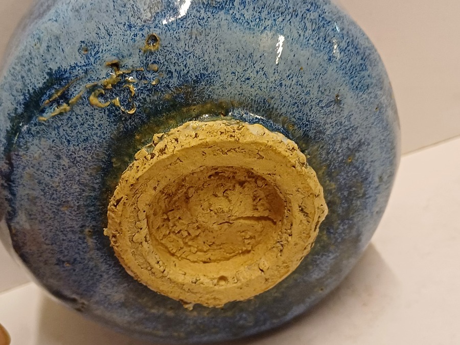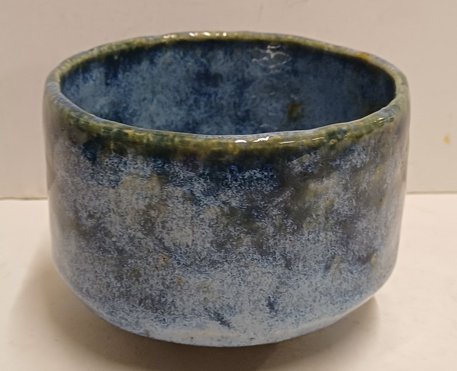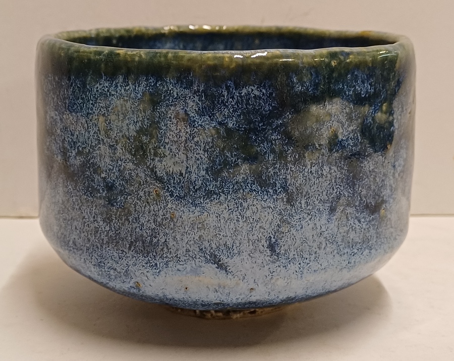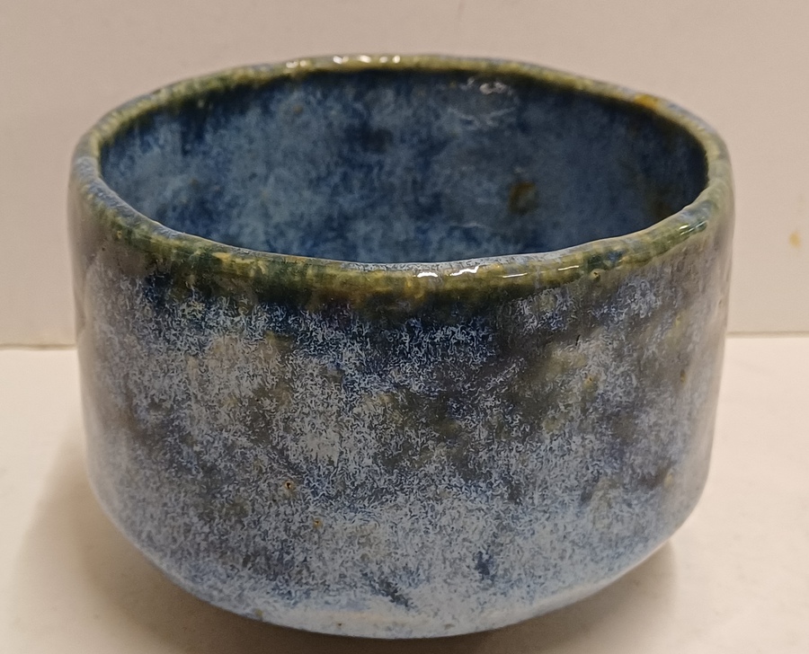 Aardewerken kom met blauwe glazuur. Onderzijde met Japanse signatuur.
