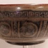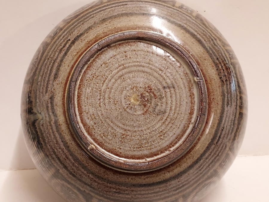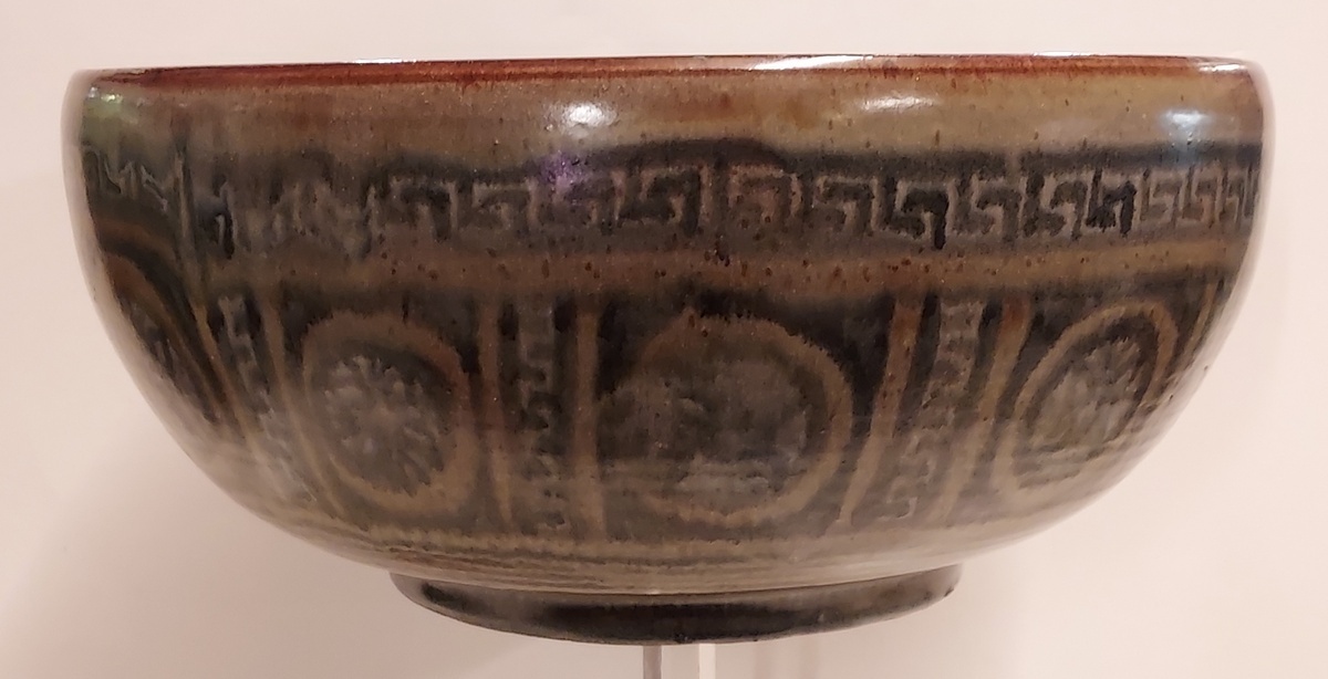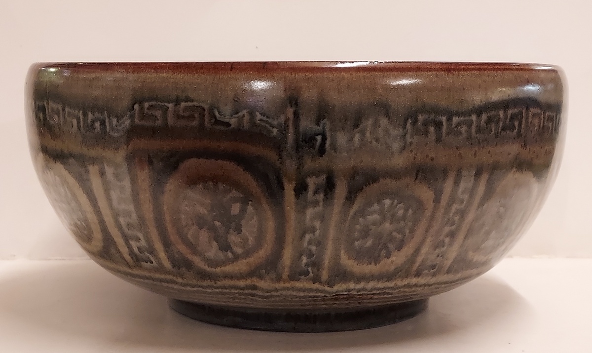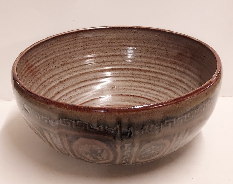 Grote kom met aan de buitenzijde repeterend patroon. Onderzijde met signatuur.