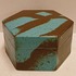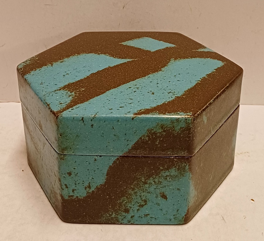 Aardewerken 6-kantige dekseldoos met blauw grijze glazuur en gouden binnenzijde. Onderzijde met kunstenaars monogram.