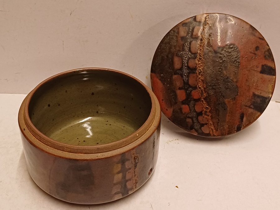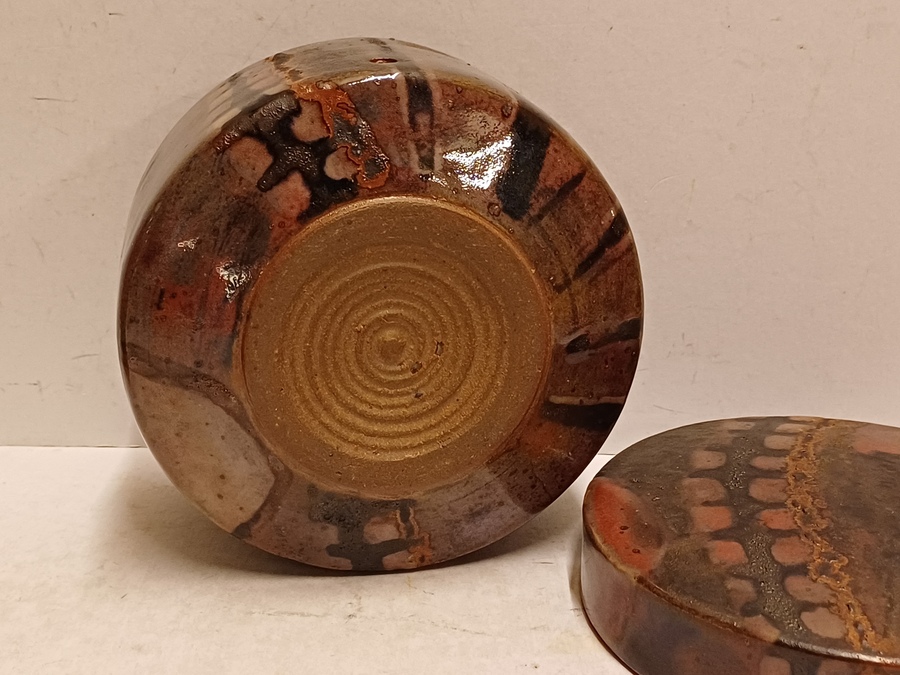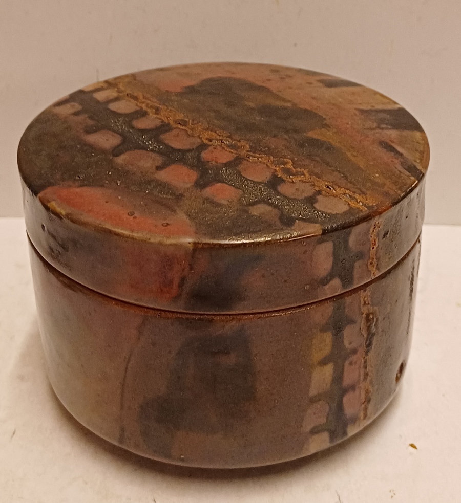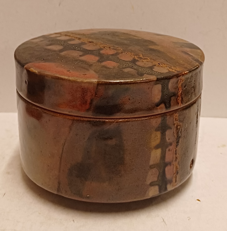 Ronde steengoed dekseldoos met donkere glazuur en stippen patroon. Zijkant gemerkt met kunstenaars merk.