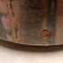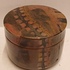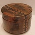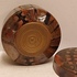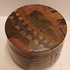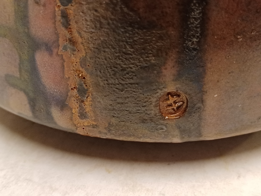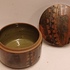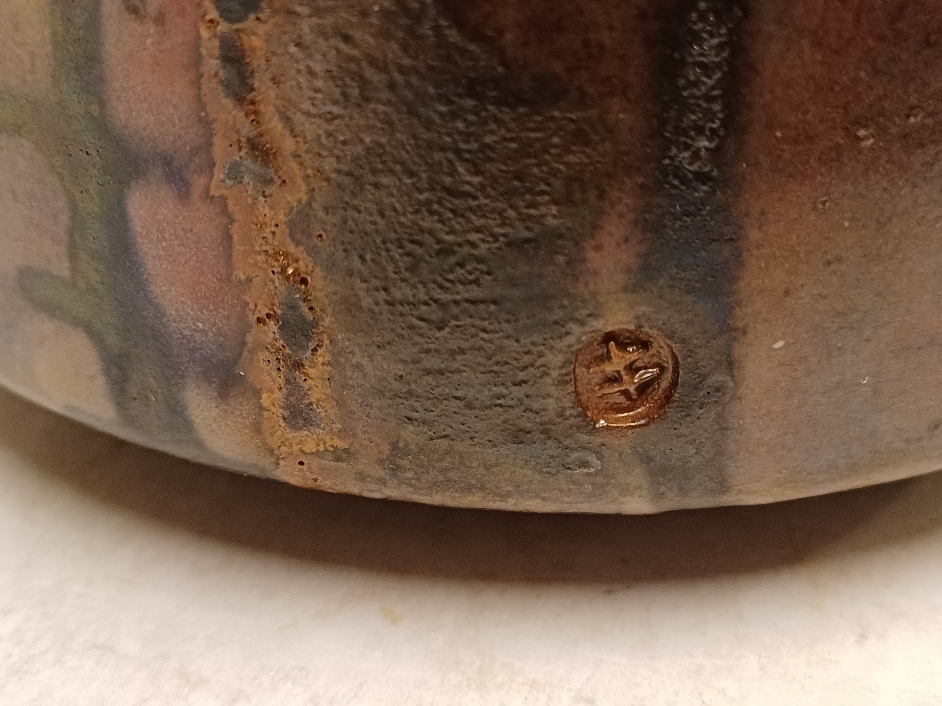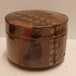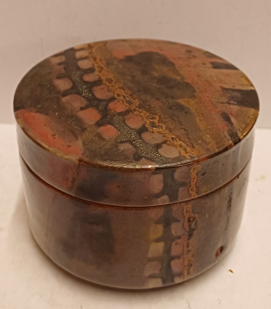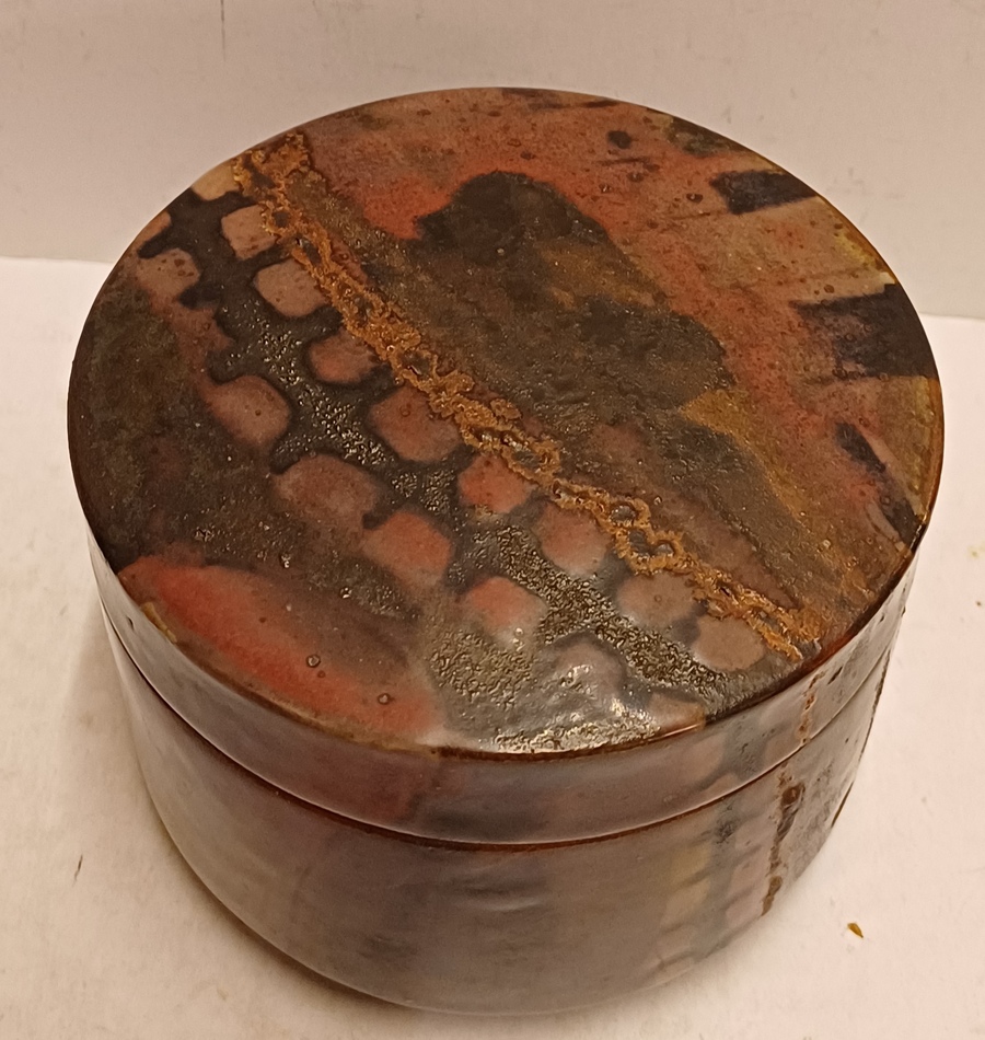 Ronde steengoed dekseldoos met donkere glazuur en stippen patroon. Zijkant gemerkt met kunstenaars merk.