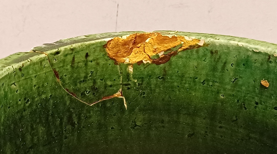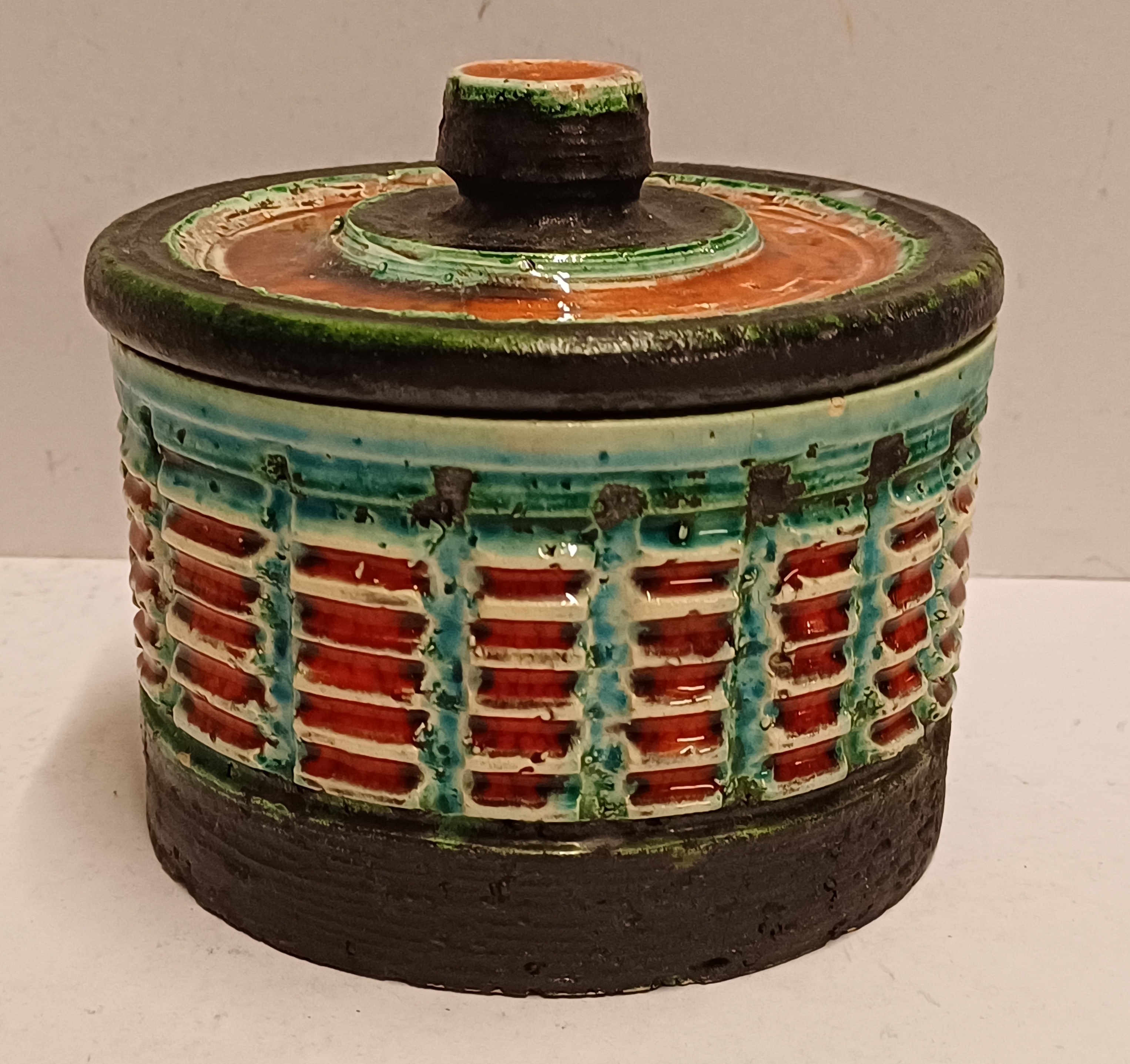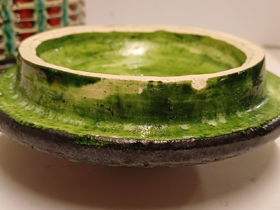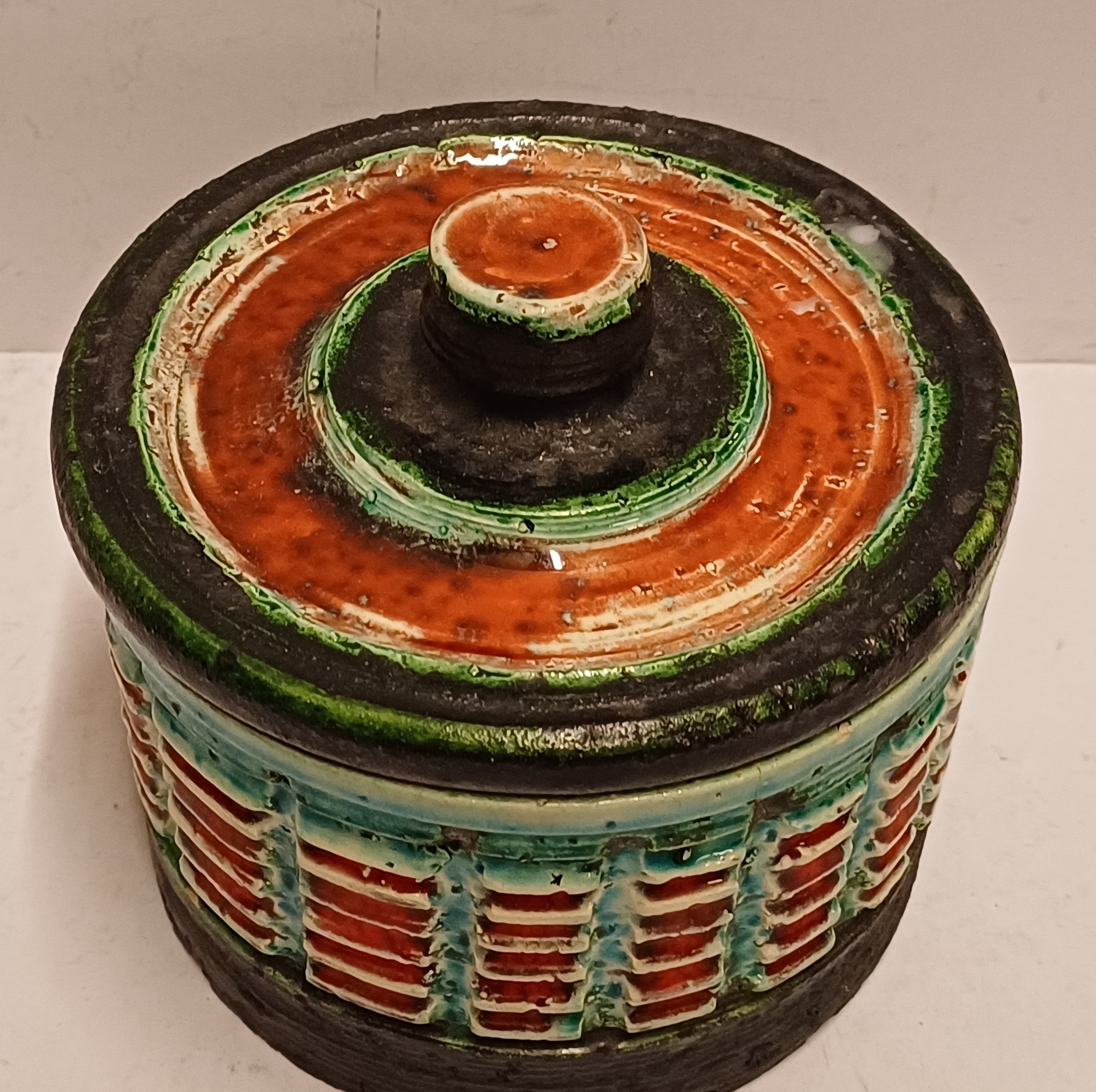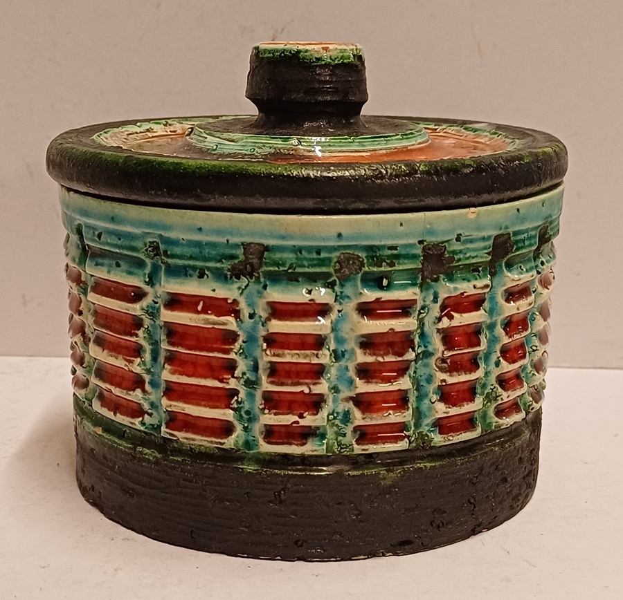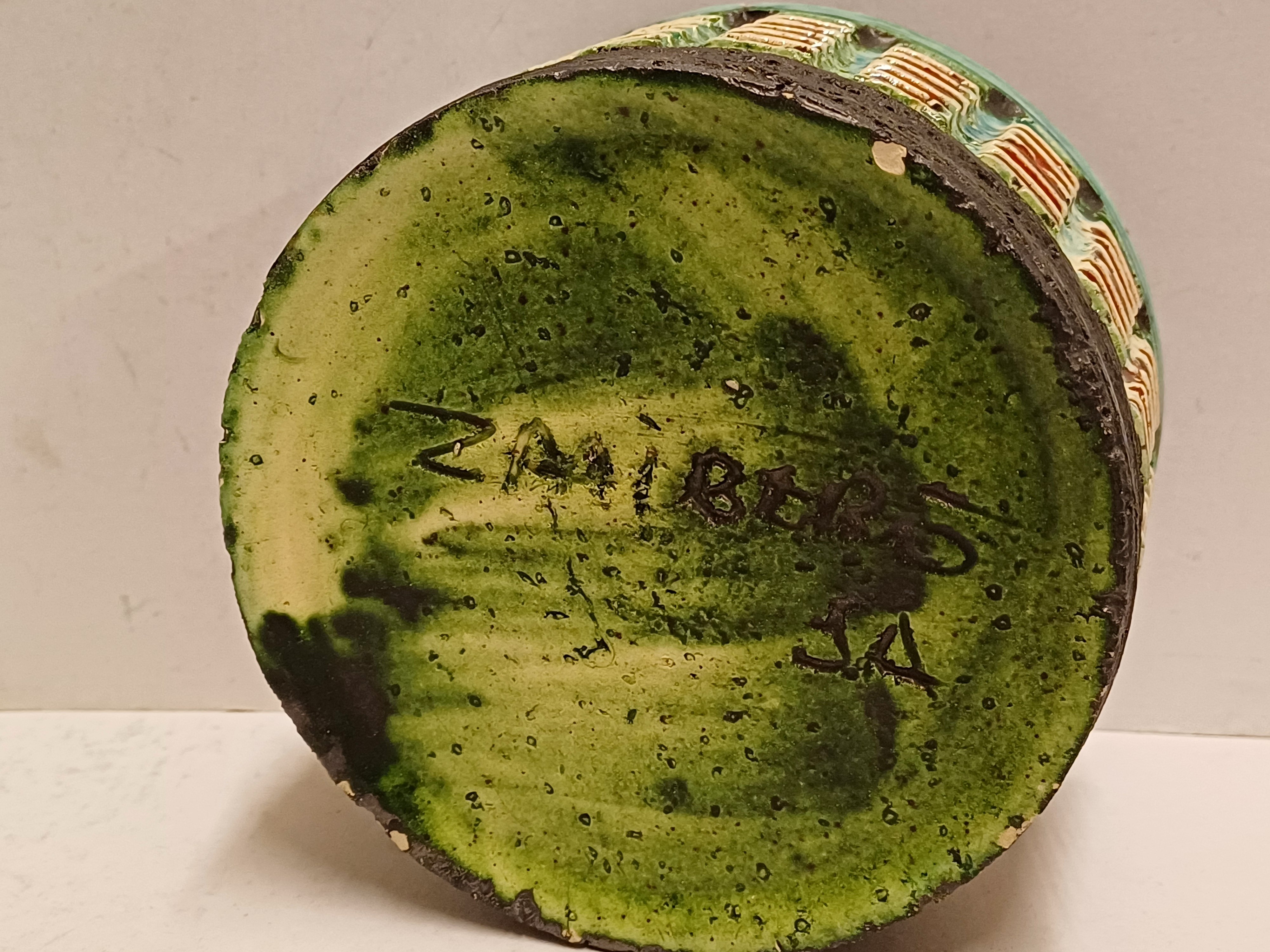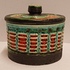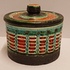 Aardewerken doos met uitgekerft decor in rood en groen. Onderzijde gemerkt Zaalberg SA.