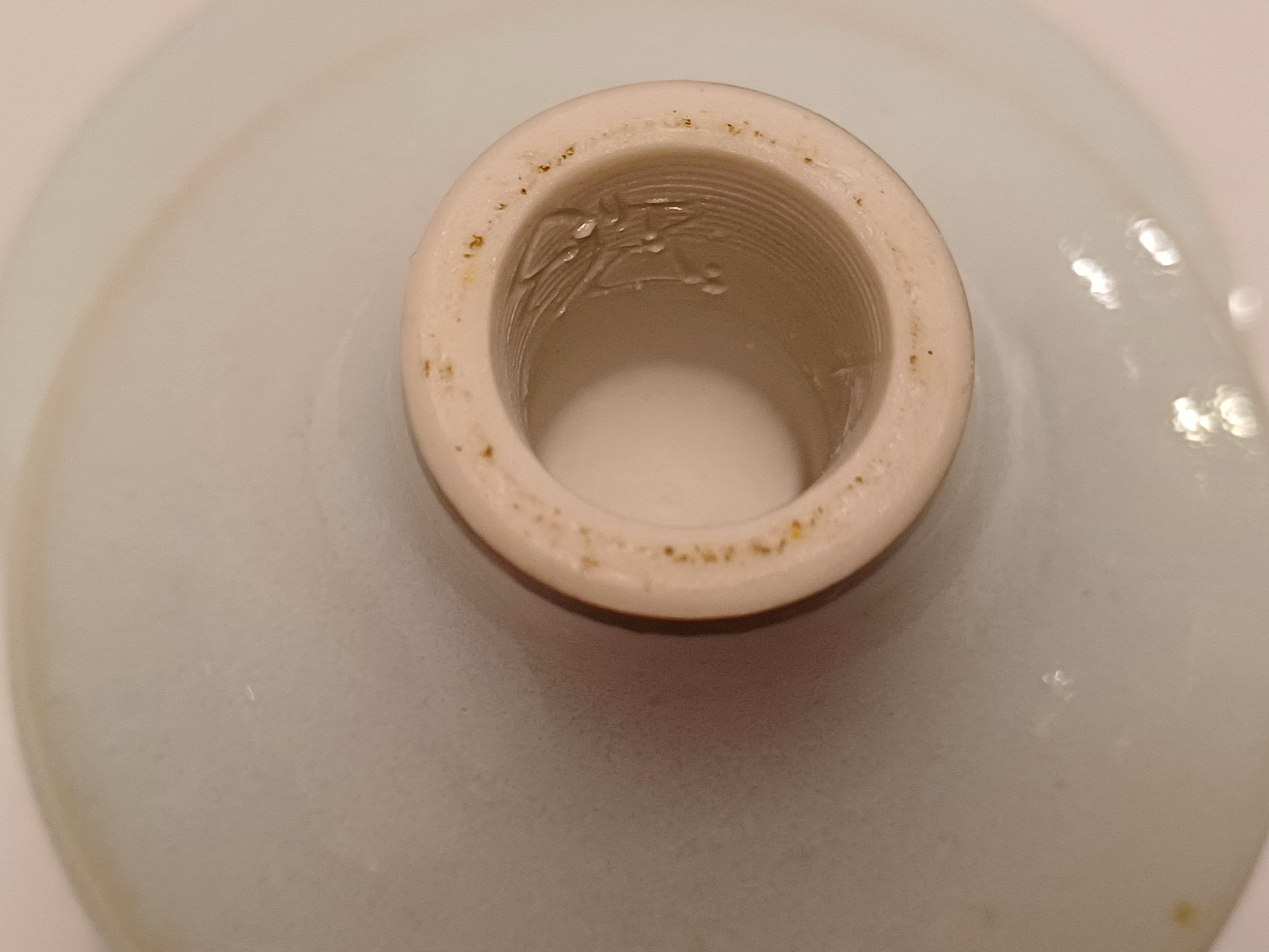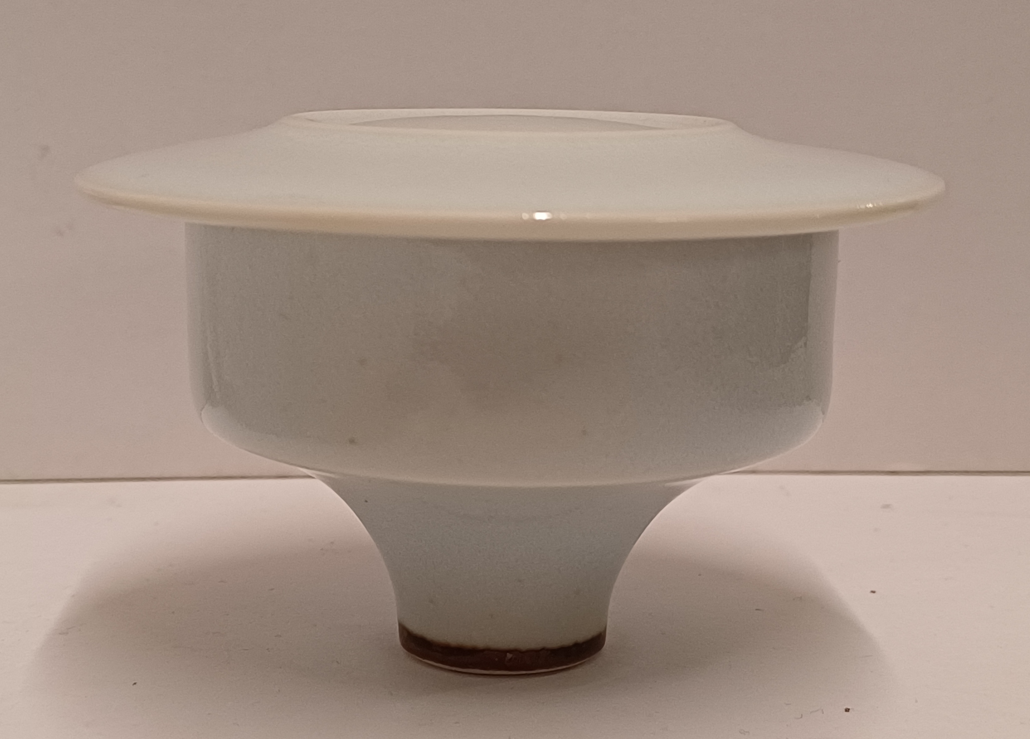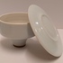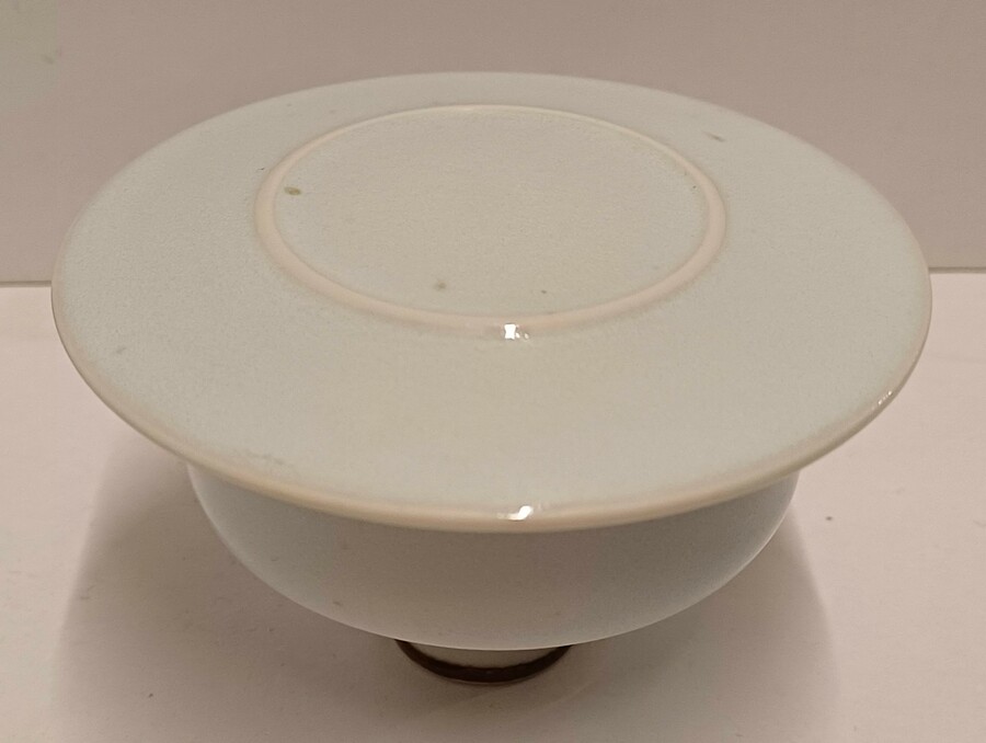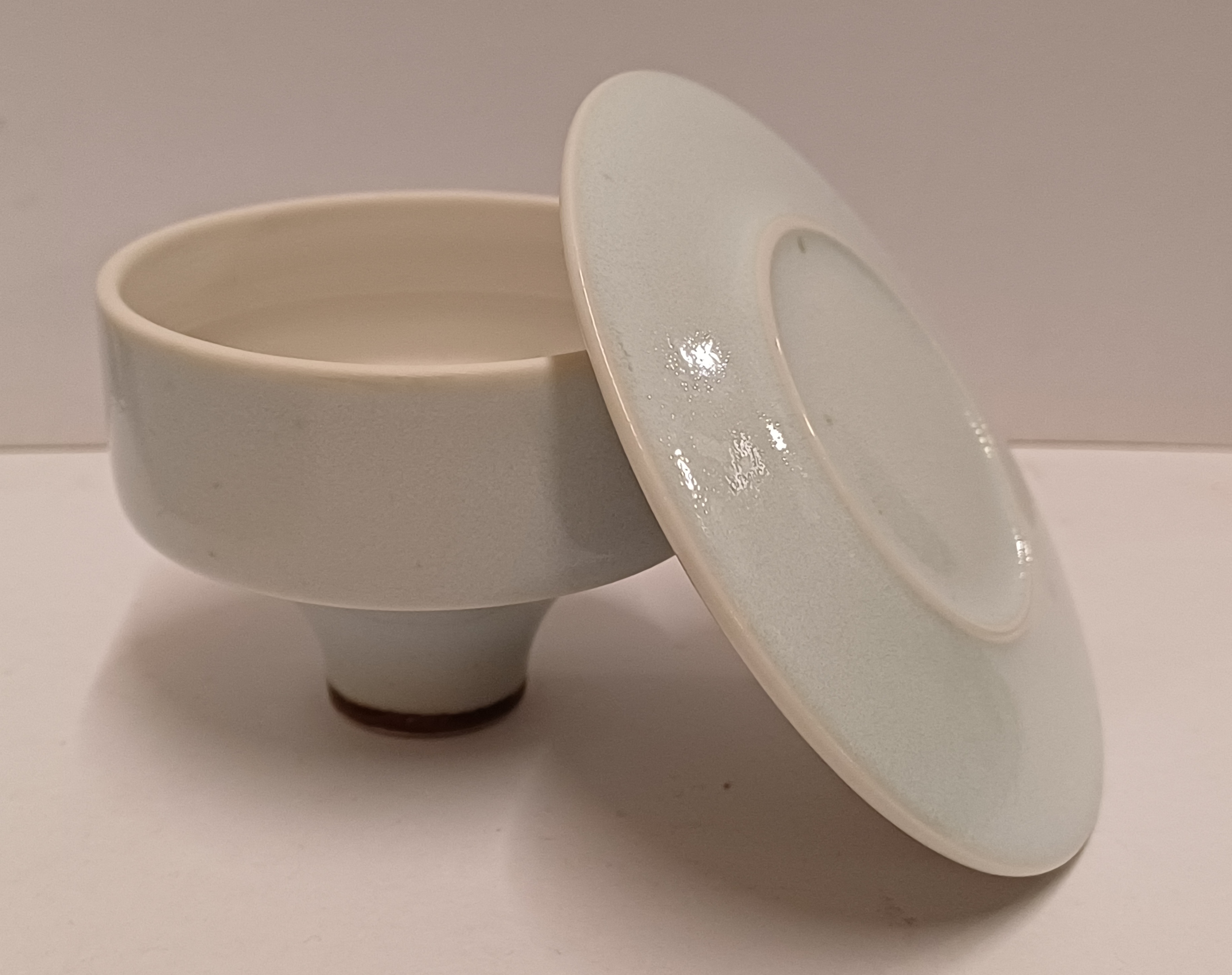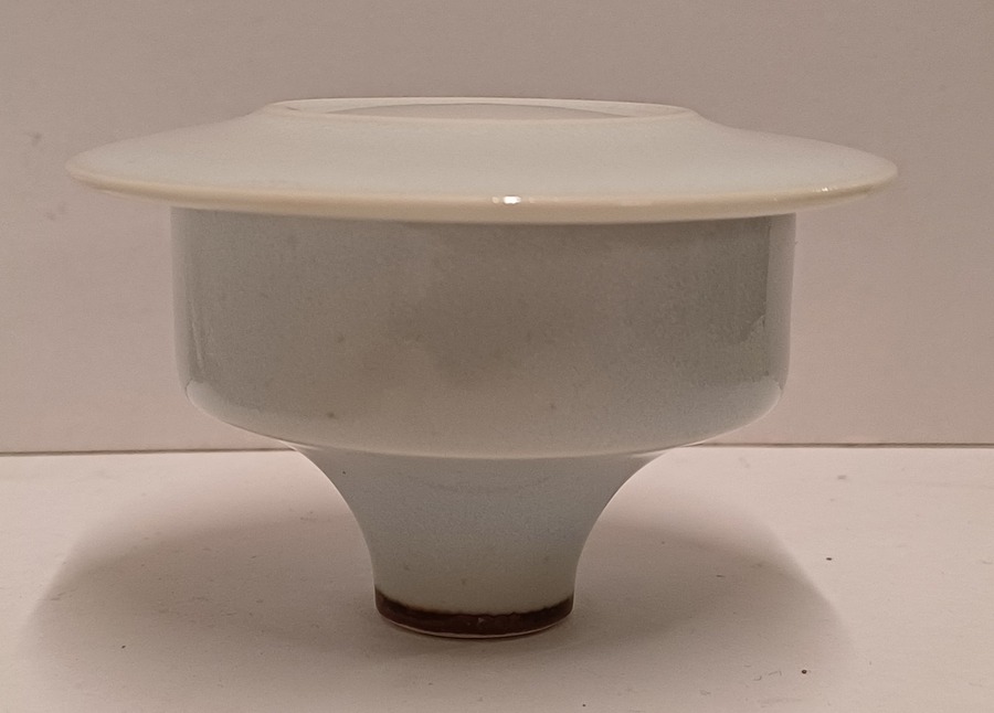 Porseleinen dekseldoos met lichte celadon glazuur. Onderzijde met signatuur
