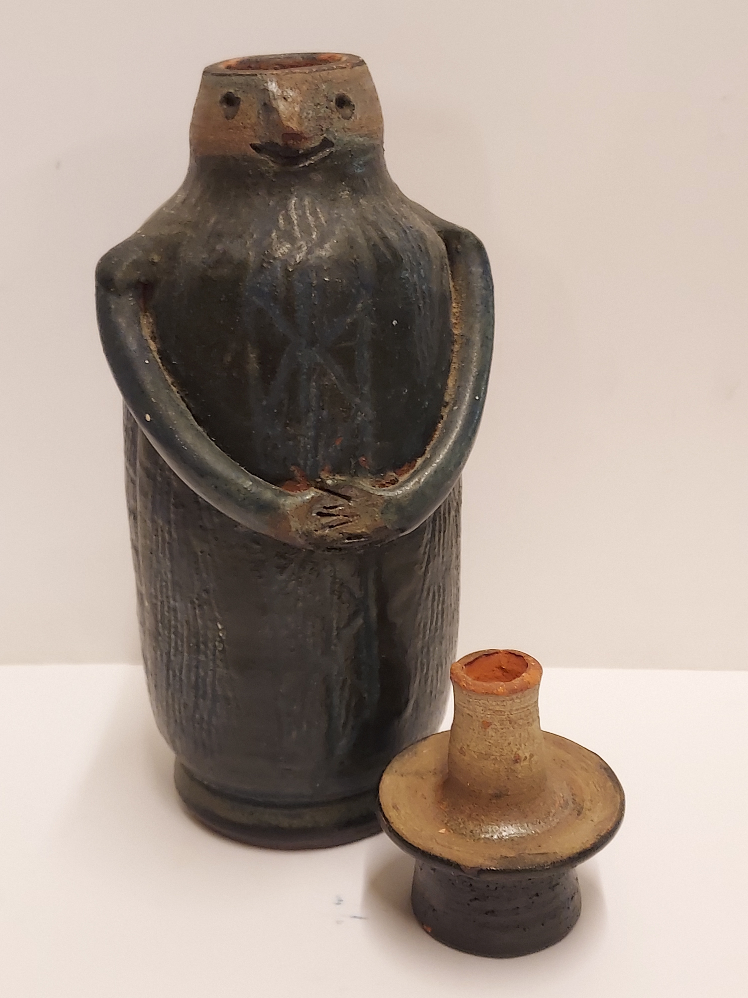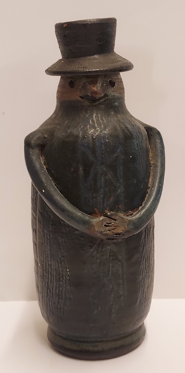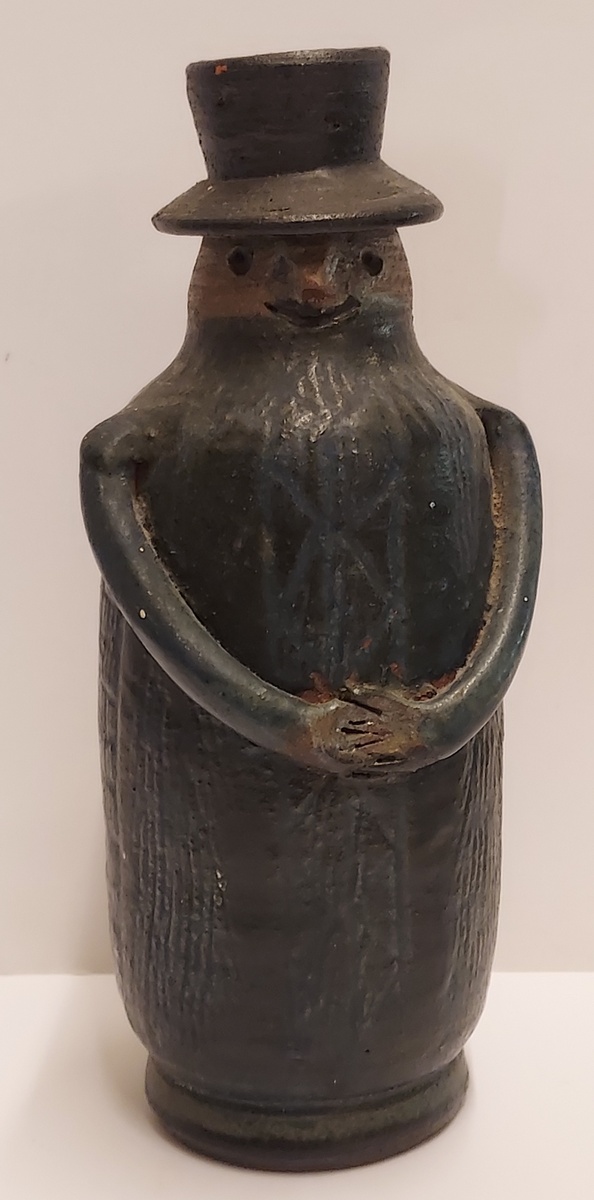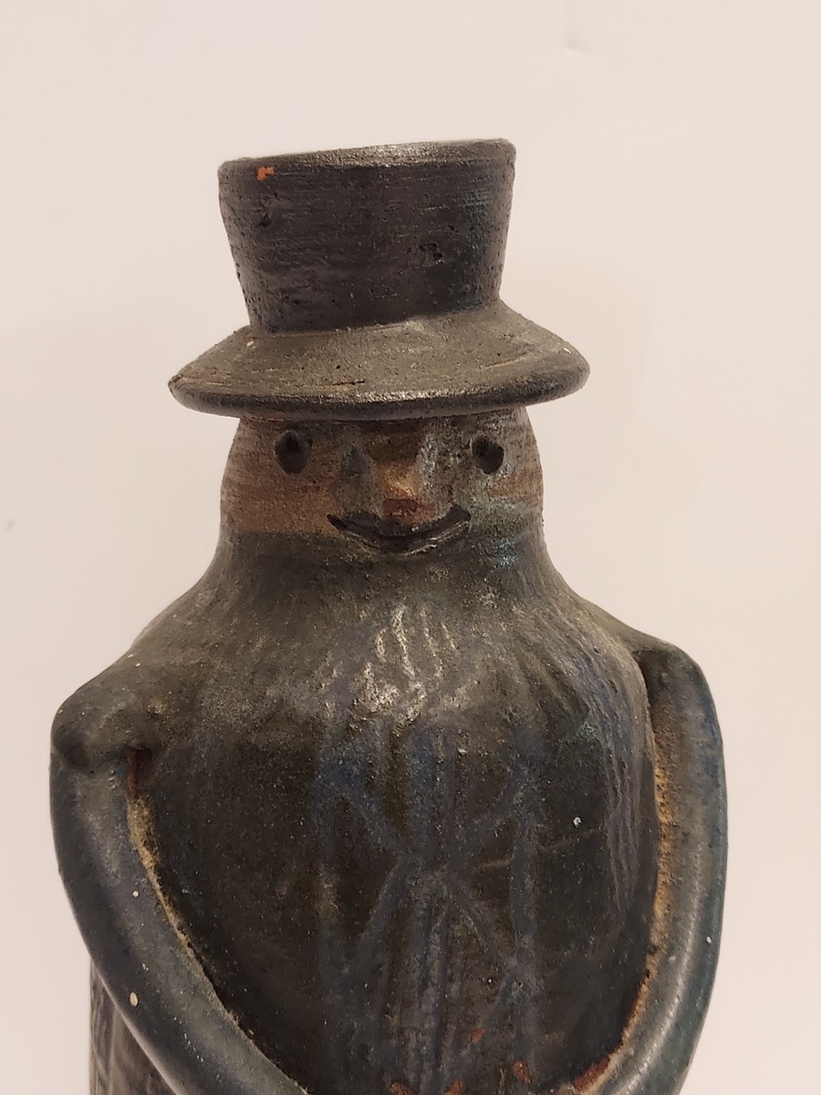 In de vorm van een mannetje met hoed. Onderzijde met monogram.