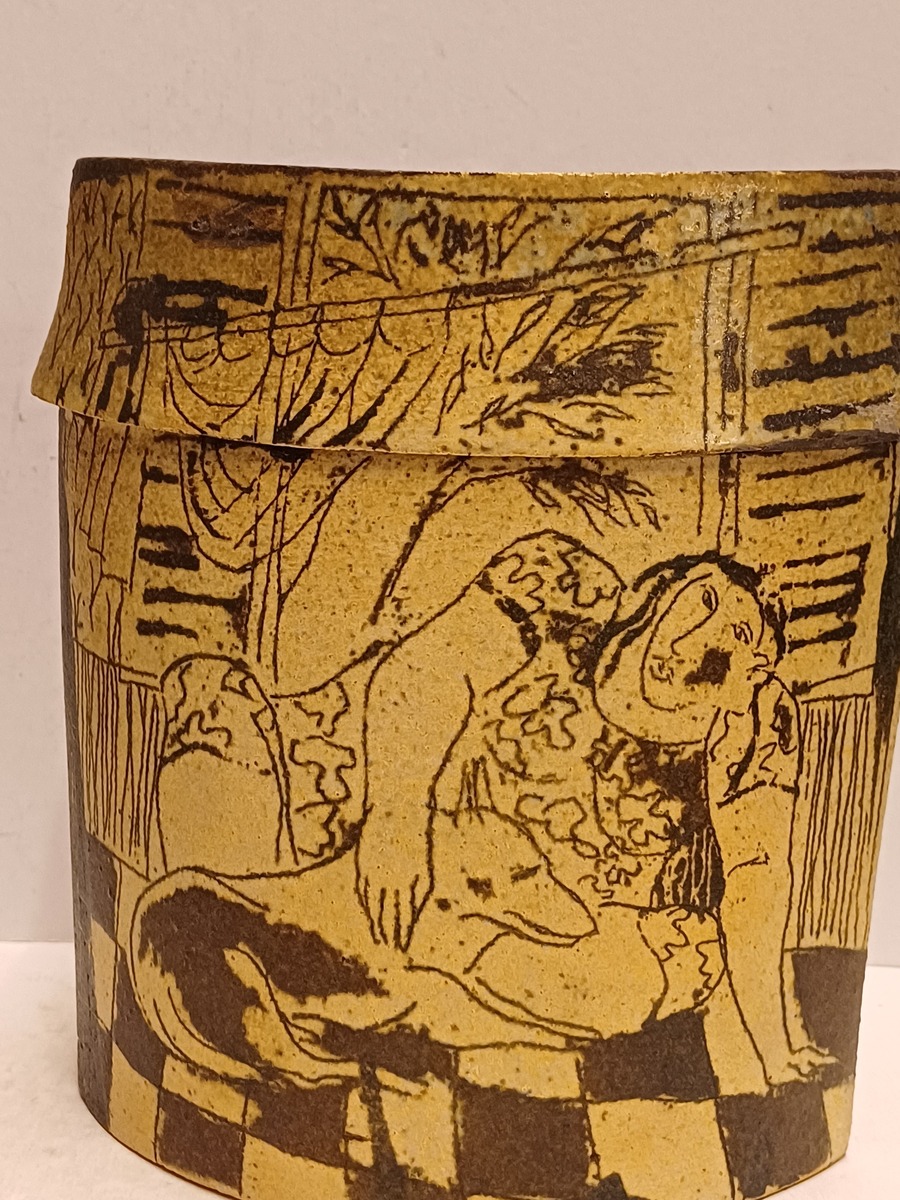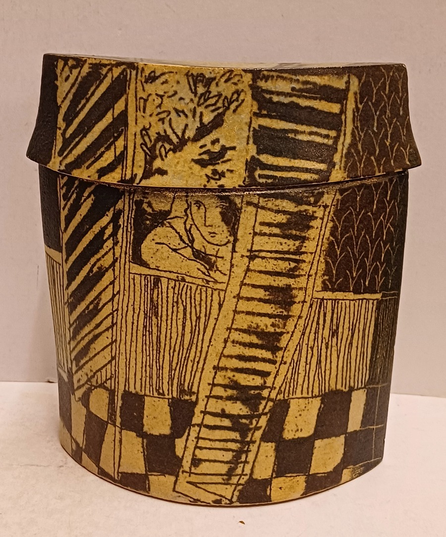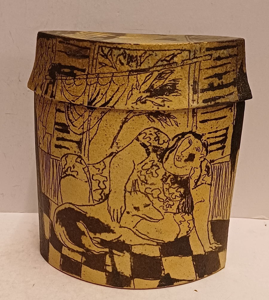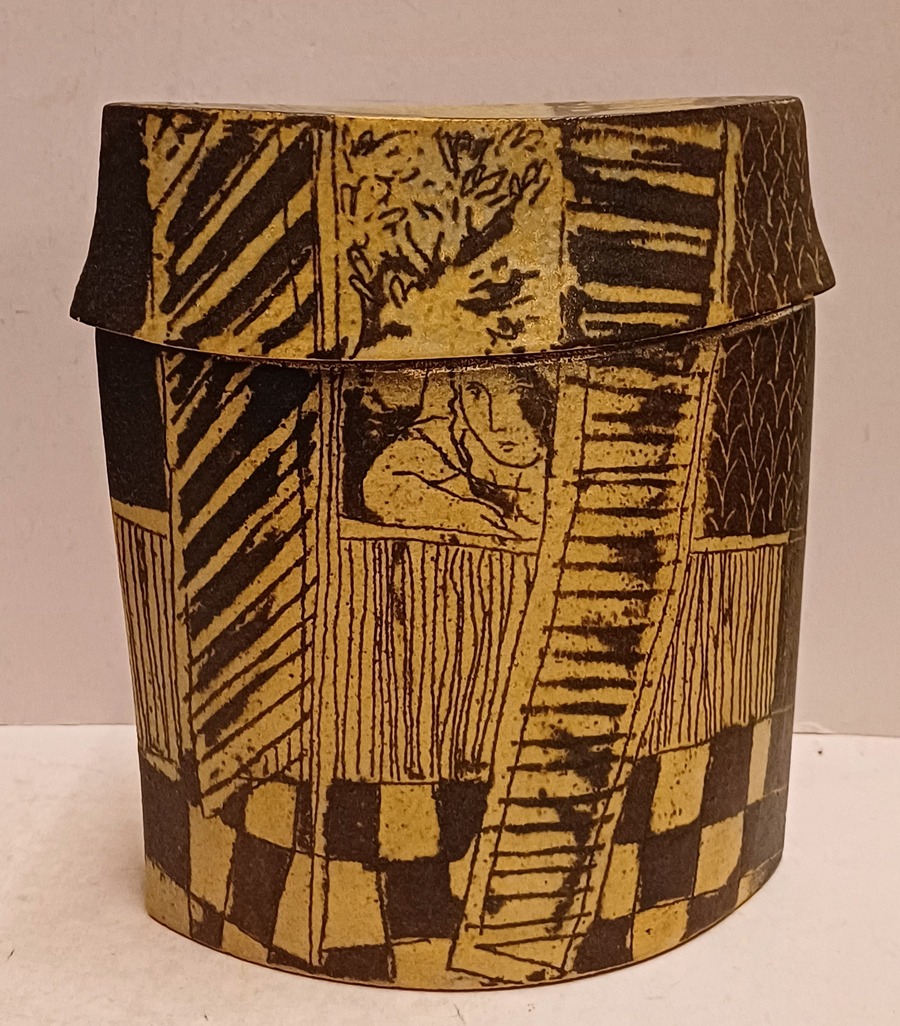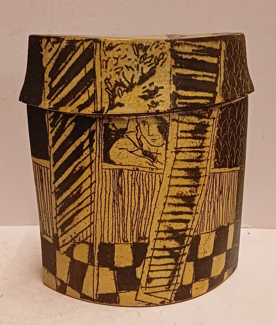 Aardewerken dekseldoos met decoratie van achter een raam kijkend. Verso, vrouw liggend op een sofa met haar hond. Onderzijde met kunstenaars monogram.