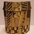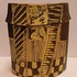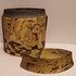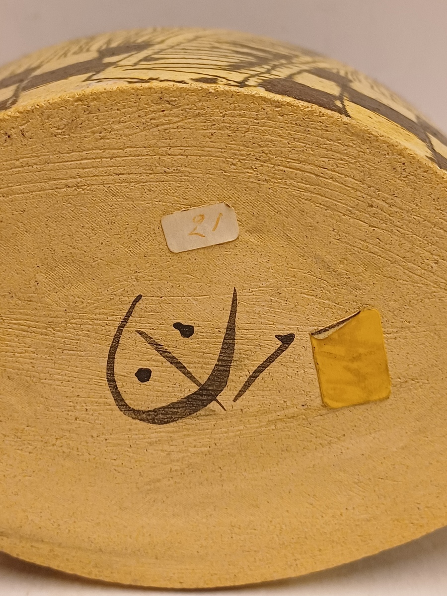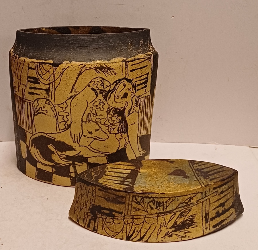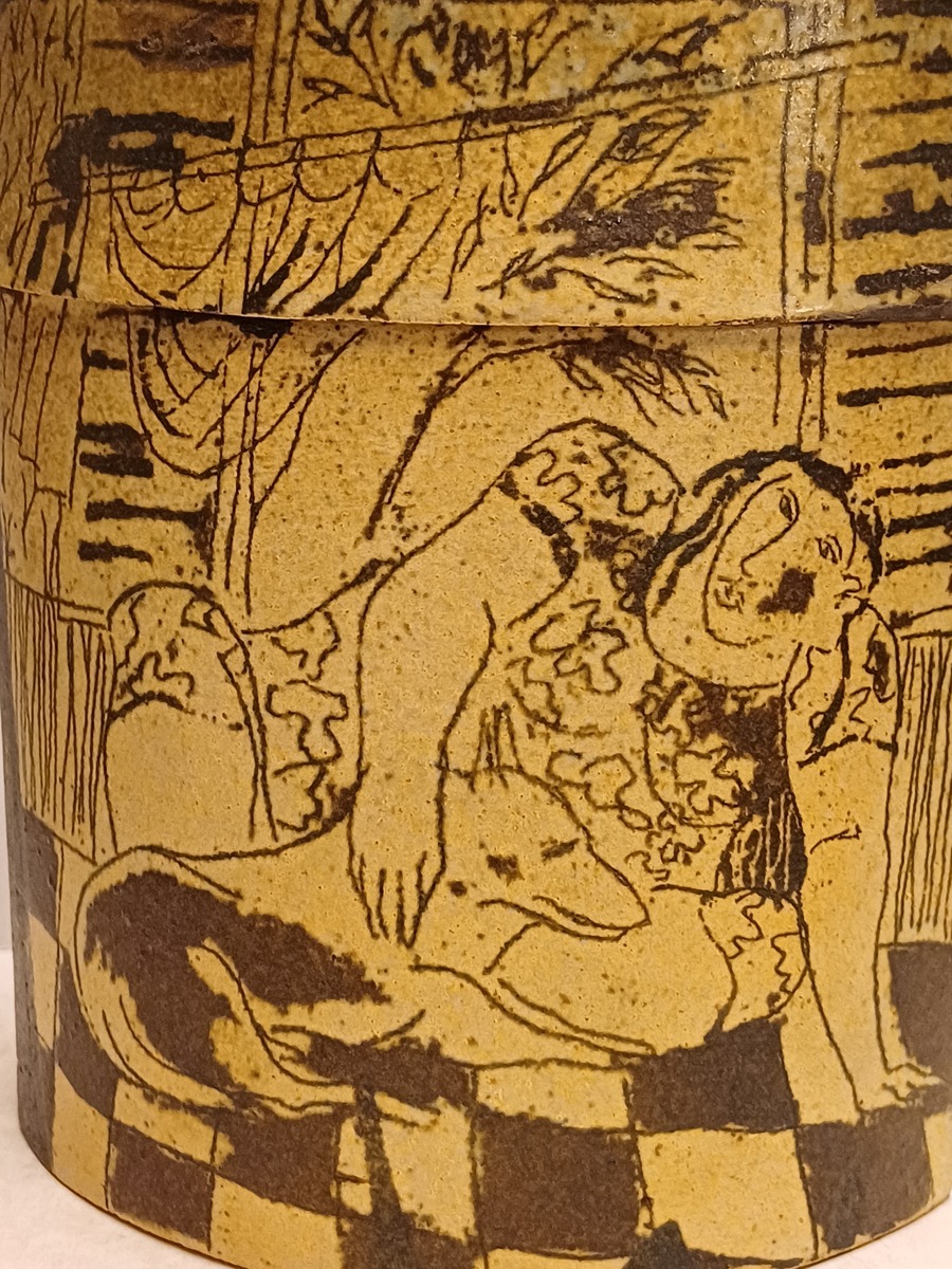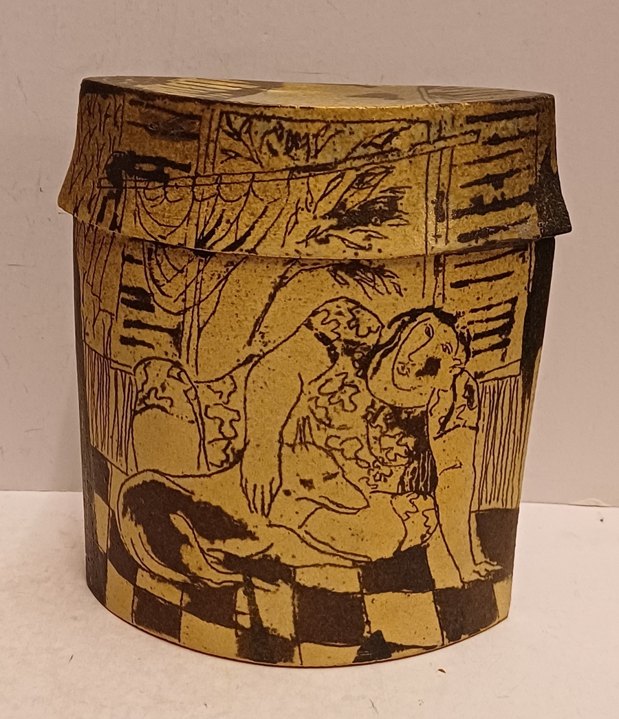 Aardewerken dekseldoos met decoratie van achter een raam kijkend. Verso, vrouw liggend op een sofa met haar hond. Onderzijde met kunstenaars monogram.