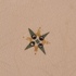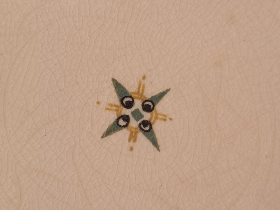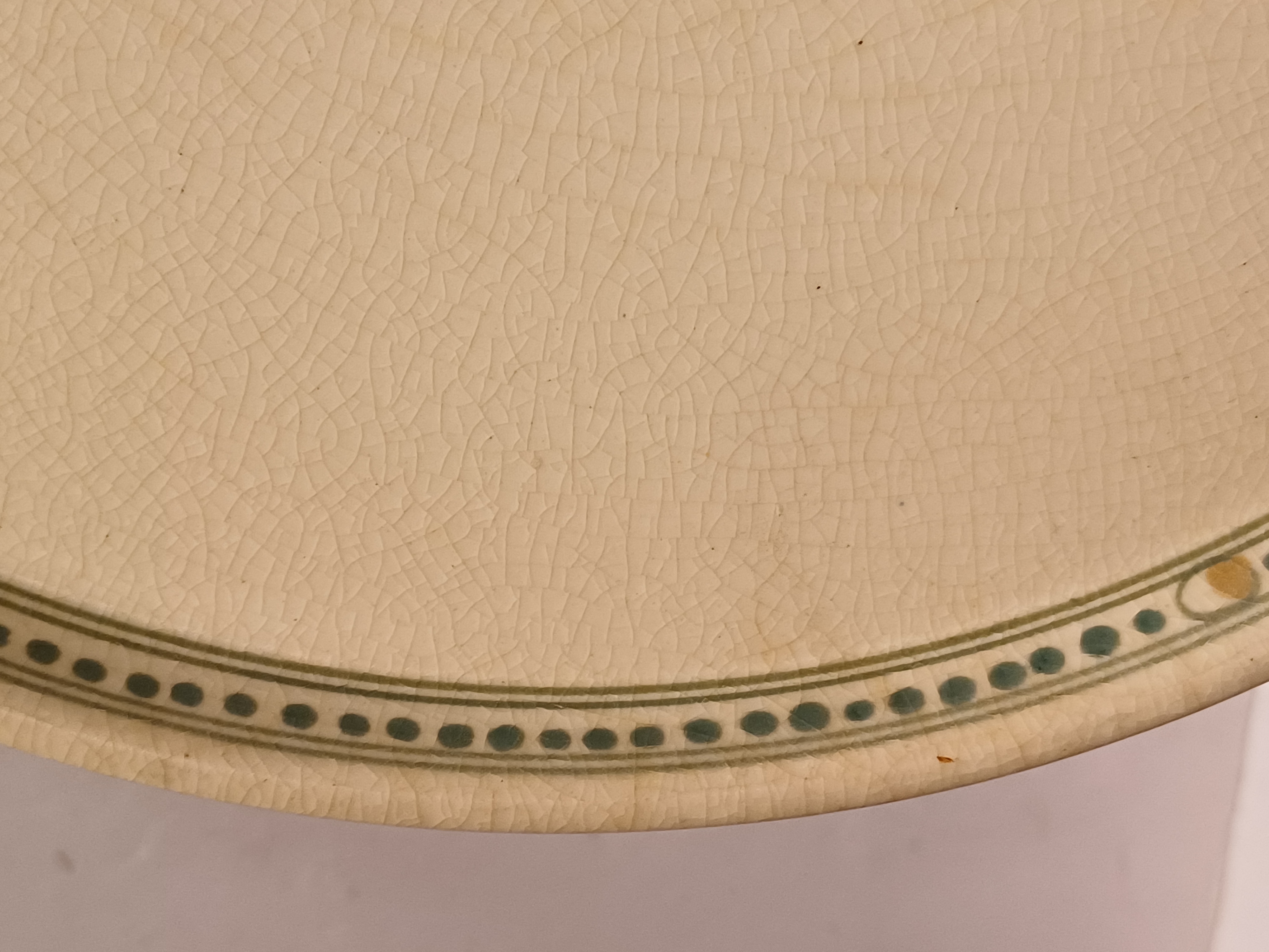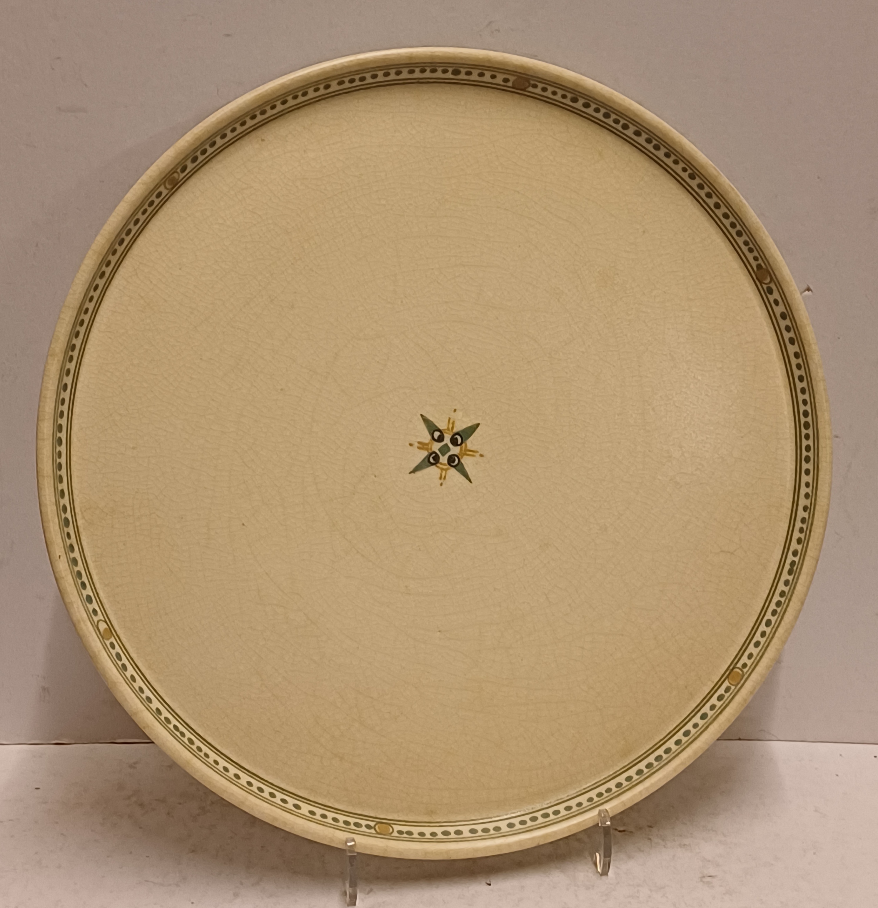 Creme geglazuurd dienblad met groen, zwart en oker lineair decor. Onderzijde met fabrieksmerk.