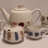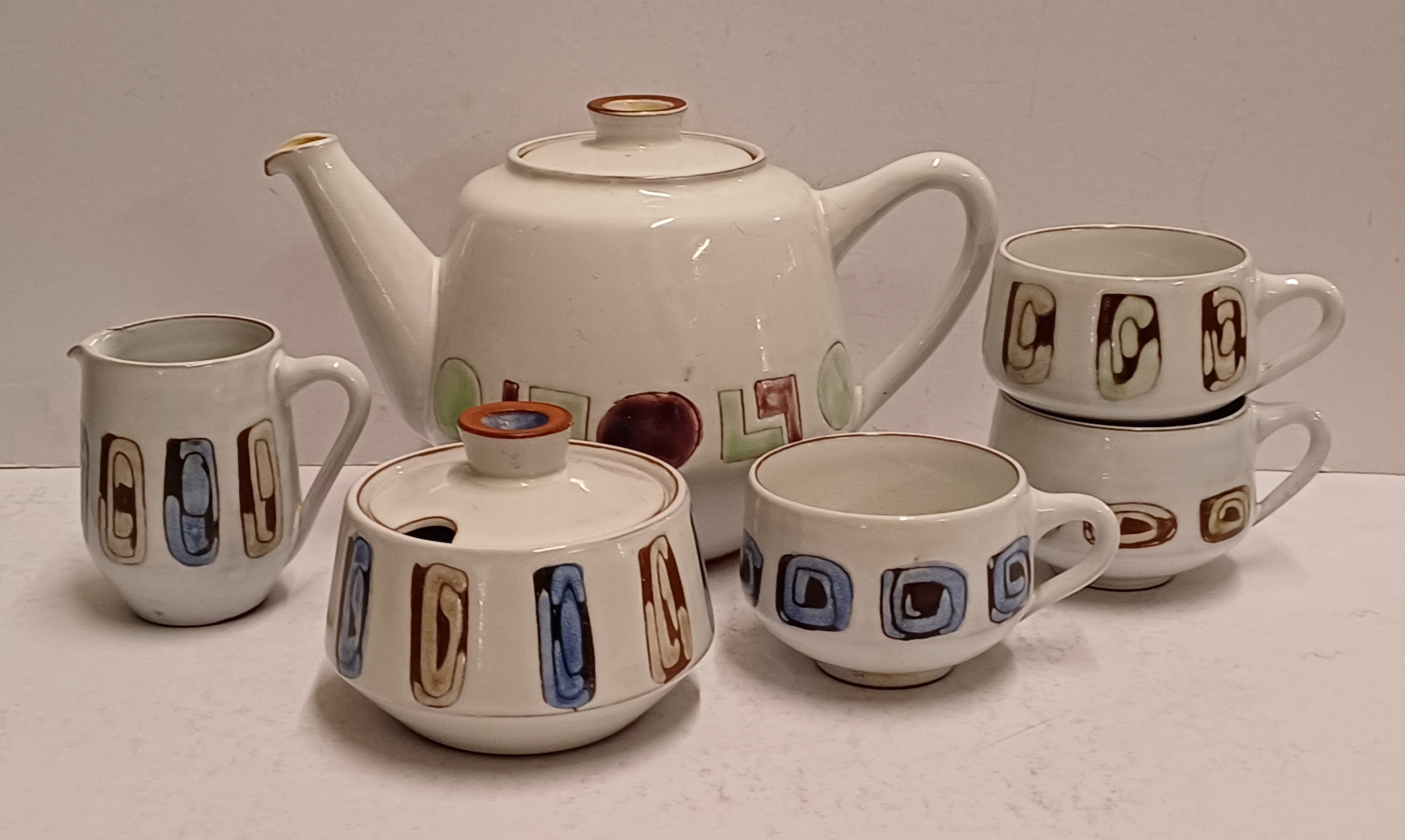 Theepot met roomstel en 3 kopjes allen met abstracte decoraties. Onderzijde met onbekend werknemers merk.