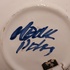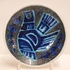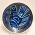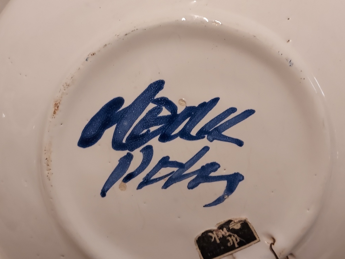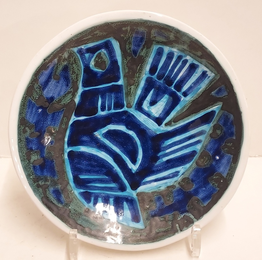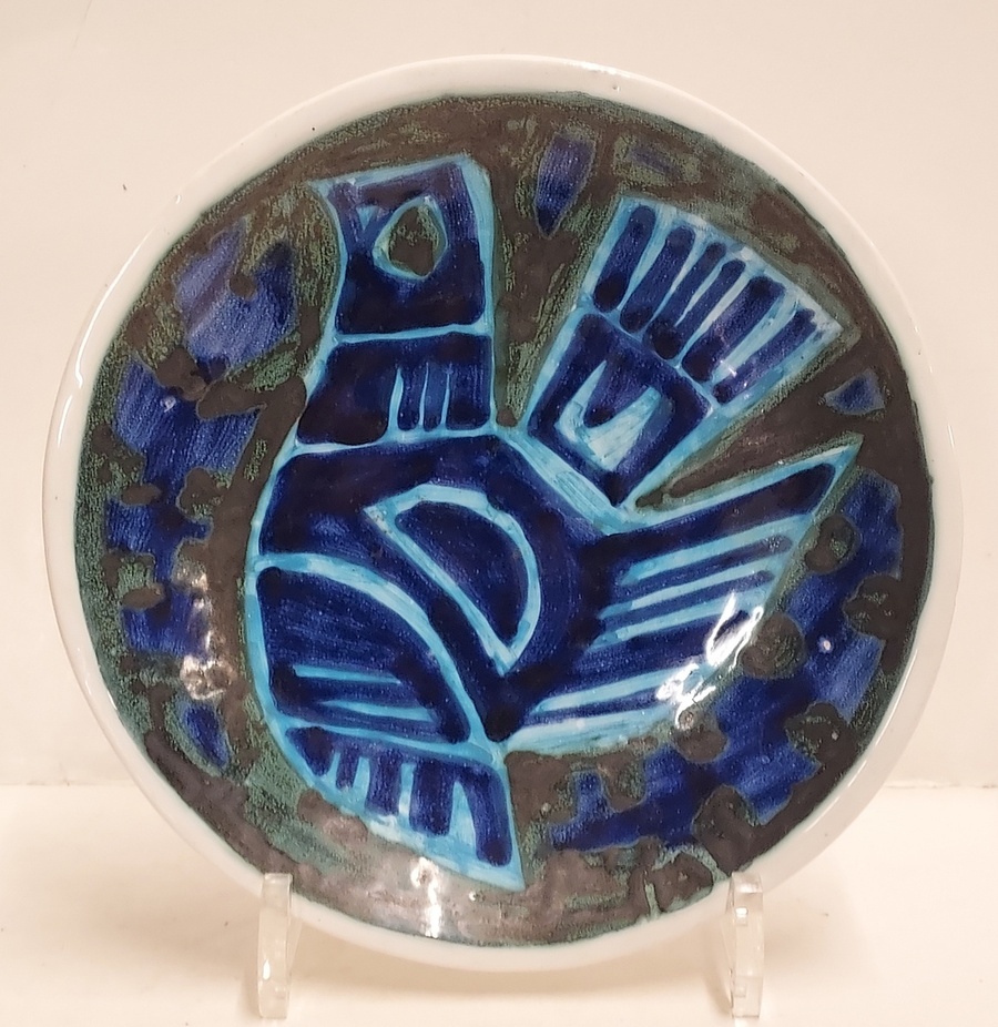 Aardewerken bord met geschilderde decoratie van een vogel in blauw. Achterzijde gesigneerd