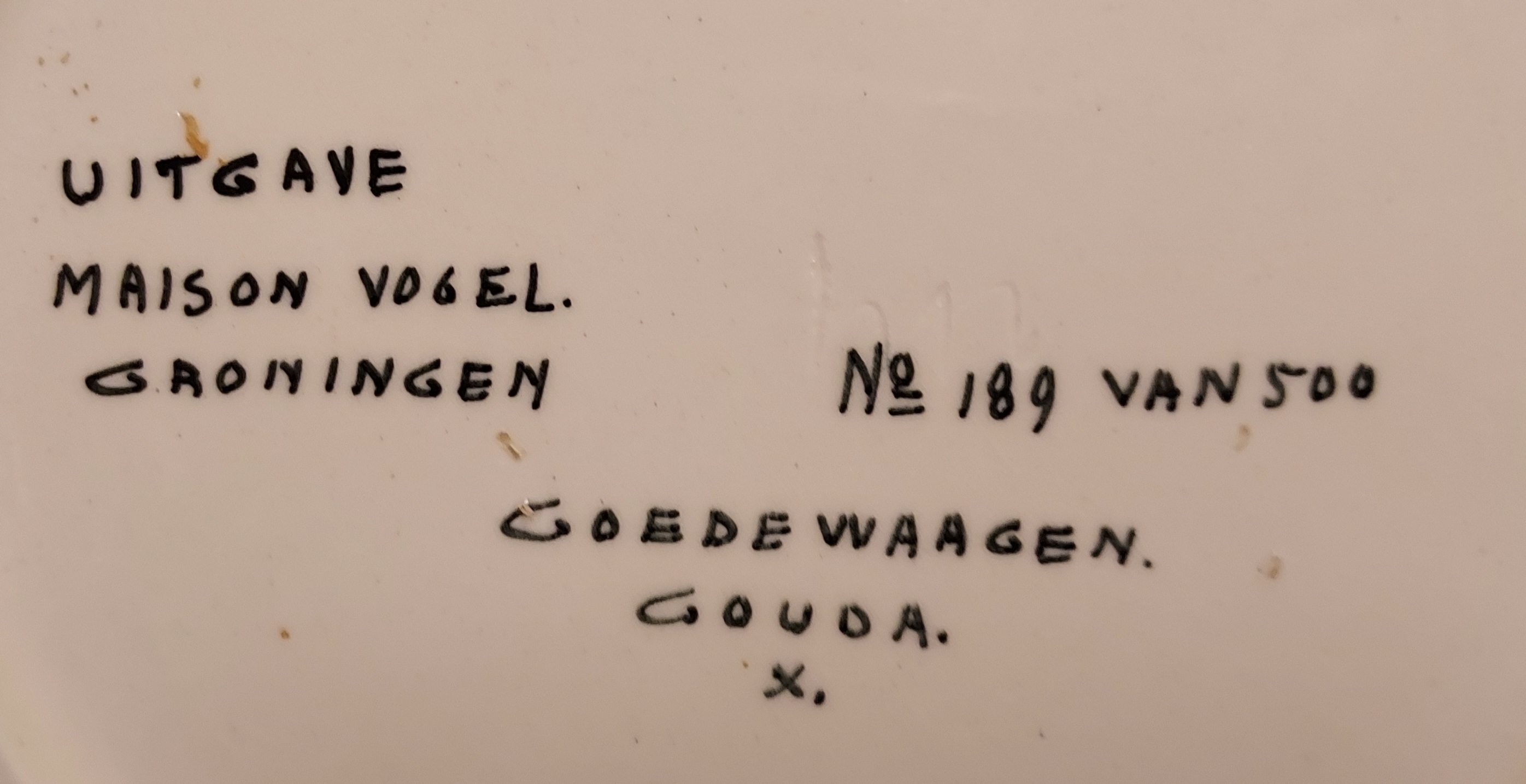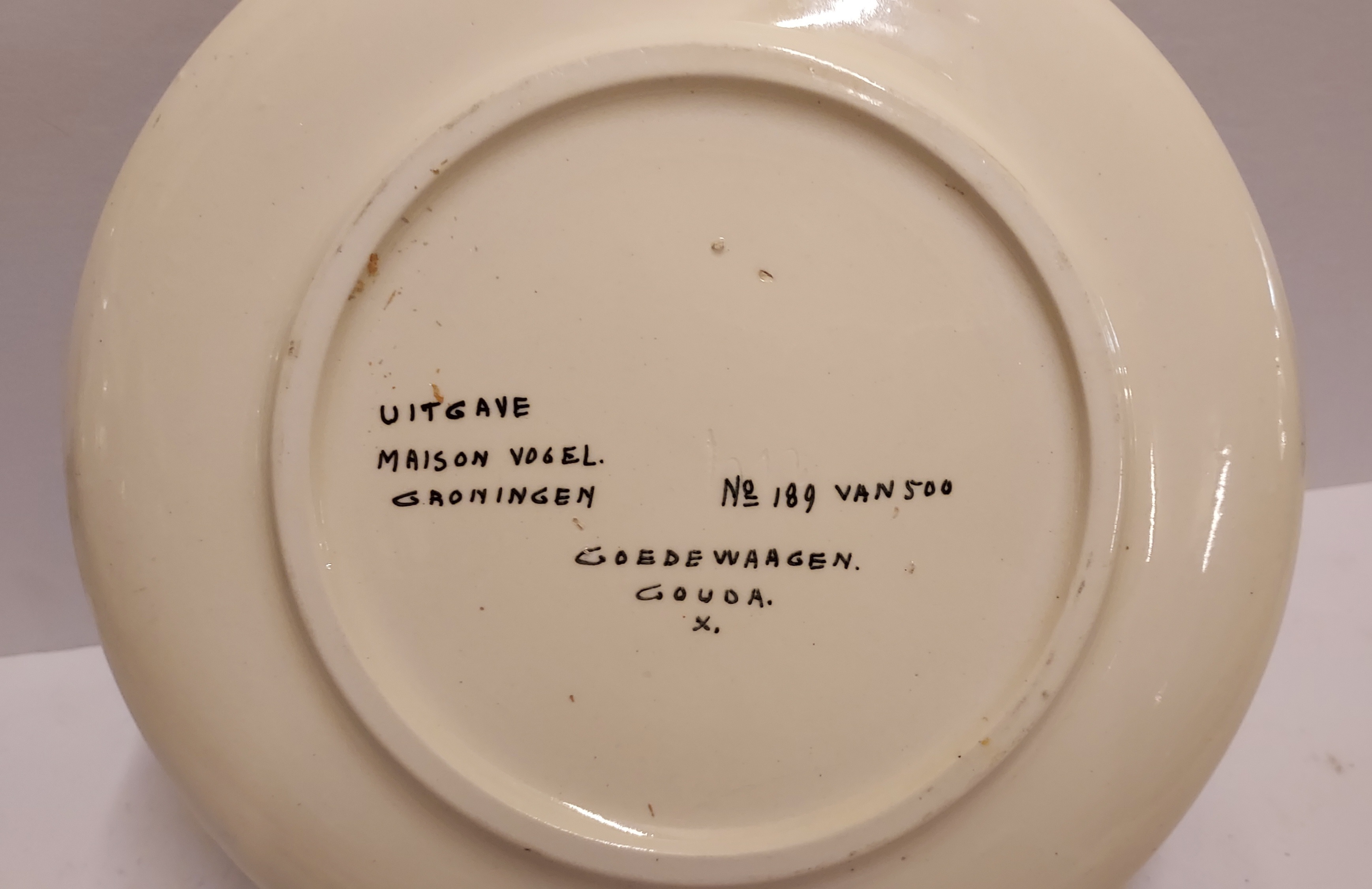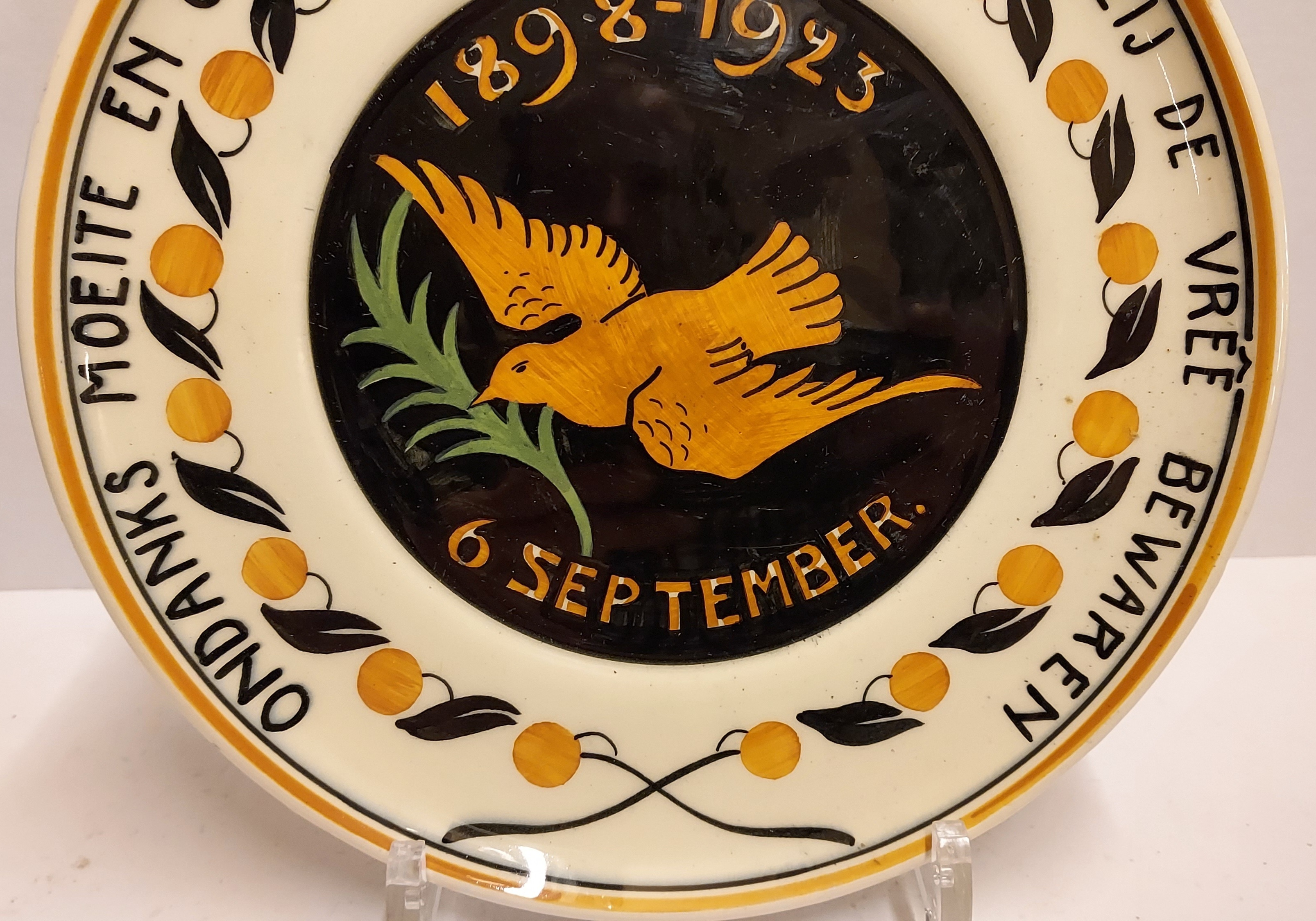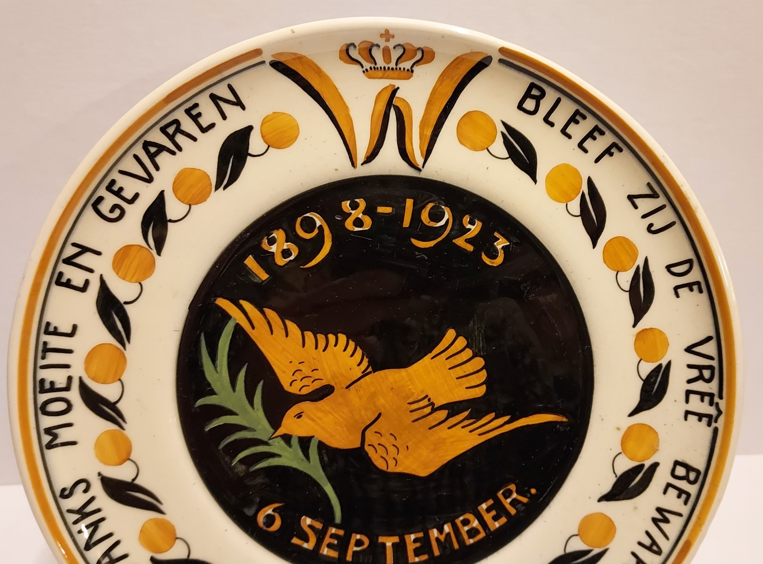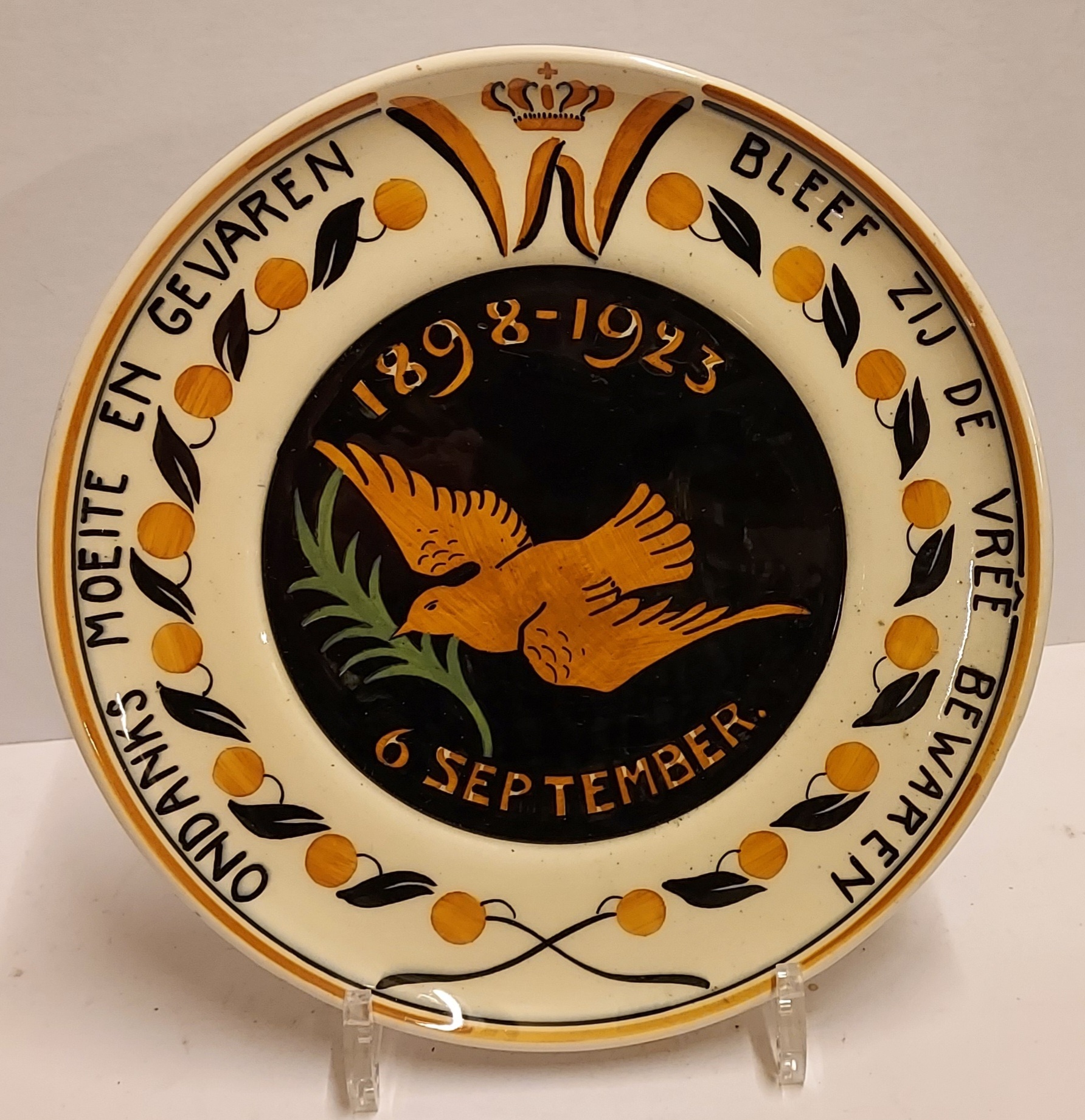 Bord met geschilderde voorstelling van oranjeduif met tak in zijn bek. met rondom de tekst "Ondanks moeite en gevaren bleef zij de vree bewaren 1898-1923". In opdracht gemaakt voor Maison Vogel Groningen in een oplage van 500 dit is nr 189. Achterzijde voluit gesigneerd