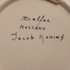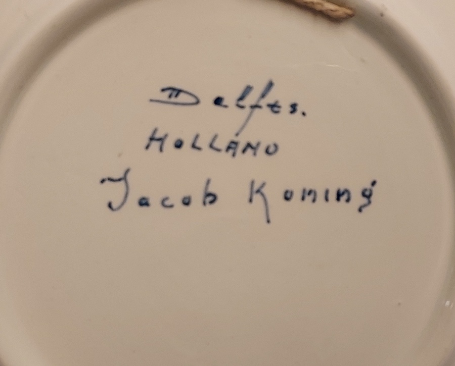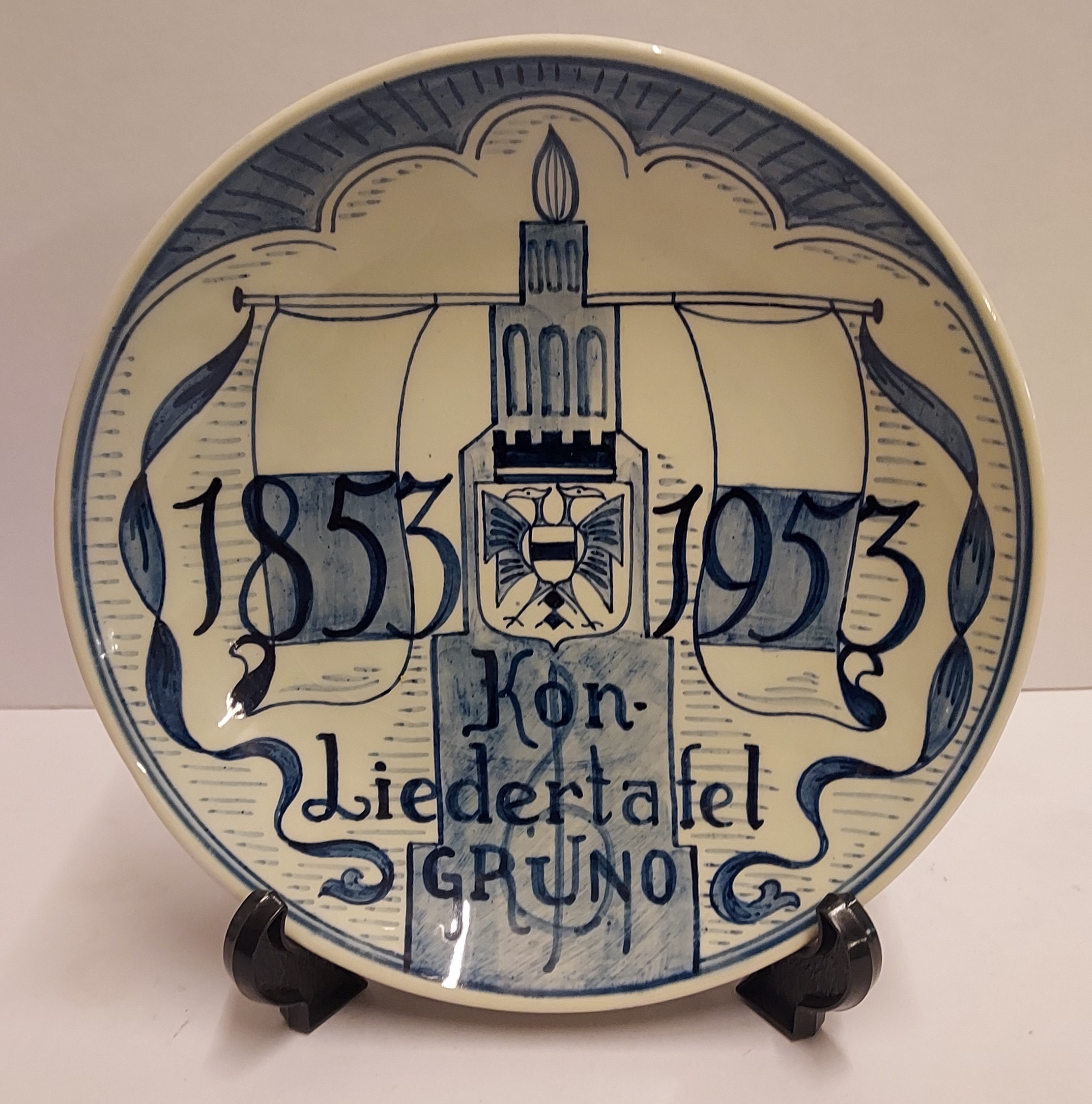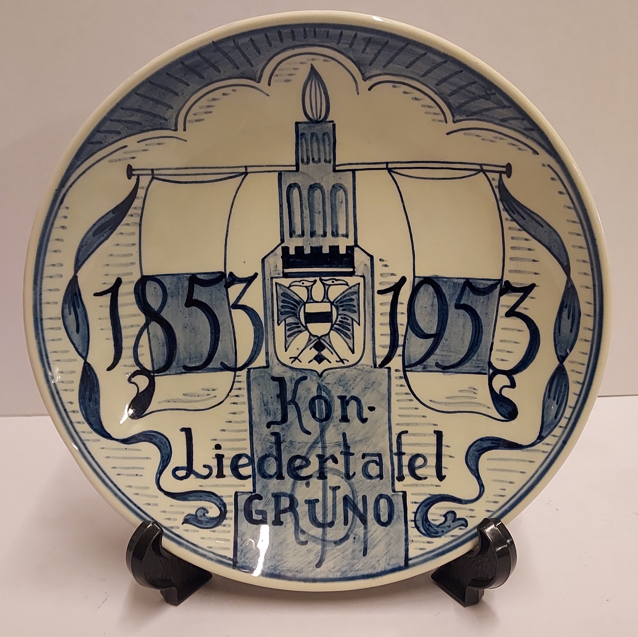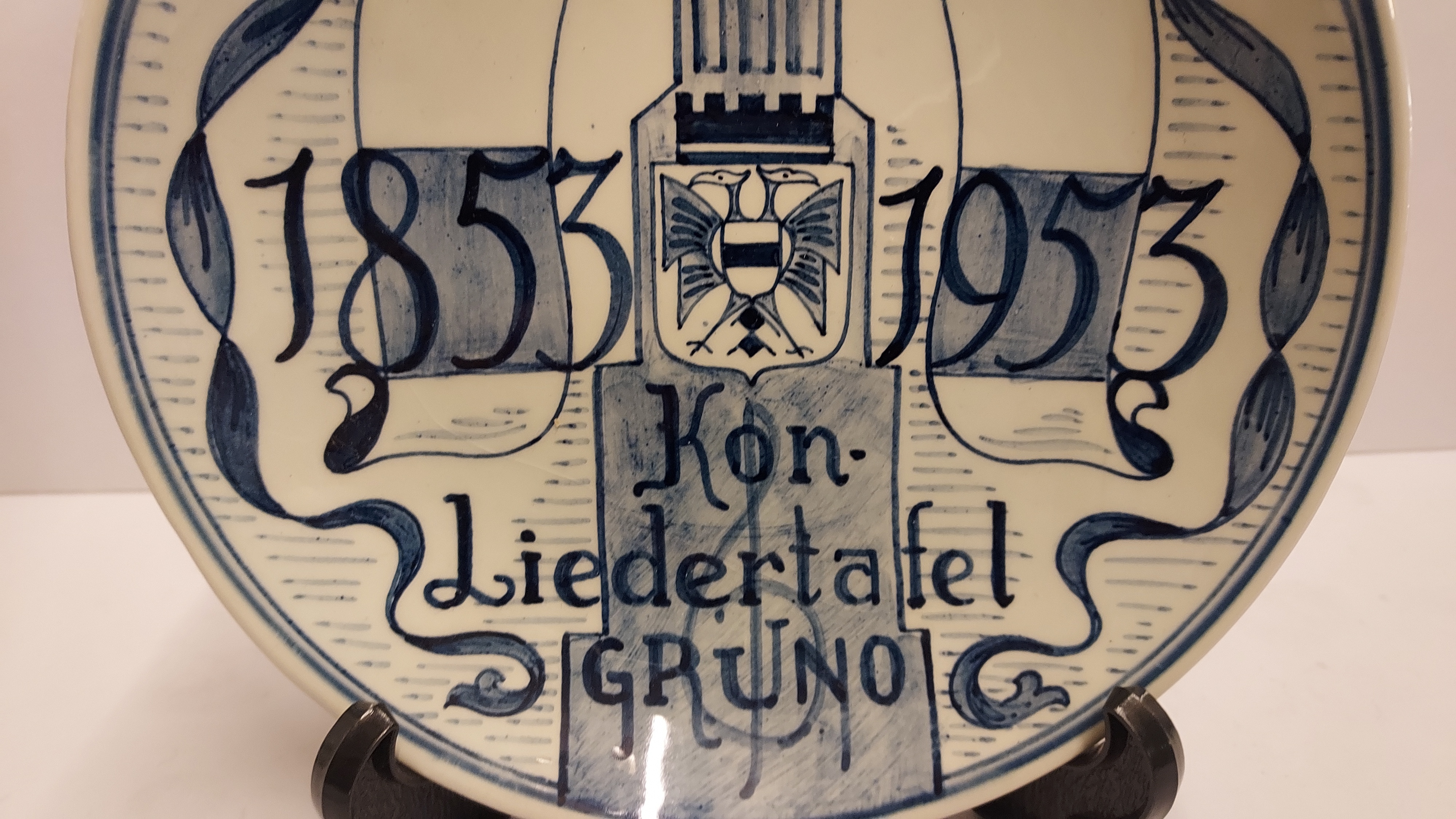 Delfts blauw bordje met afbeelding van de Martinintoren en de jaartallen 1853-1953 Kon. Liedertafel Gruno. Achterzijde met winkelmerk Jacob Koning.