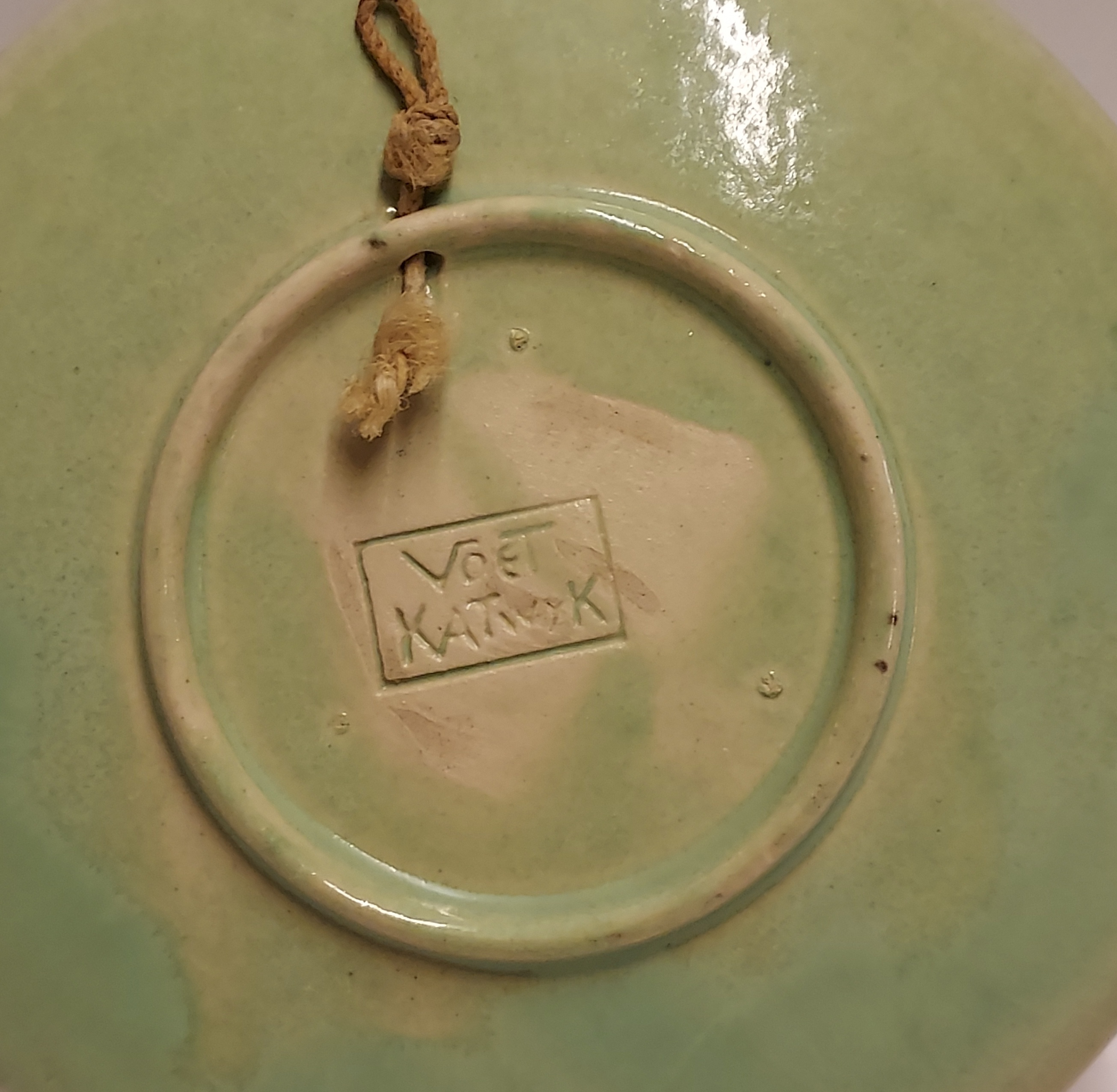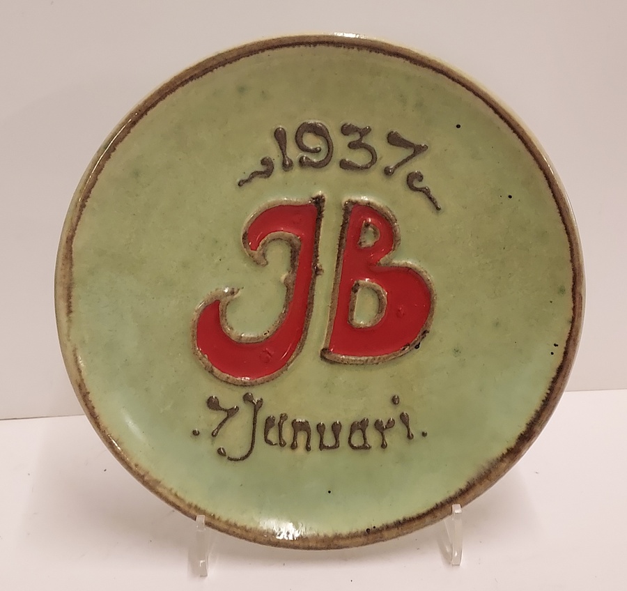 Groen geglazuurd bordje met de tekst JB 7 januari 1937. Achterzijde gemerkt.