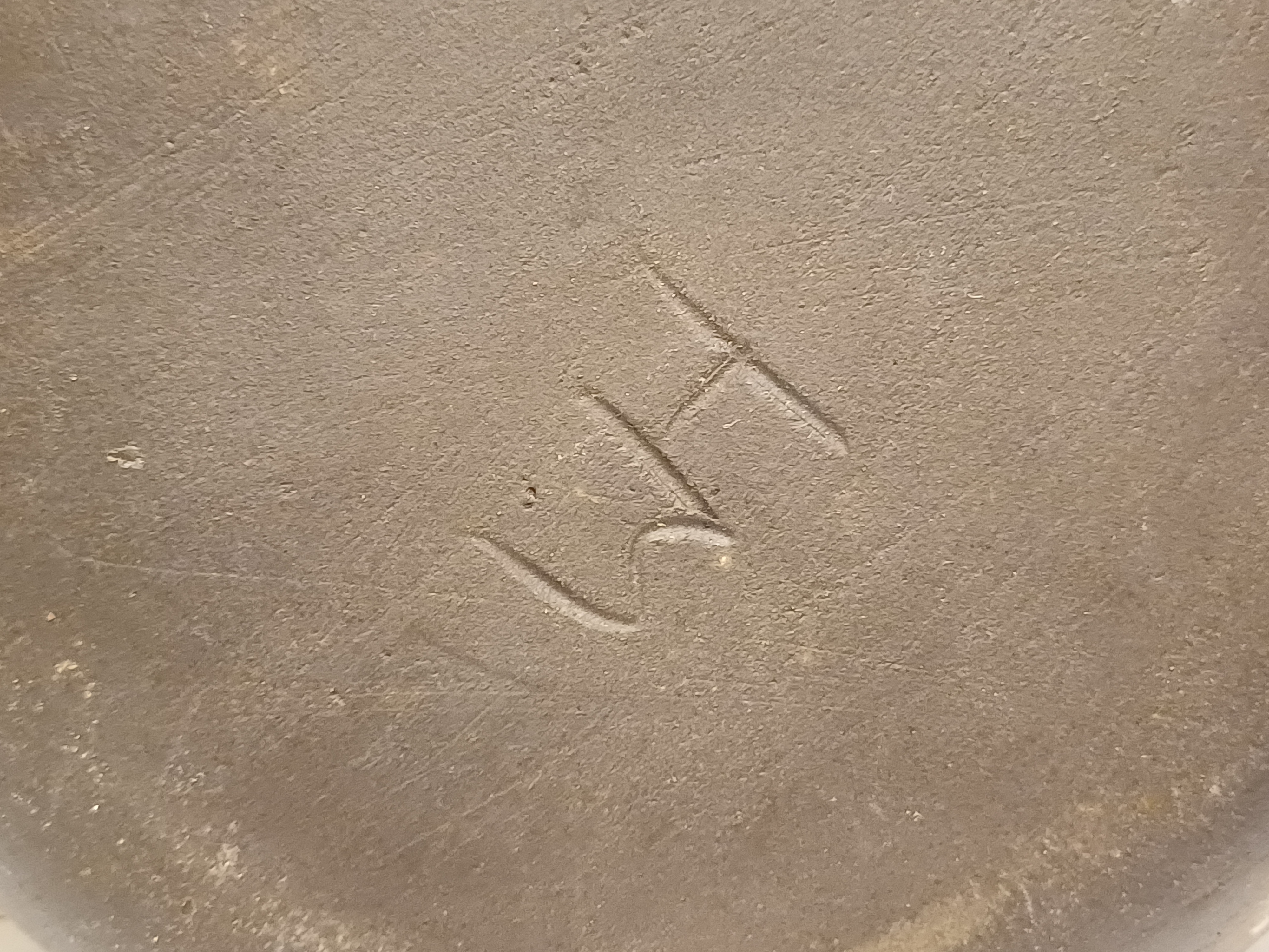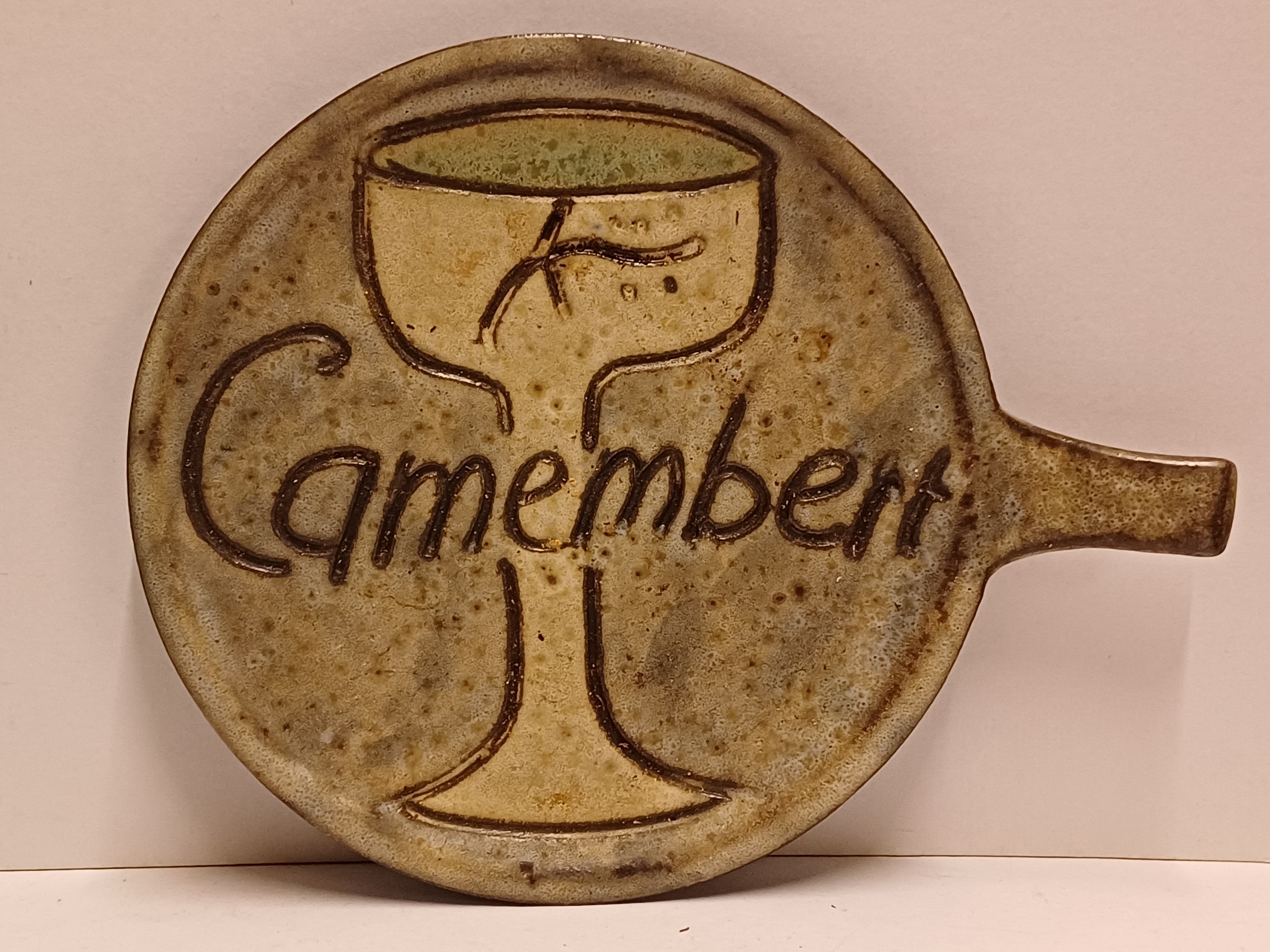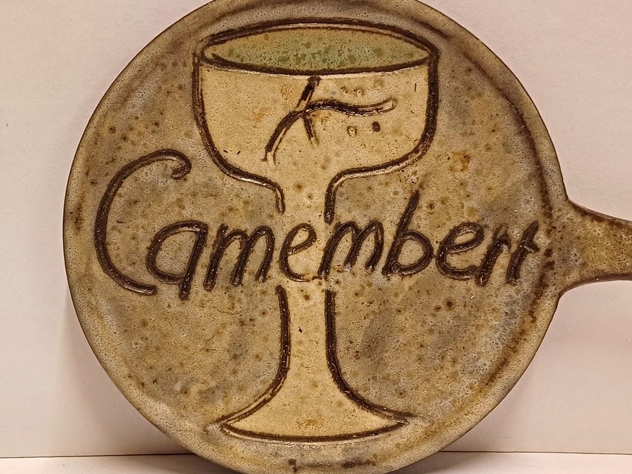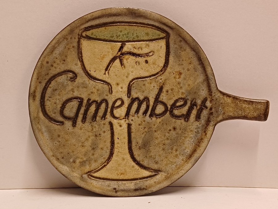 Aardewerken kaasplankje met de tekst Camembert. Achterzijde gesigneerd.