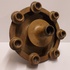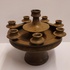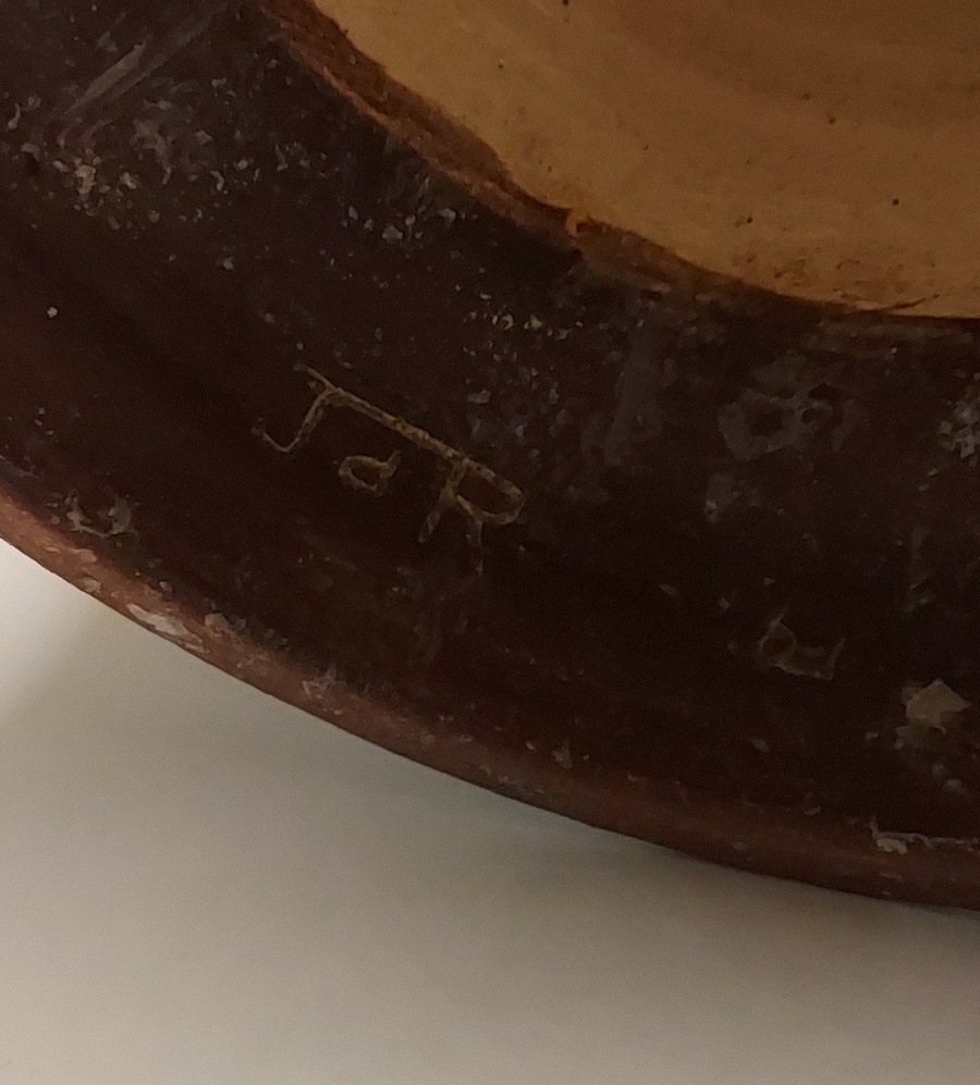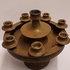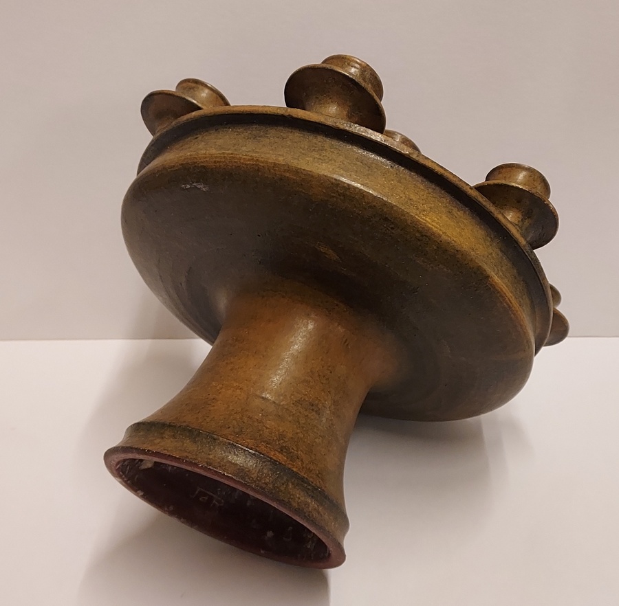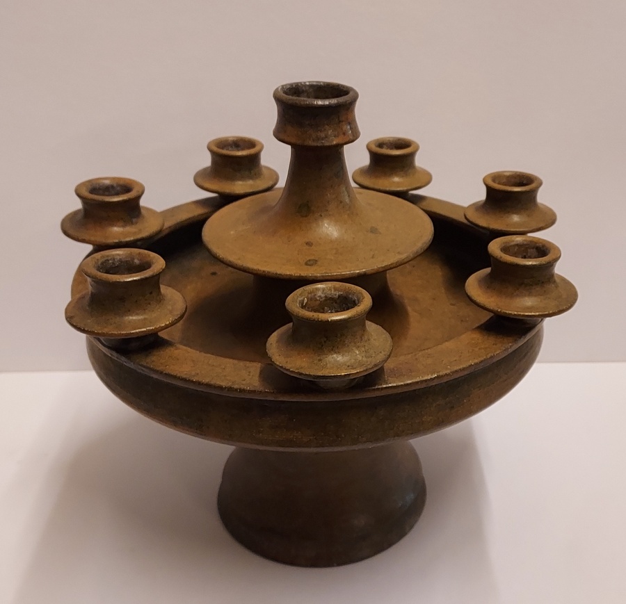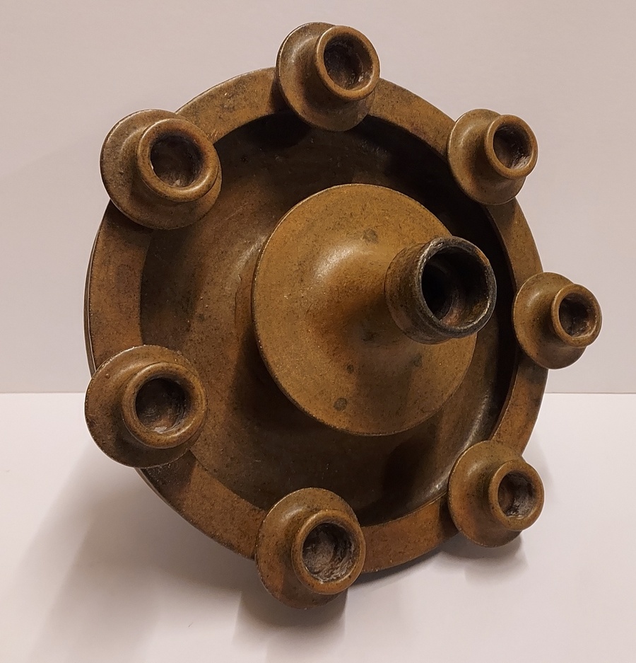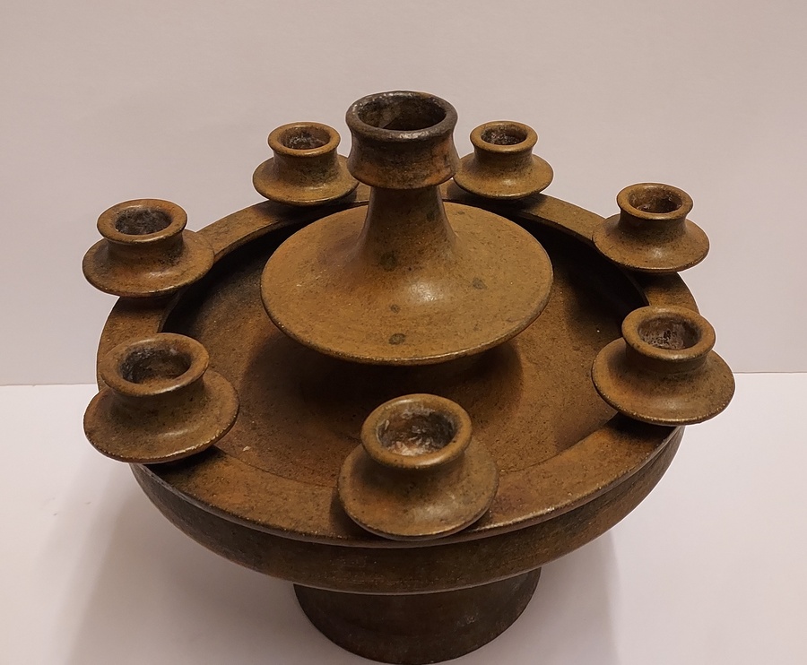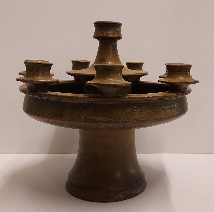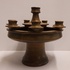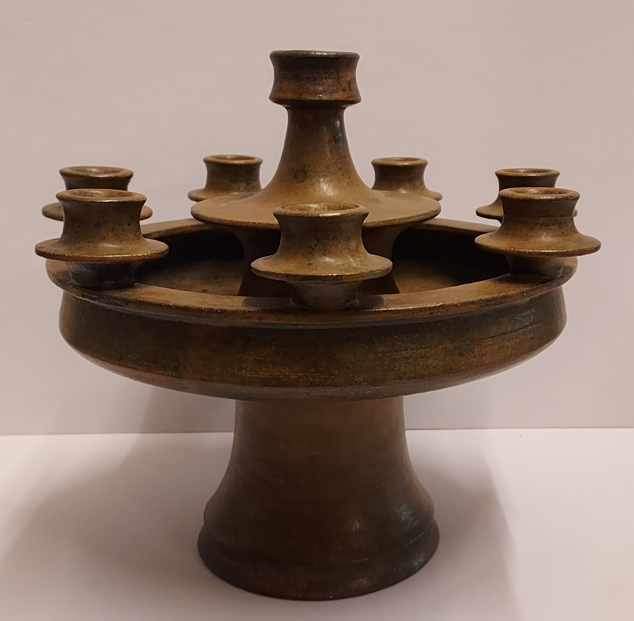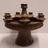 Grote 8 lichts kandelaar met donkerbruine glazuur. Binnenzijde voet gesigneerd JdR.